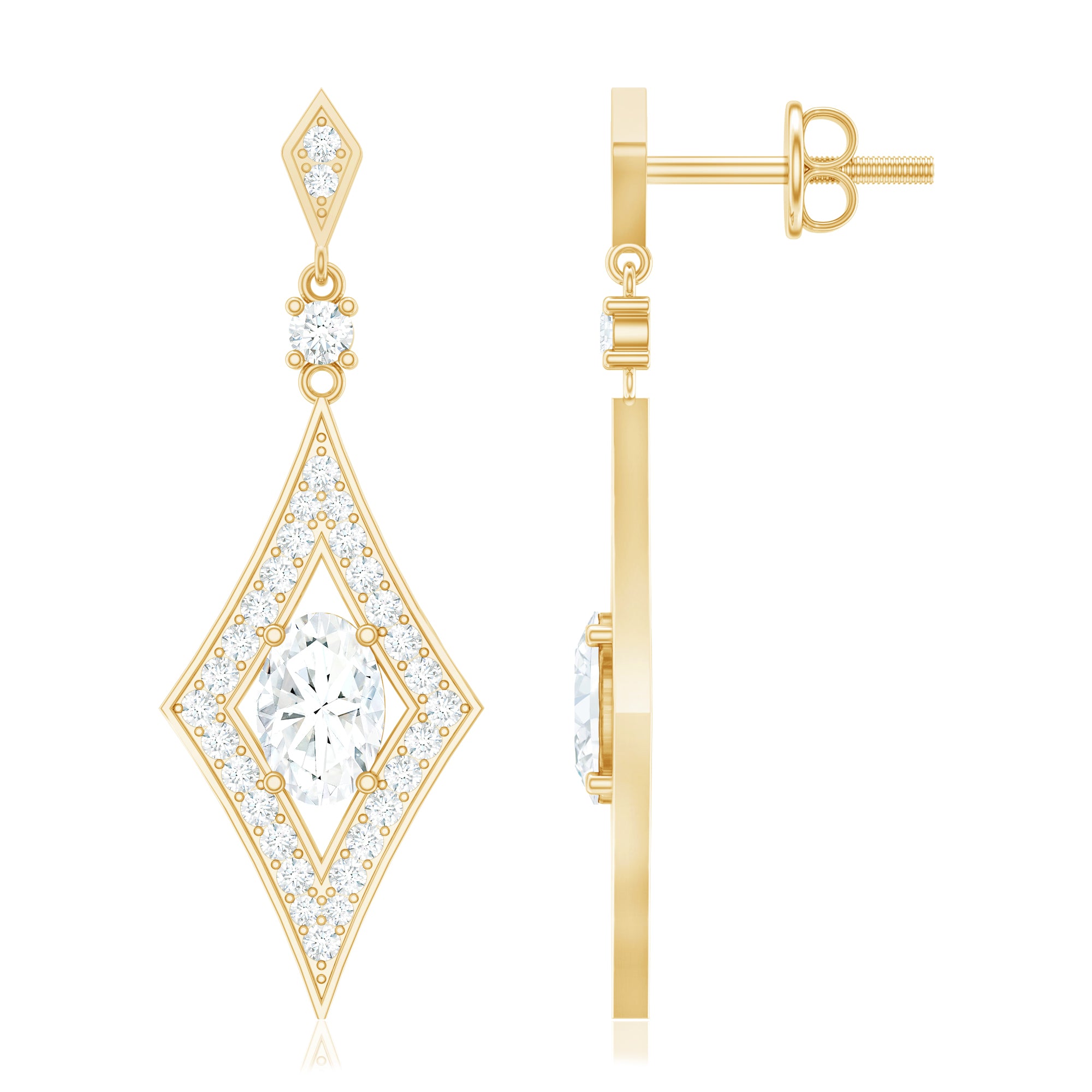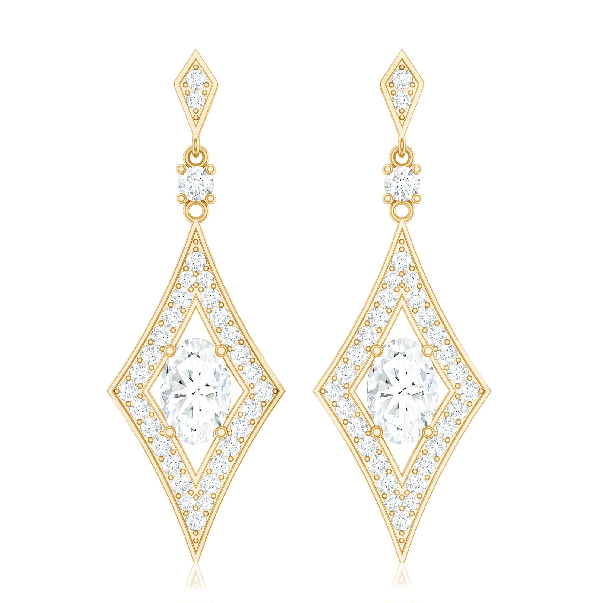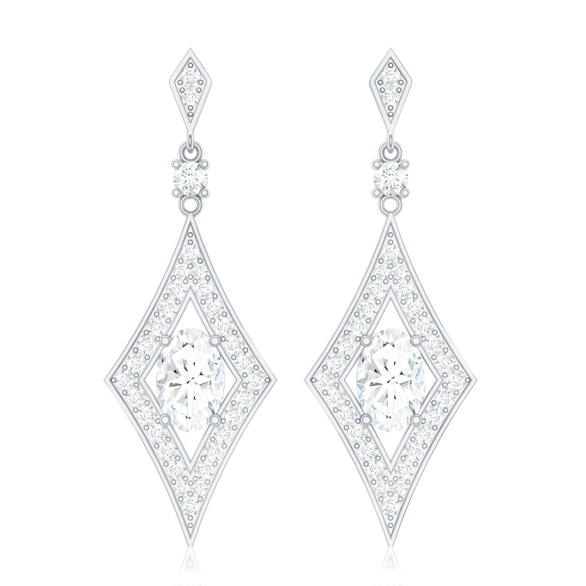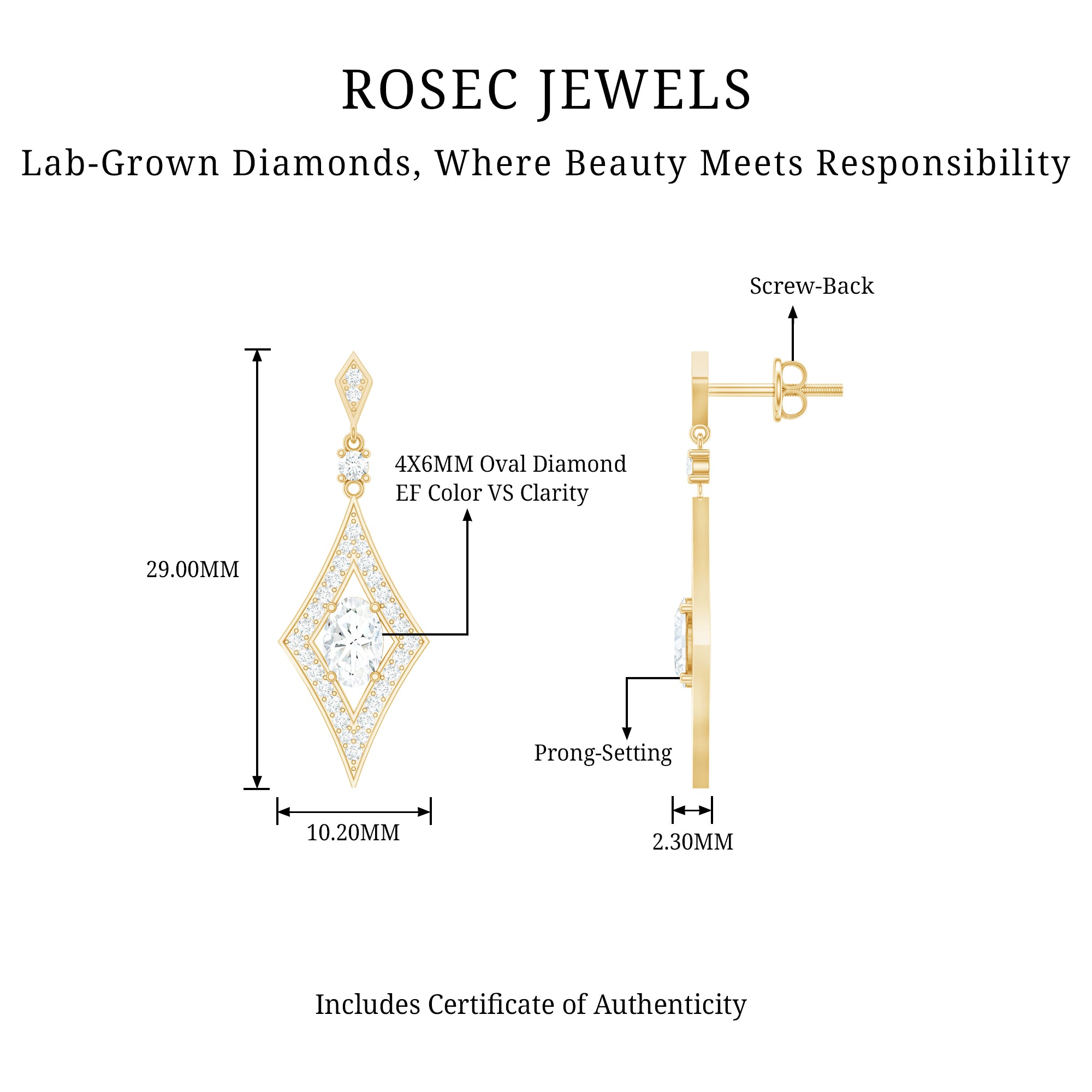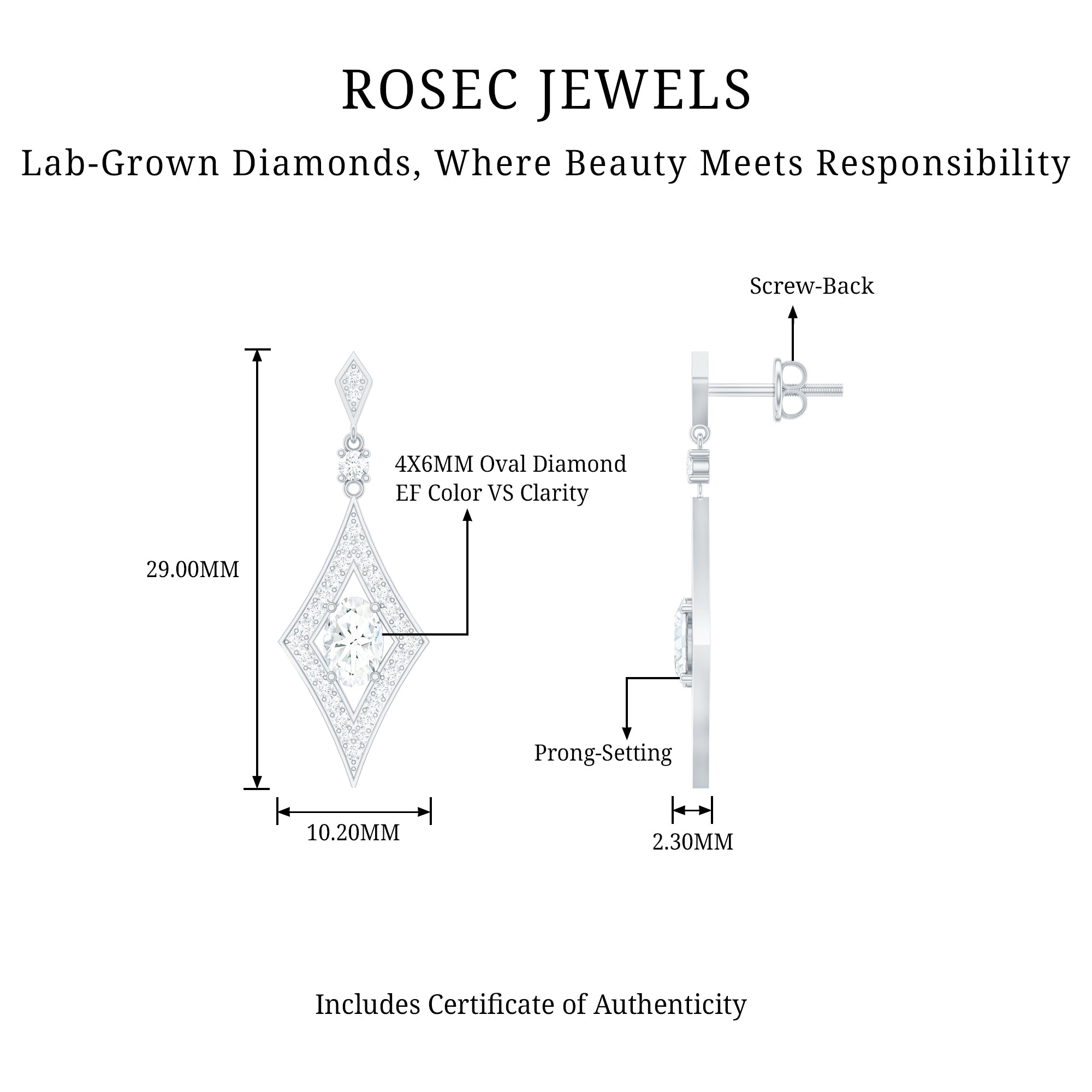 Elevate your style with these stunning Art Deco Inspired Dangle Earrings, featuring a 4X6 MM Oval Shape Diamond of EF-VS quality as the centerpiece, elegantly set in prong setting. Surrounding it are sparkling smaller diamonds arranged in a rhombus shape, adding a touch of brilliance. Designed with a secure screw back closure, these Diamond Earrings ensure both comfort and peace of mind, allowing you to wear them with confidence. Ideal for brides, they are an essential addition to your wedding jewelry collection. These Diamond Wedding Earrings reflect the exceptional quality and artistry that Rosec Jewels is known for, making each piece a true work of art.