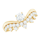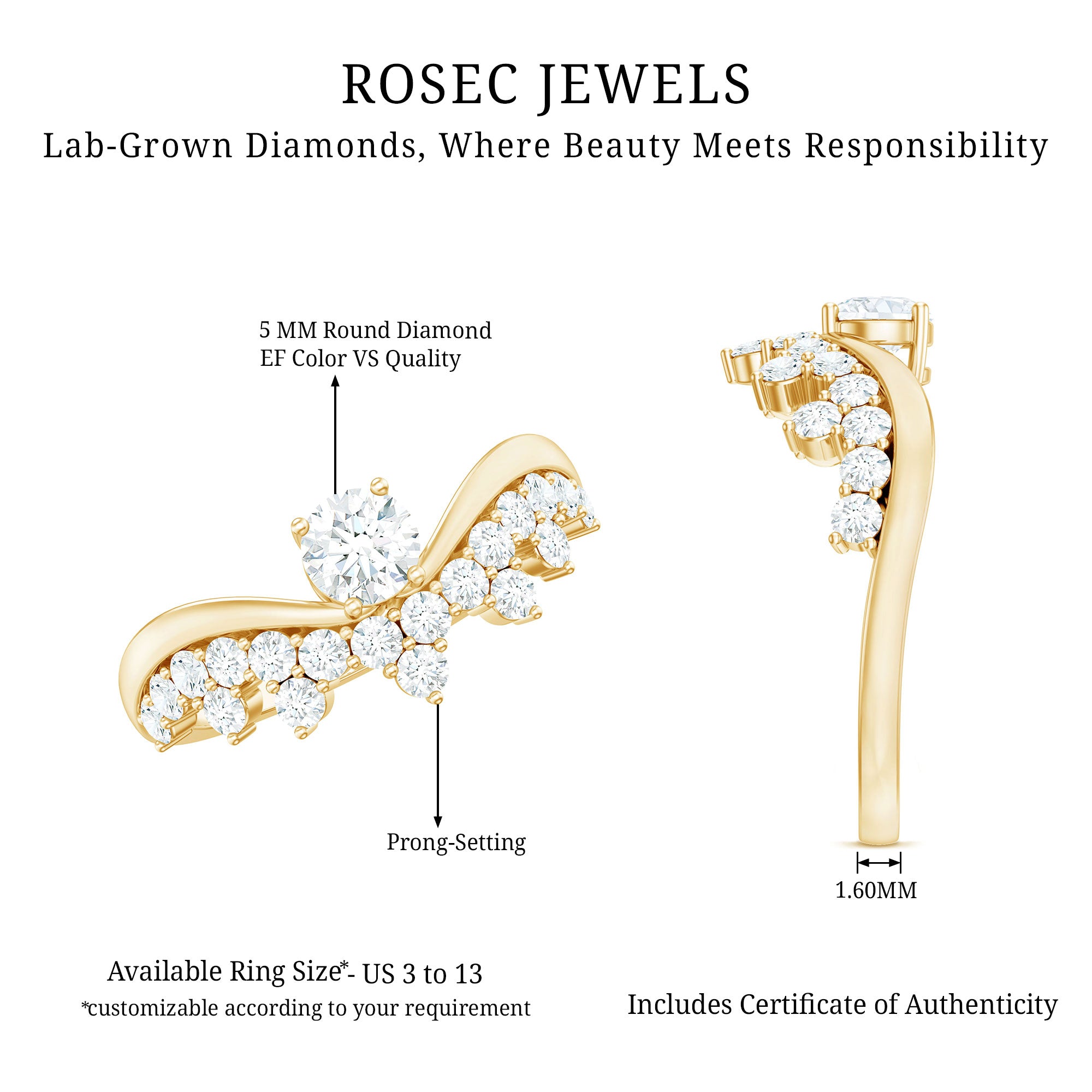 Designed by Rosec Jewels, this Unique Engagement Ring features a perfect arc of diamonds, symbolizing how true love beautifully bends but never breaks. It has a sophisticated and elegant design with a 5 mm round cut lab grown diamond of EF-VS quality set in the center in a secure prong setting. The band gracefully curves into a V-shape, decorated with dainty diamond stones. This Designer Diamond Engagement Ring perfectly balances modern minimalism with classic charm, making it an ideal choice for those who seek a unique yet timeless piece. Whether worn as a standalone statement or paired with other bands this Curved Ring embodies love, grace, and brilliance.