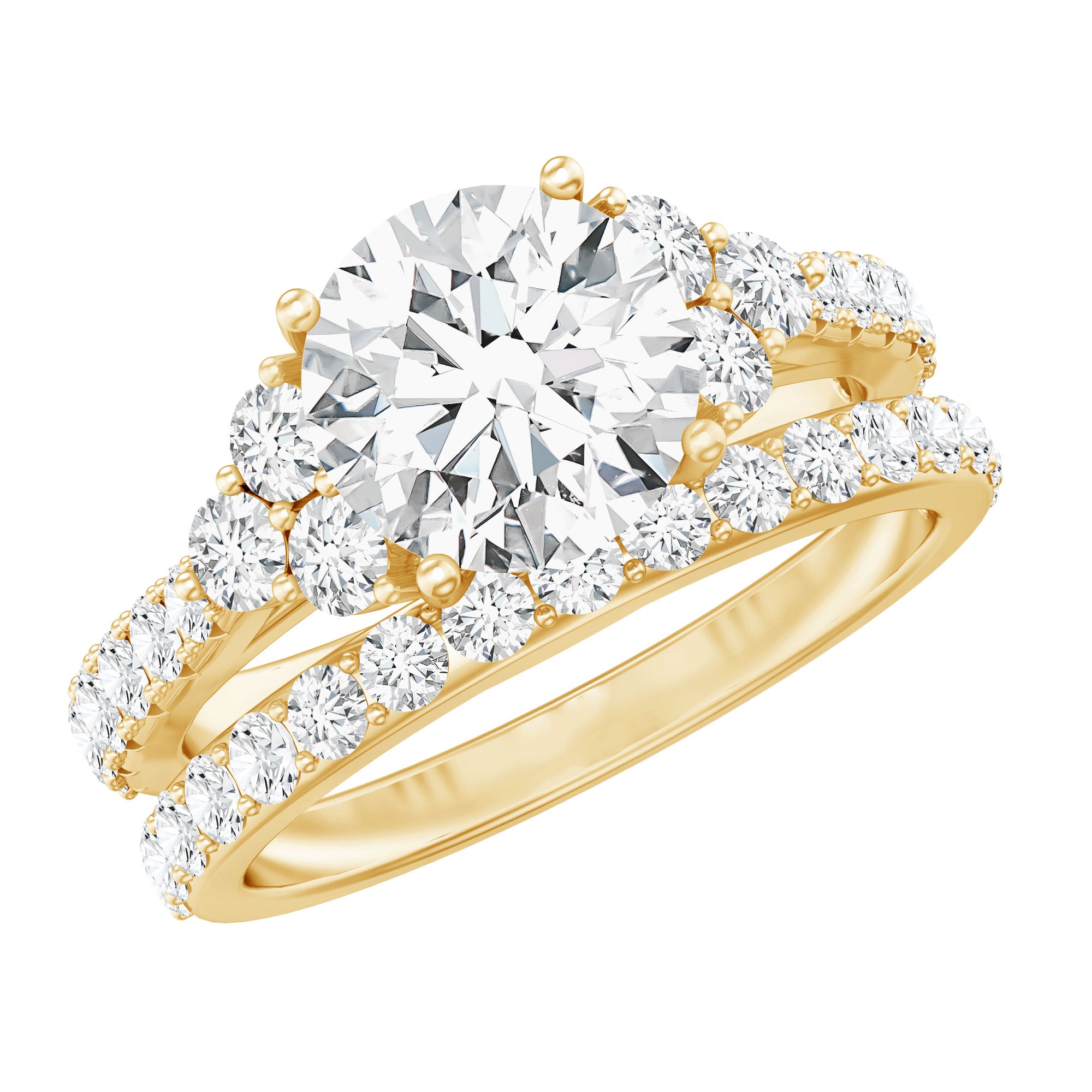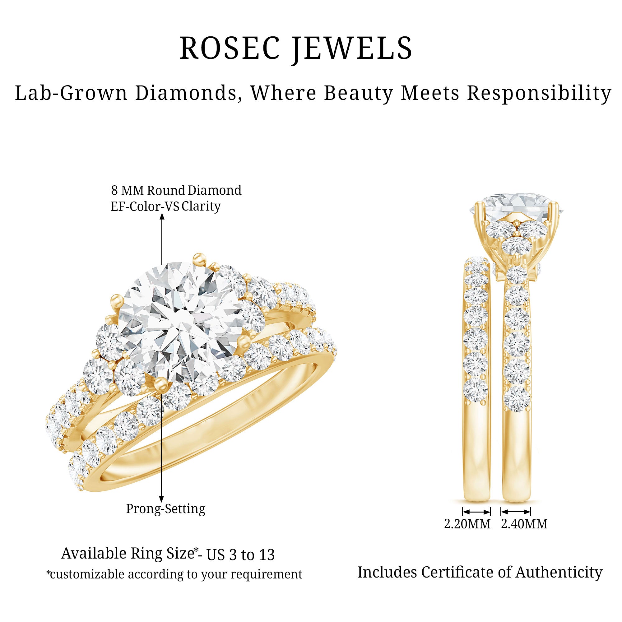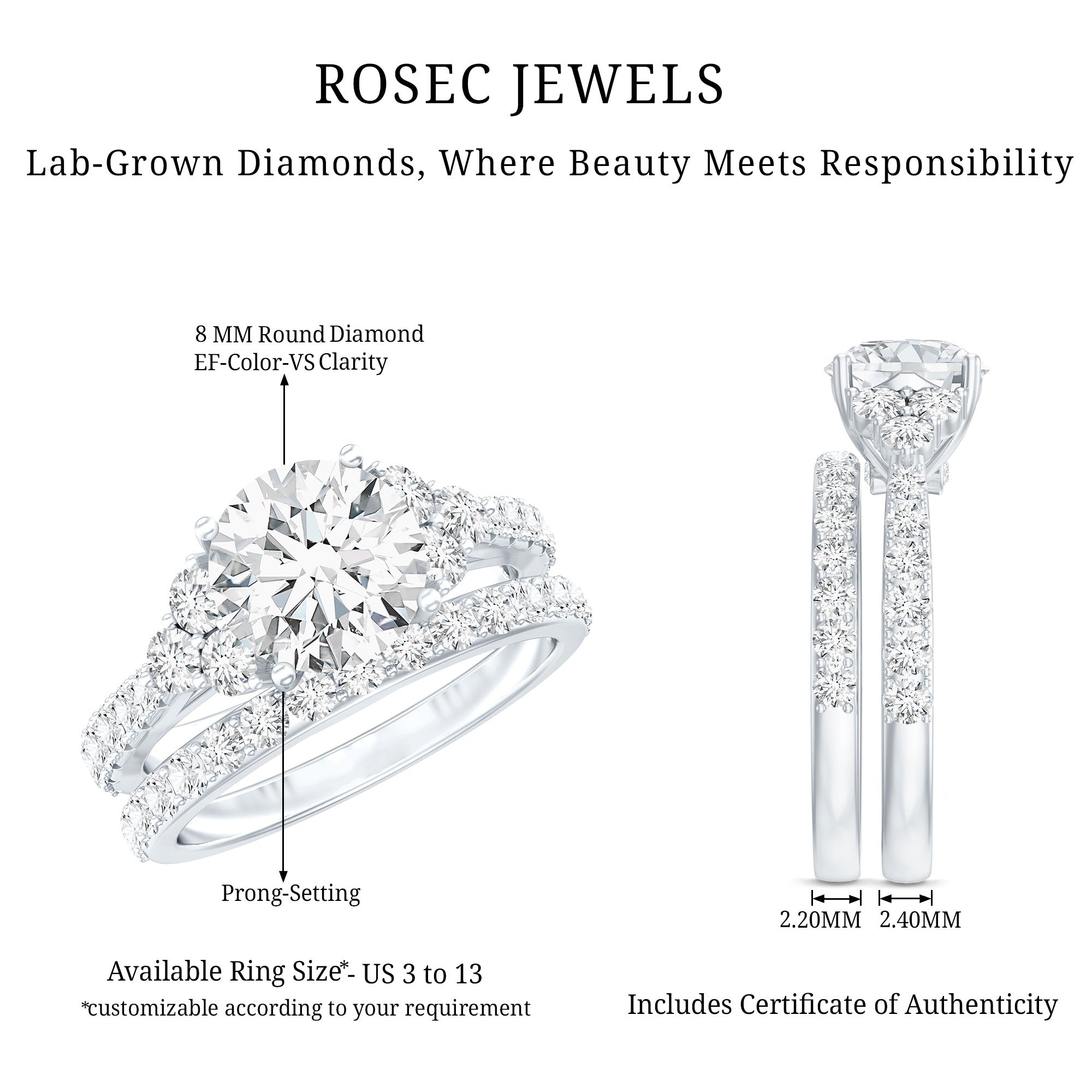 Elevate the charm of your big day with this Lab Grown Diamond Ring Set, a true tribute to love and lasting devotion. The 8 MM round lab grown diamond in prong setting sparkles brilliantly at the center, flanked by a trio of smaller diamonds on each side. To enhance the engagement ring further, there are round diamonds as side stones that beautifully complement its design. The wedding band makes a bold statement, adorned with round brilliant cut lab diamonds in a half eternity style. This Engagement Ring with Wedding Band is a perfect pick for celebrating any occasion joyfully. With its dazzling appearance, this Ring Set features EF color and VS clarity lab grown diamonds that shine even brighter. Win her heart with this stunning Marriage Ring Set that will elevate her fashion game. Redefine classic beauty while showcasing timeless elegance with this Engagement Ring Set, made from high-quality metal, a striking piece of jewelry that vividly expresses glitz and glamor.