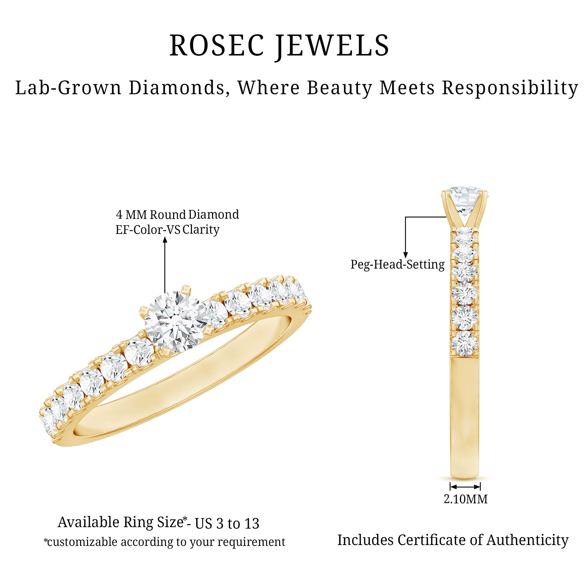 If perfection had a form, it would look exactly like this Rosec Jewels Round Diamond Ring. This stunning Side Stone Engagement Ring features a 4 mm round-cut EF-VS quality diamond (lab grown) at its heart, securely held in a peg head setting, ensuring its beauty takes center stage. On either side of the center stone, round cut diamond side stones add a touch of sophistication and sparkle. Perfect for celebrating milestones or expressing timeless love, this Solitaire Diamond Engagement Ring is an extraordinary symbol of beauty, making it an unforgettable piece of jewelry that she will cherish forever.