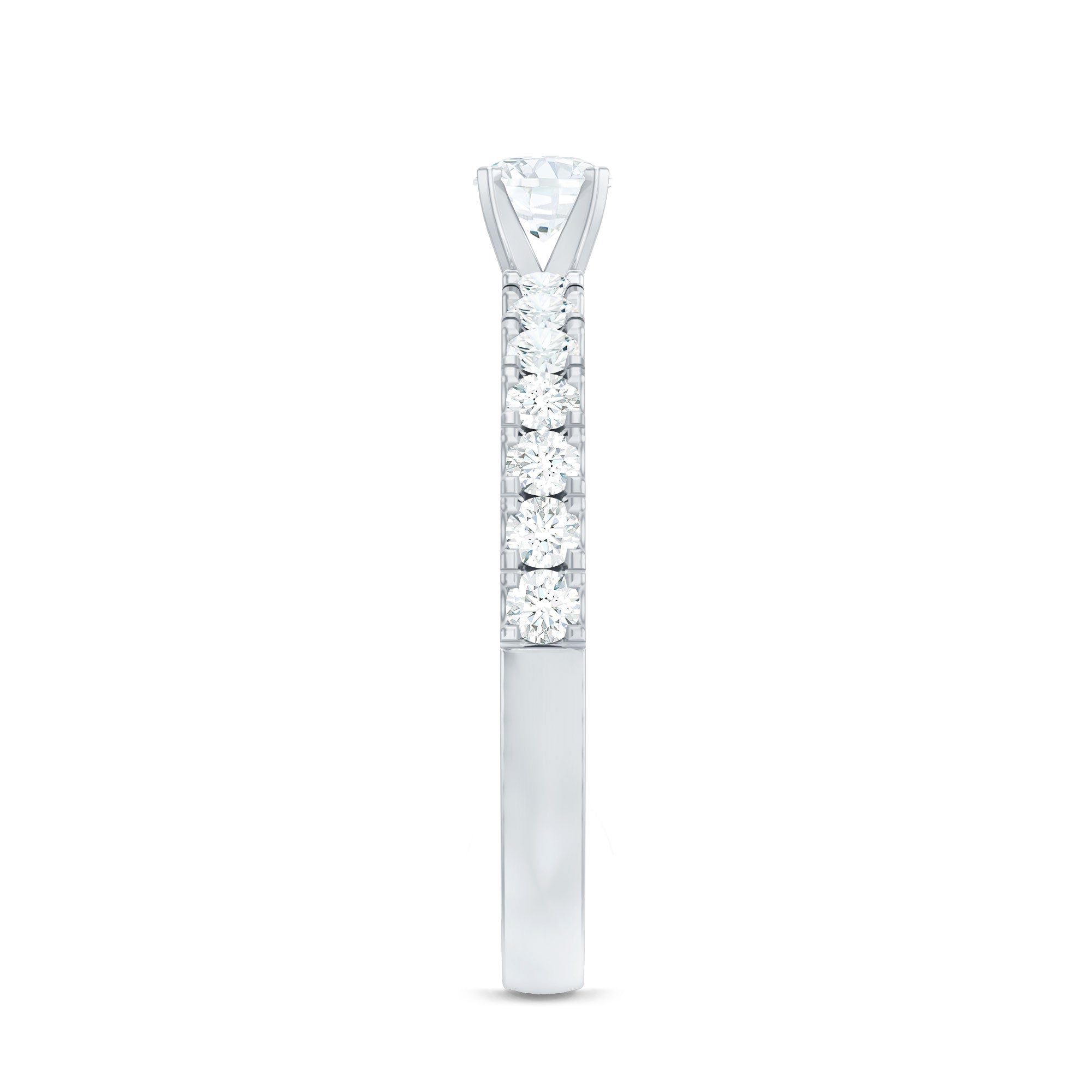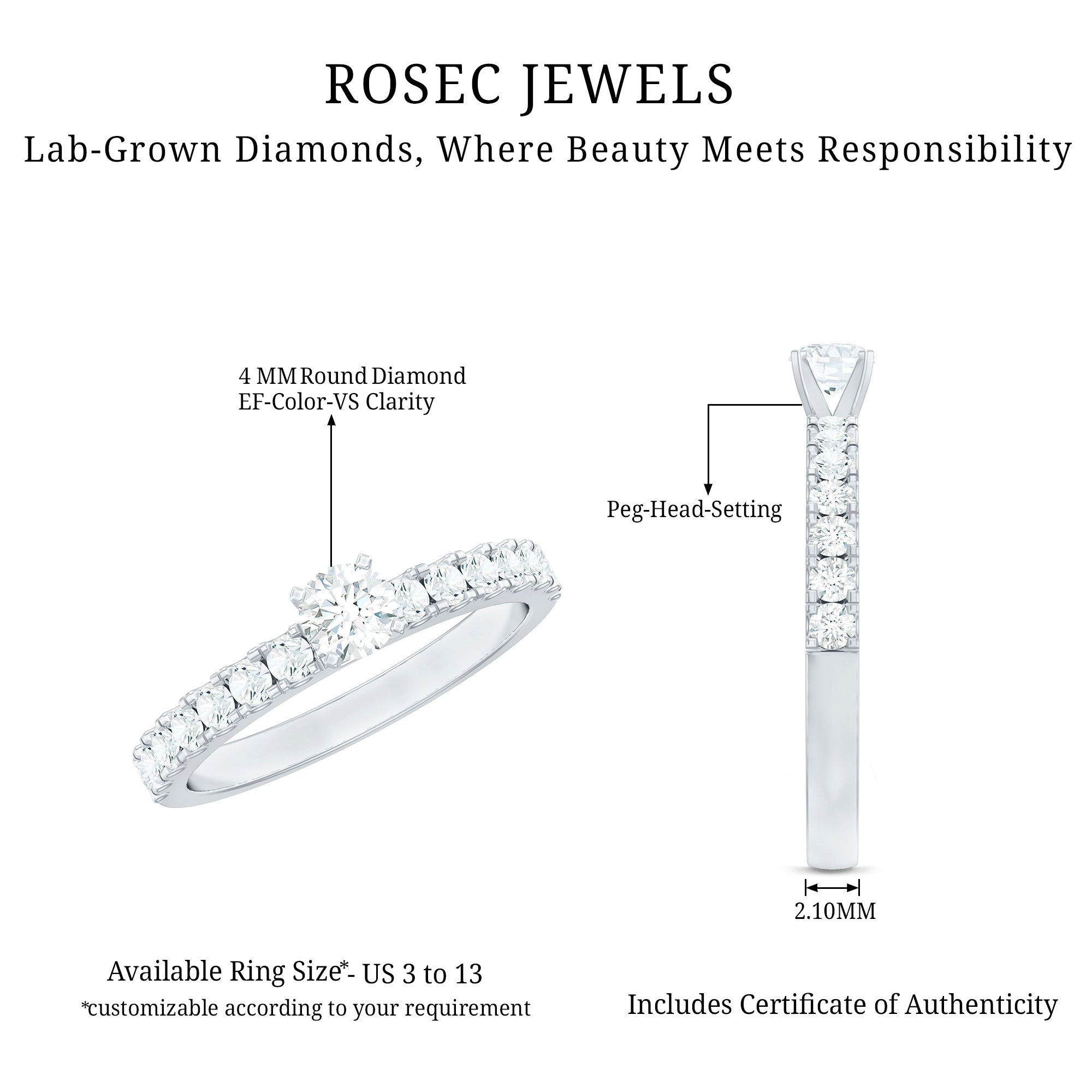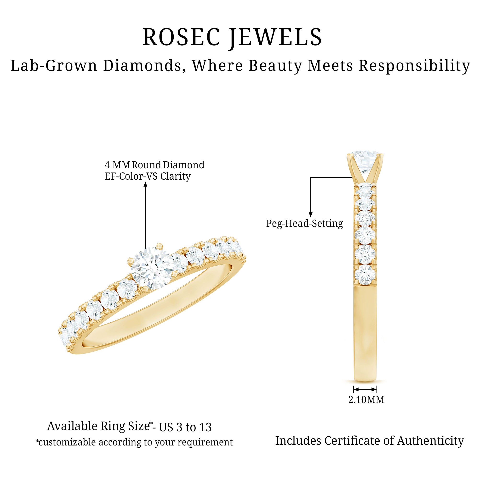 If perfection had a form, it would look exactly like this Rosec Jewels Round Diamond Ring. This stunning Side Stone Engagement Ring features a 4 mm round-cut EF-VS quality diamond (lab grown) at its heart, securely held in a peg head setting, ensuring its beauty takes center stage. On either side of the center stone, round cut diamond side stones add a touch of sophistication and sparkle. Perfect for celebrating milestones or expressing timeless love, this Solitaire Diamond Engagement Ring is an extraordinary symbol of beauty, making it an unforgettable piece of jewelry that she will cherish forever.