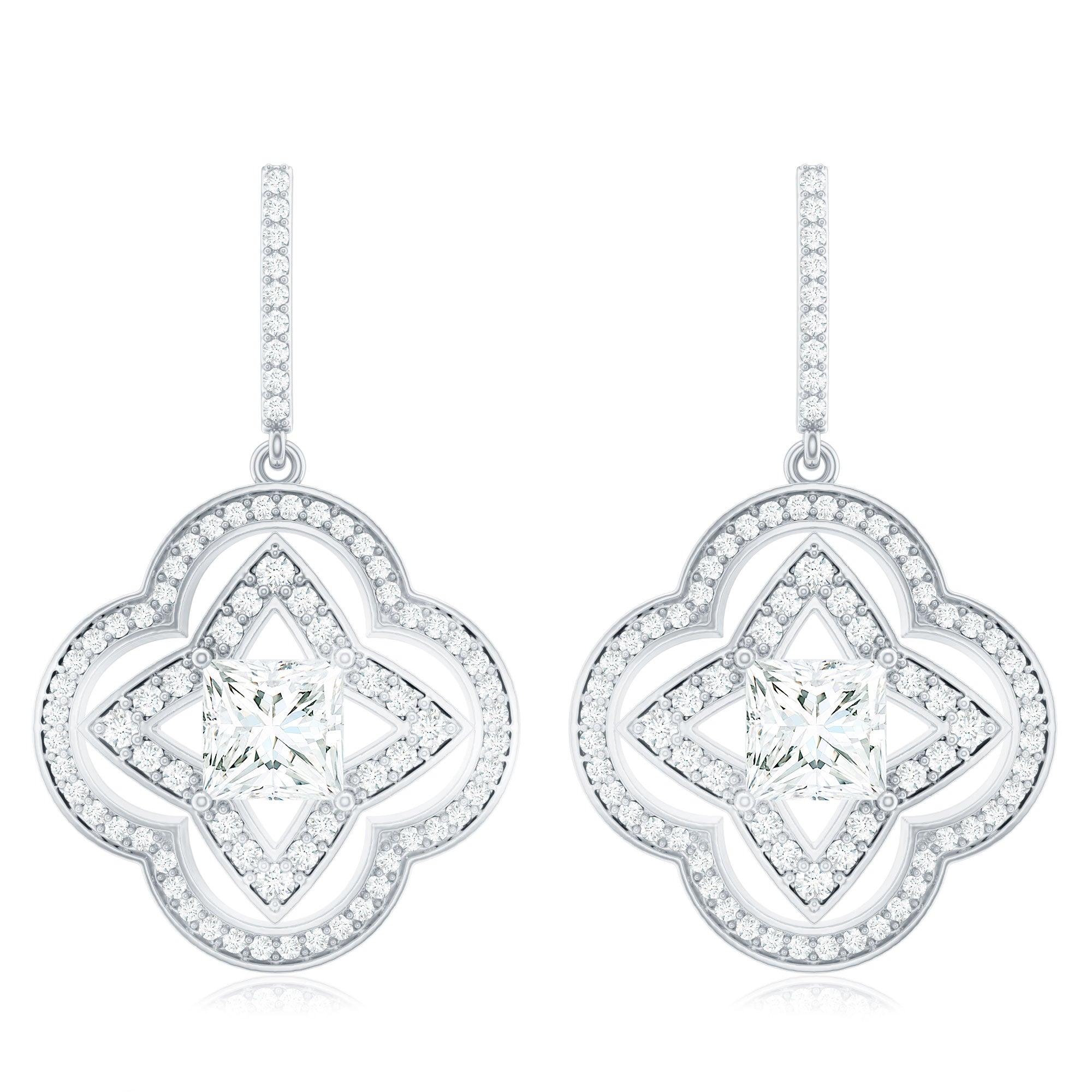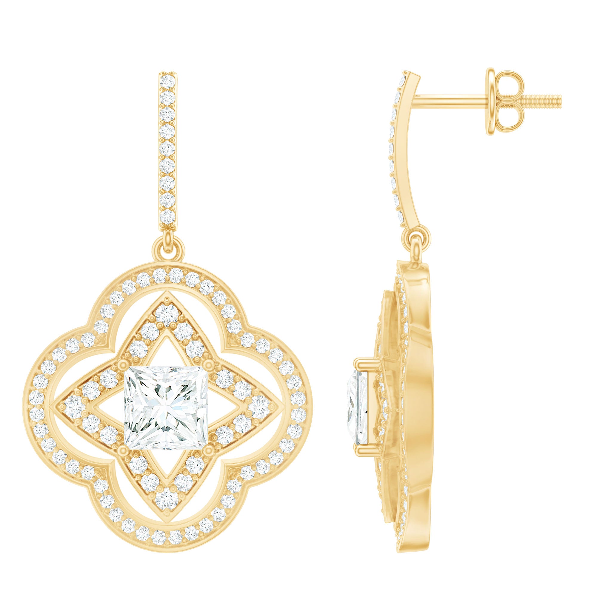 Adorn your ears with the ethereal beauty of these Floral Drop Earrings, adorned with sparkling 5 mm Princess cut diamond set in a secure prong setting in the center and surrounded with round shape Diamonds in a flower pattern. The Screw Back Closure ensures a secure and comfortable fit, perfect for any occasion. Embrace elegance with these Diamond Drop Earrings (Synthetic) that seamlessly blend sophistication and natures beauty. Crafted with an ethically sourced, eco-friendly Ef-Vs quality lab grown diamond and comes with a certificate of authenticity, its a thoughtful and budget friendly choice for an Anniversary gift or any meaningful occasion.
