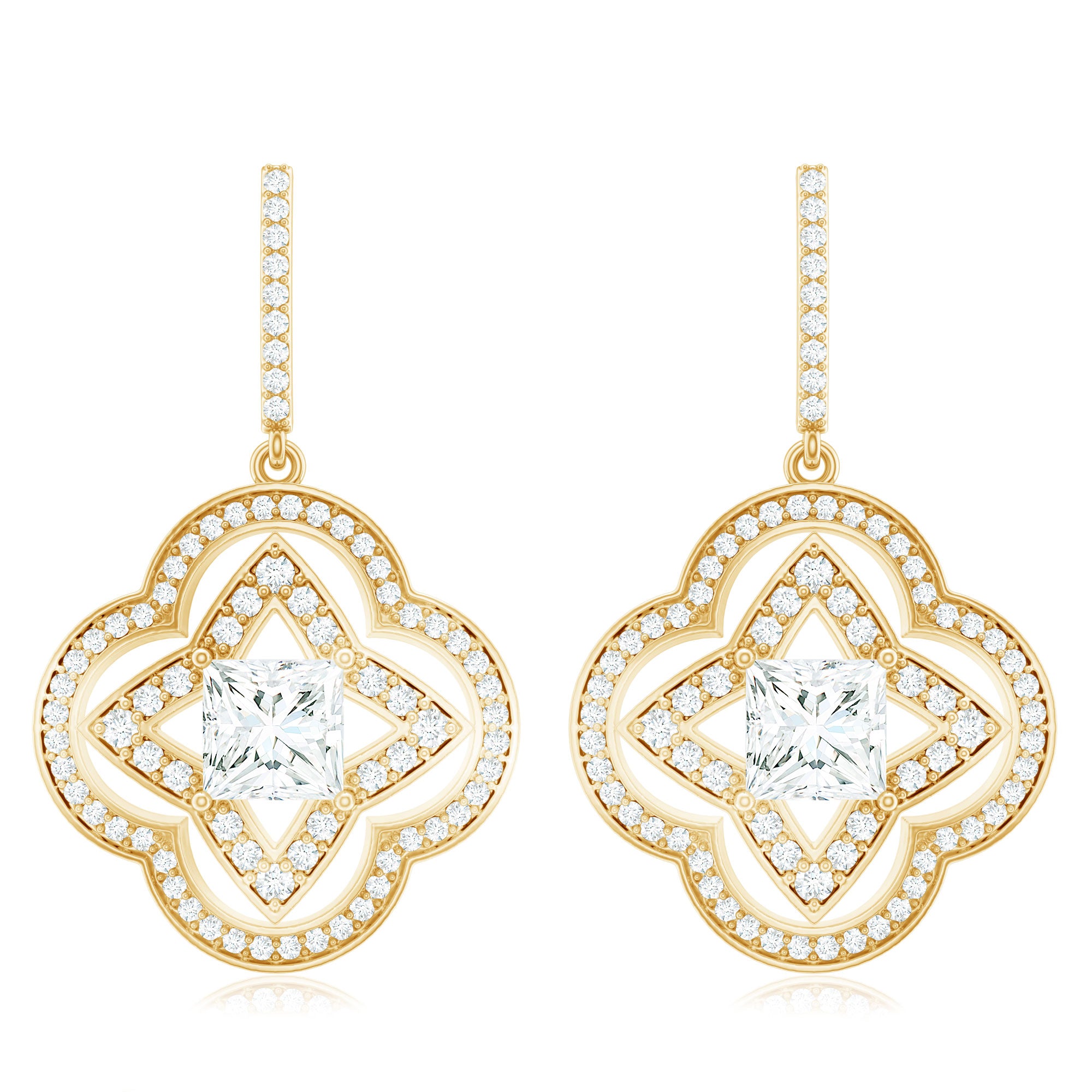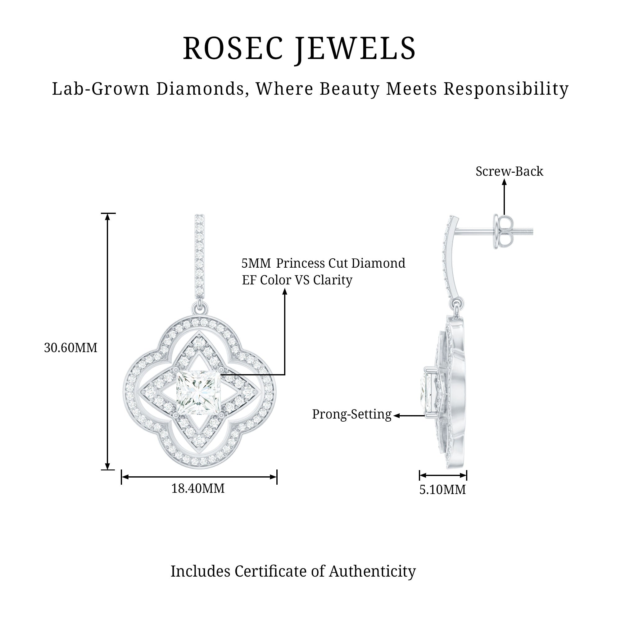 Adorn your ears with the ethereal beauty of these Floral Drop Earrings, adorned with sparkling 5 mm Princess cut diamond set in a secure prong setting in the center and surrounded with round shape Diamonds in a flower pattern. The Screw Back Closure ensures a secure and comfortable fit, perfect for any occasion. Embrace elegance with these Diamond Drop Earrings (Synthetic) that seamlessly blend sophistication and natures beauty. Crafted with an ethically sourced, eco-friendly Ef-Vs quality lab grown diamond and comes with a certificate of authenticity, its a thoughtful and budget friendly choice for an Anniversary gift or any meaningful occasion.