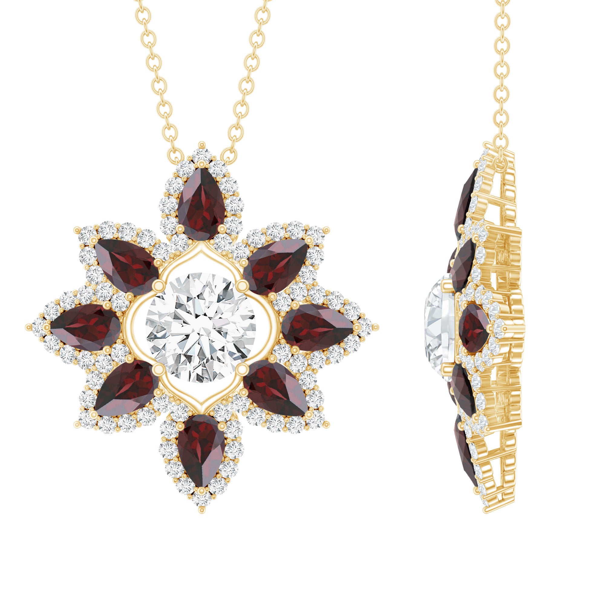 With the inspiration of nature, this Flower Diamond Necklace will surely amaze everyone. It features a 7 MM Round Shape Lab Grown Diamond set in Prong Setting as a center stone and delicately placed in a metal frame. The centerpiece is surrounded by 3X5 MM Pear Shaped Garnet petals, each surrounded by synthetic diamond halos. A perfect gift for a loved one or a well-deserved treat for yourself, this Floral Statement Necklace is a timeless treasure that will never go out of style. This Diamond and Garnet Necklace also includes a certificate of guarantee for Quality assurance and comes packaged in a chic, protective box, ideal for gifting or safe storage when not in use.