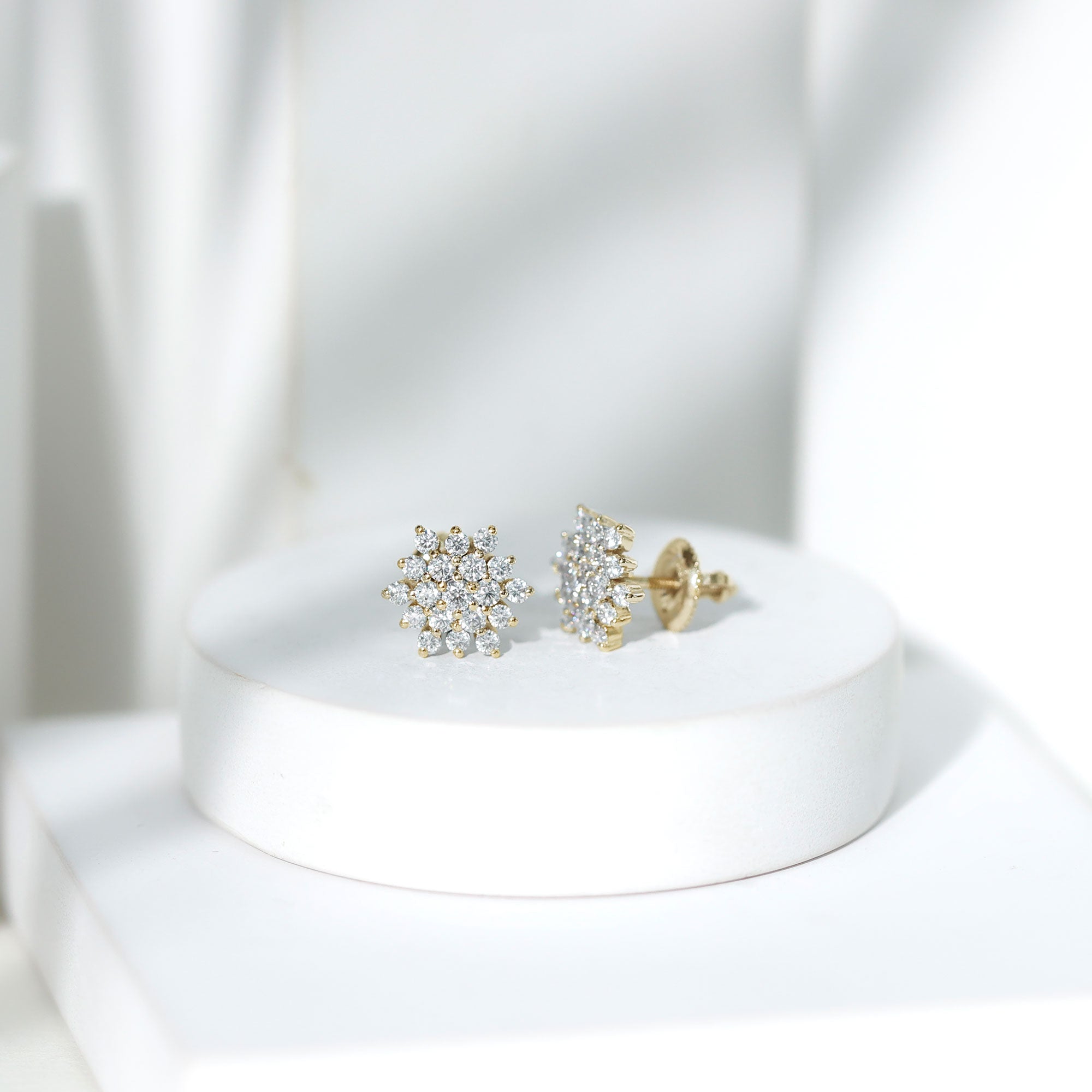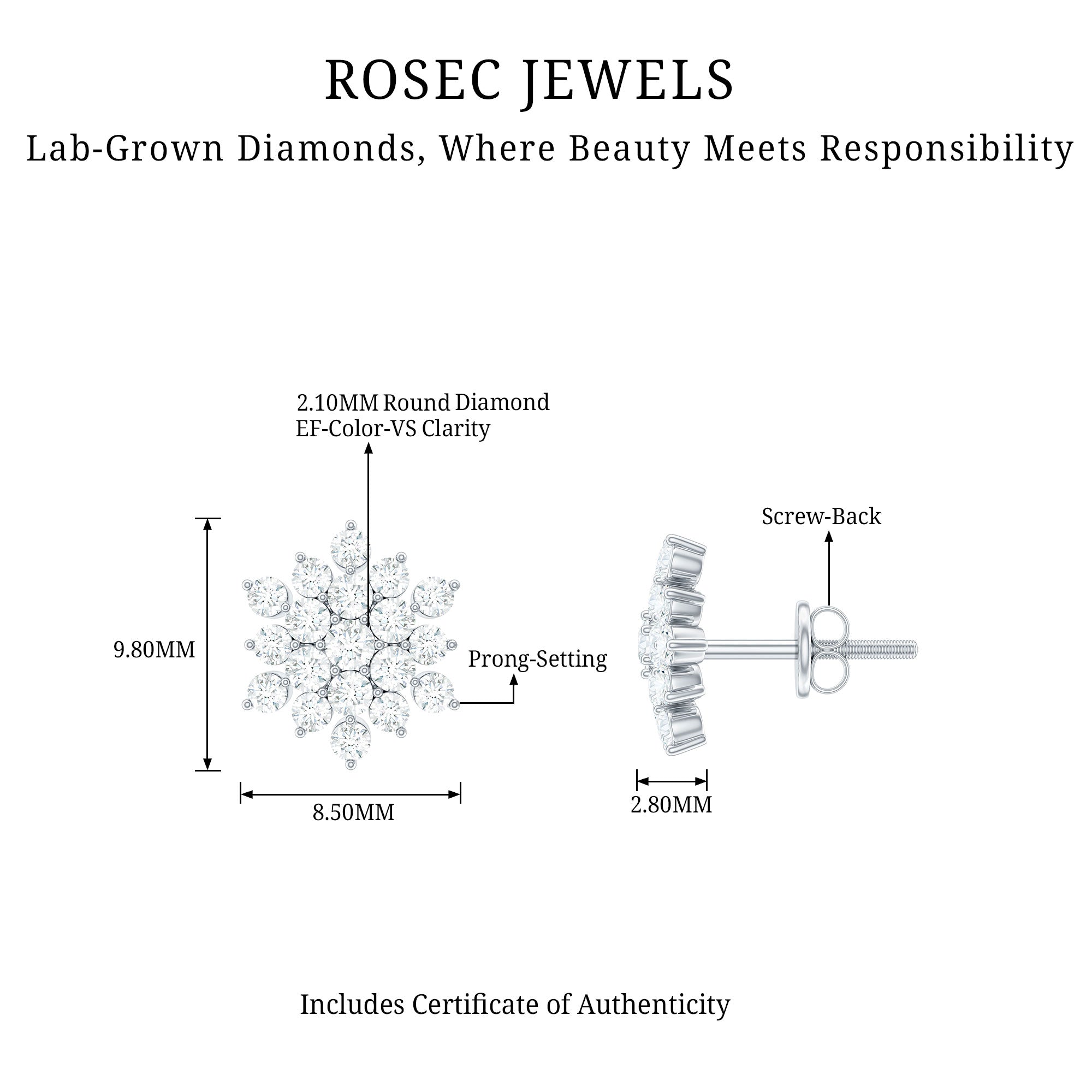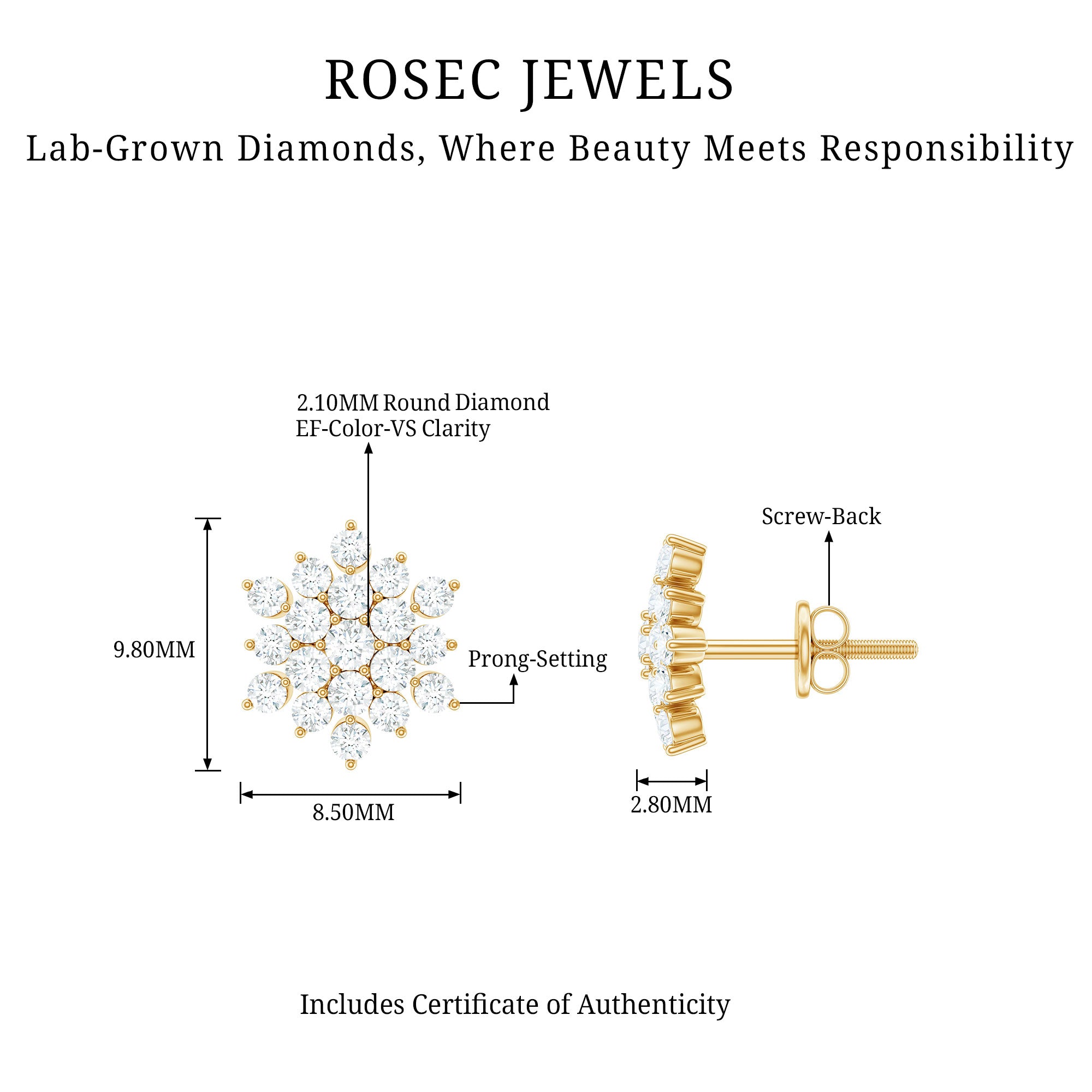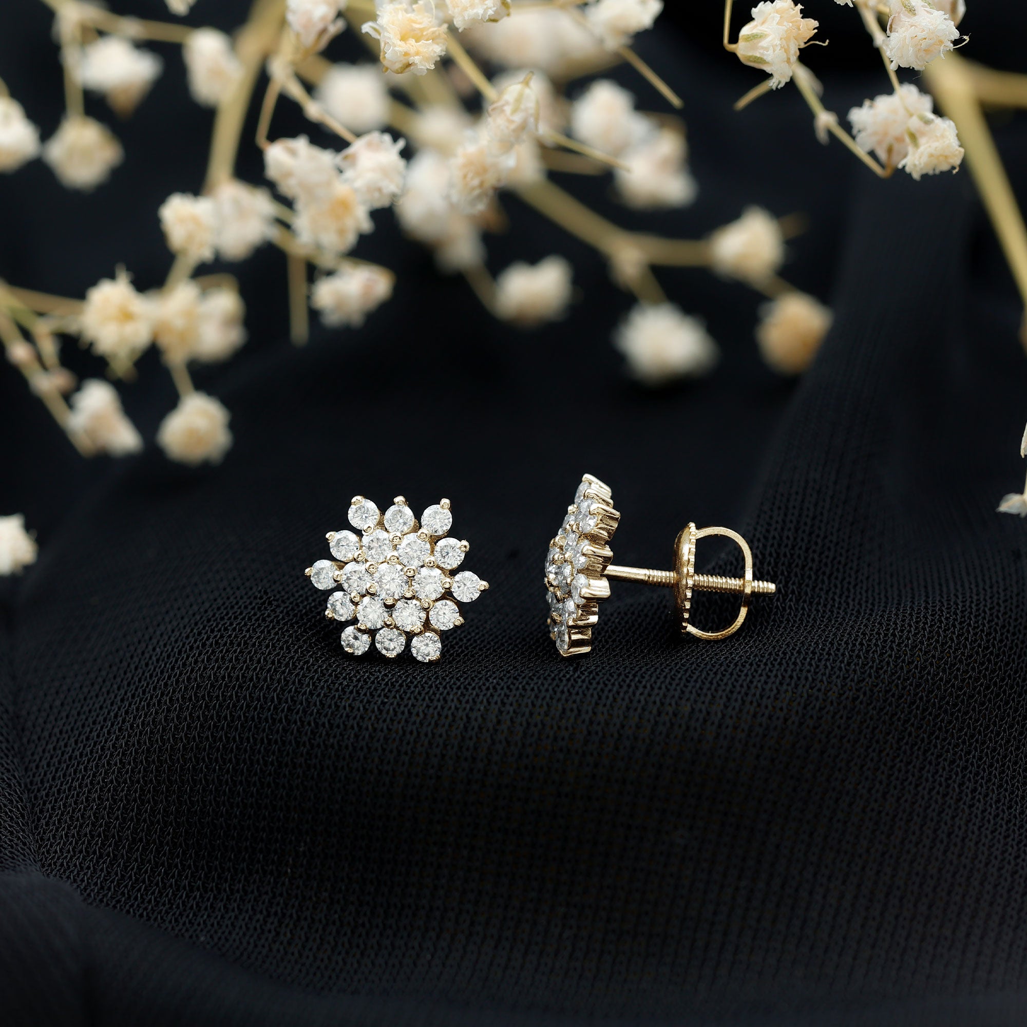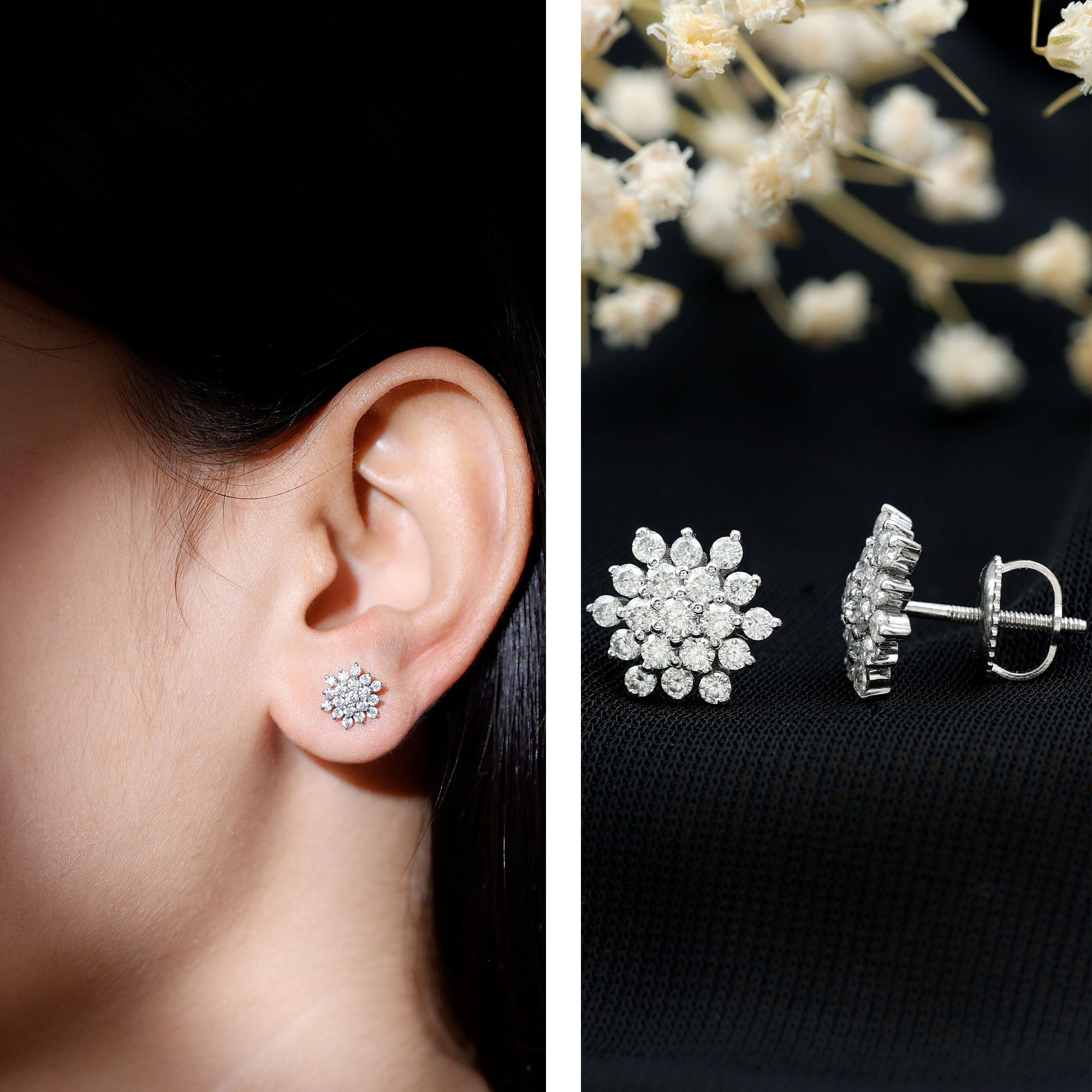 With a hint of luxury, these Diamond Cluster Studs are perfect for your lady. These earrings are handcrafted with Round Shape Lab Grown Diamonds securely placed in the prong setting forming a sparkling floral cluster. These Statement Diamond Earrings will perfectly shine with the sparkles of EF-VS Quality Lab Grown Diamonds. Get these Diamond Flower Earrings by Rosec Jewels that are the perfect to make celebration special with her.