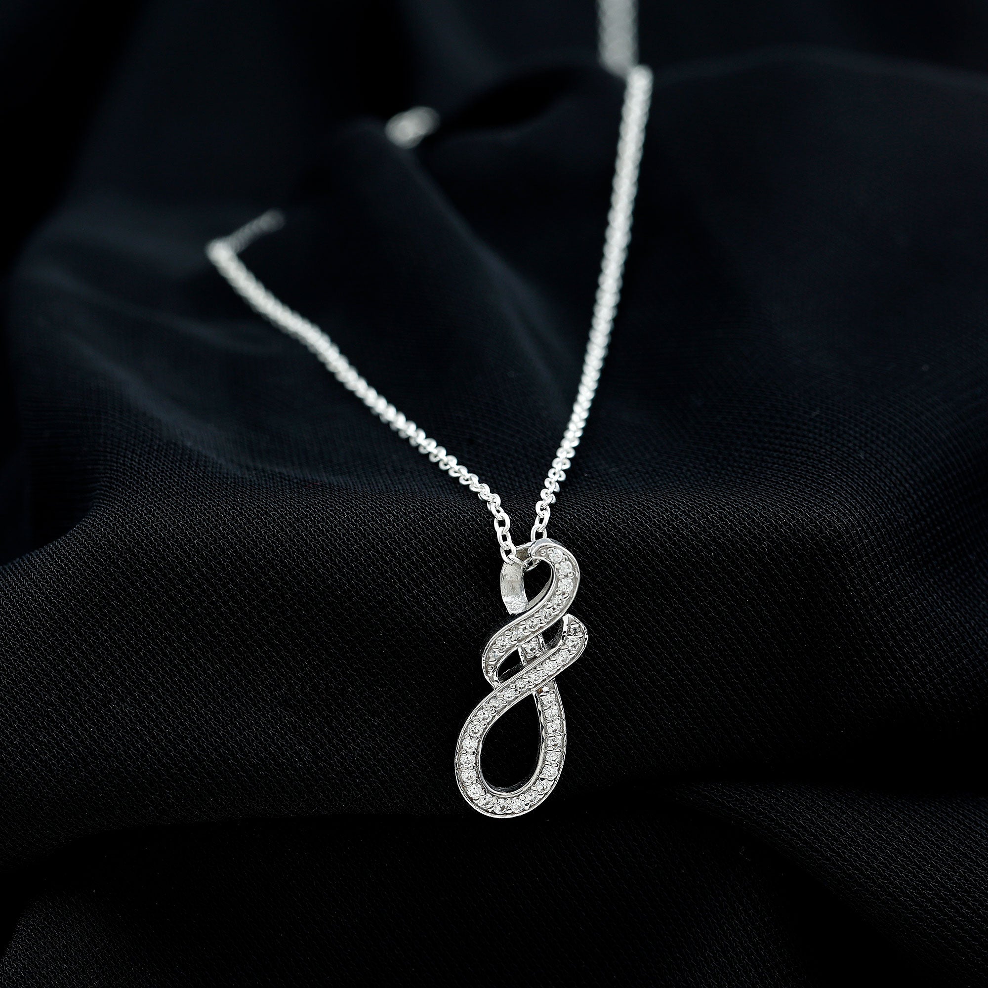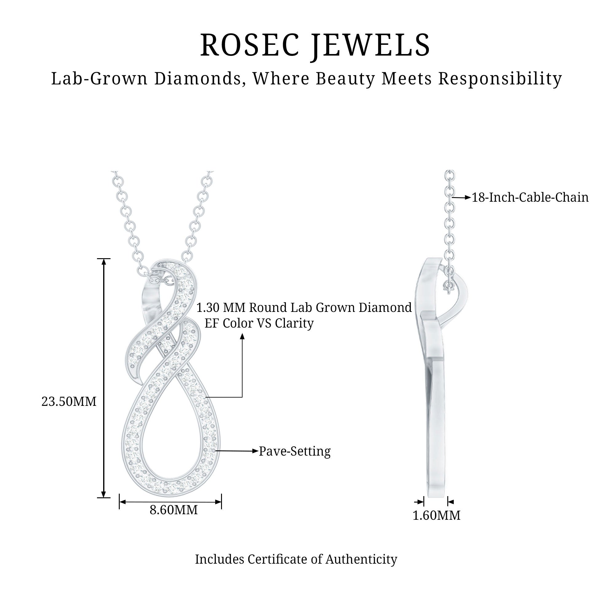 Make her feel special with this breathtaking Infinity Diamond Necklace representing everlasting love. This Infinity Knot Necklace from Rosec Jewels is handcrafted with EF-VS Quality Pave Set Diamonds of round shape embedded in high-quality metal. This hidden bail gives this Lab Grown Diamond Pendant a floating effect without any distraction. This Infinity Symbol Necklace is perfect to be presented as the symbol of love to your special one and will be delivered in the Premium Quality Gift Box with the certificate of gemstone authenticity.