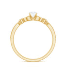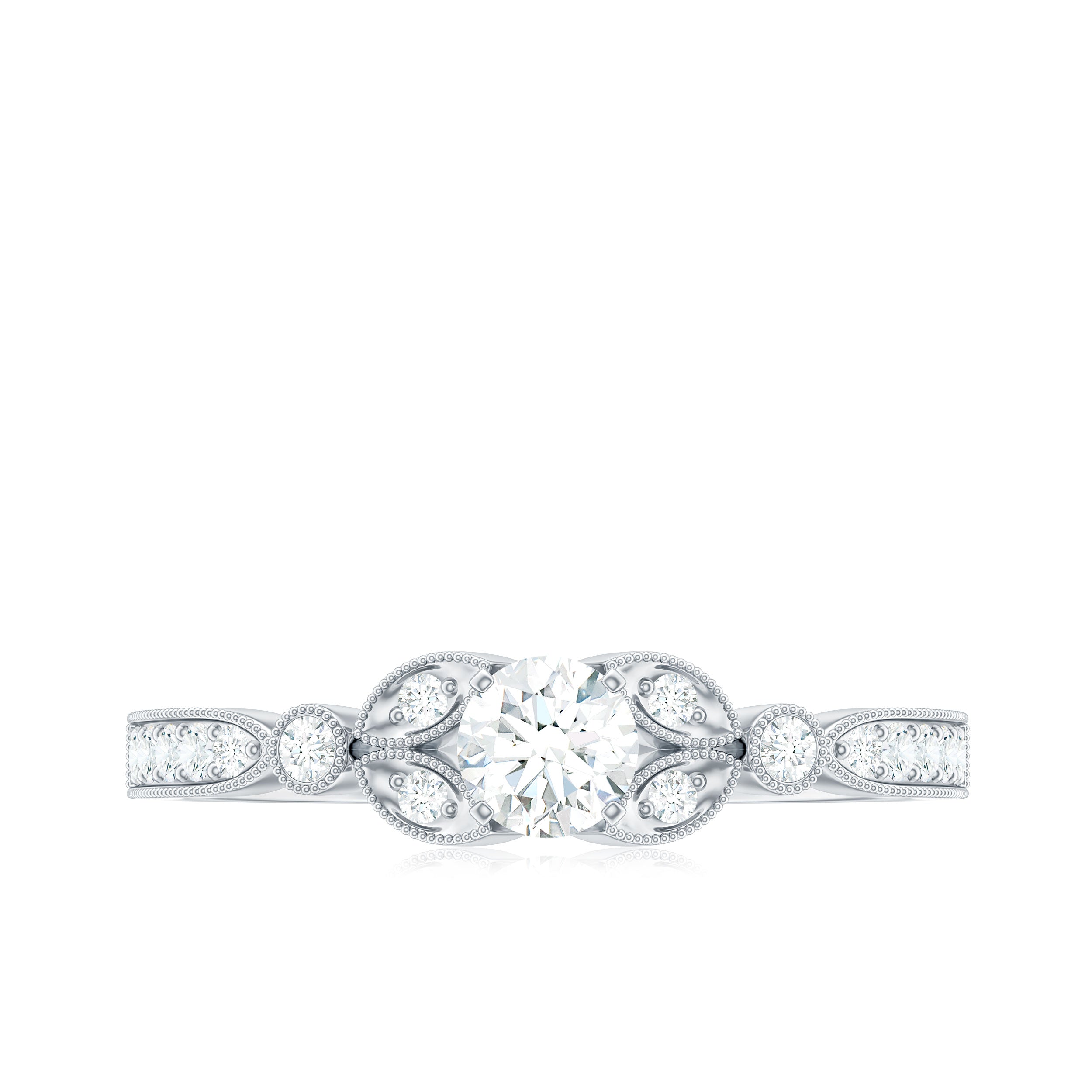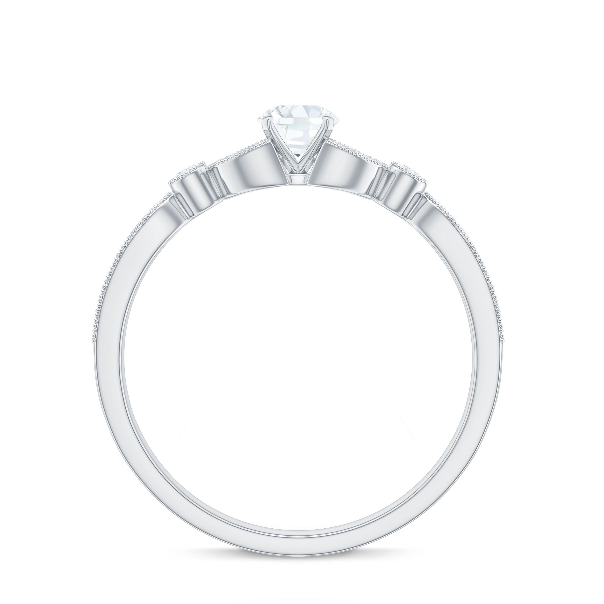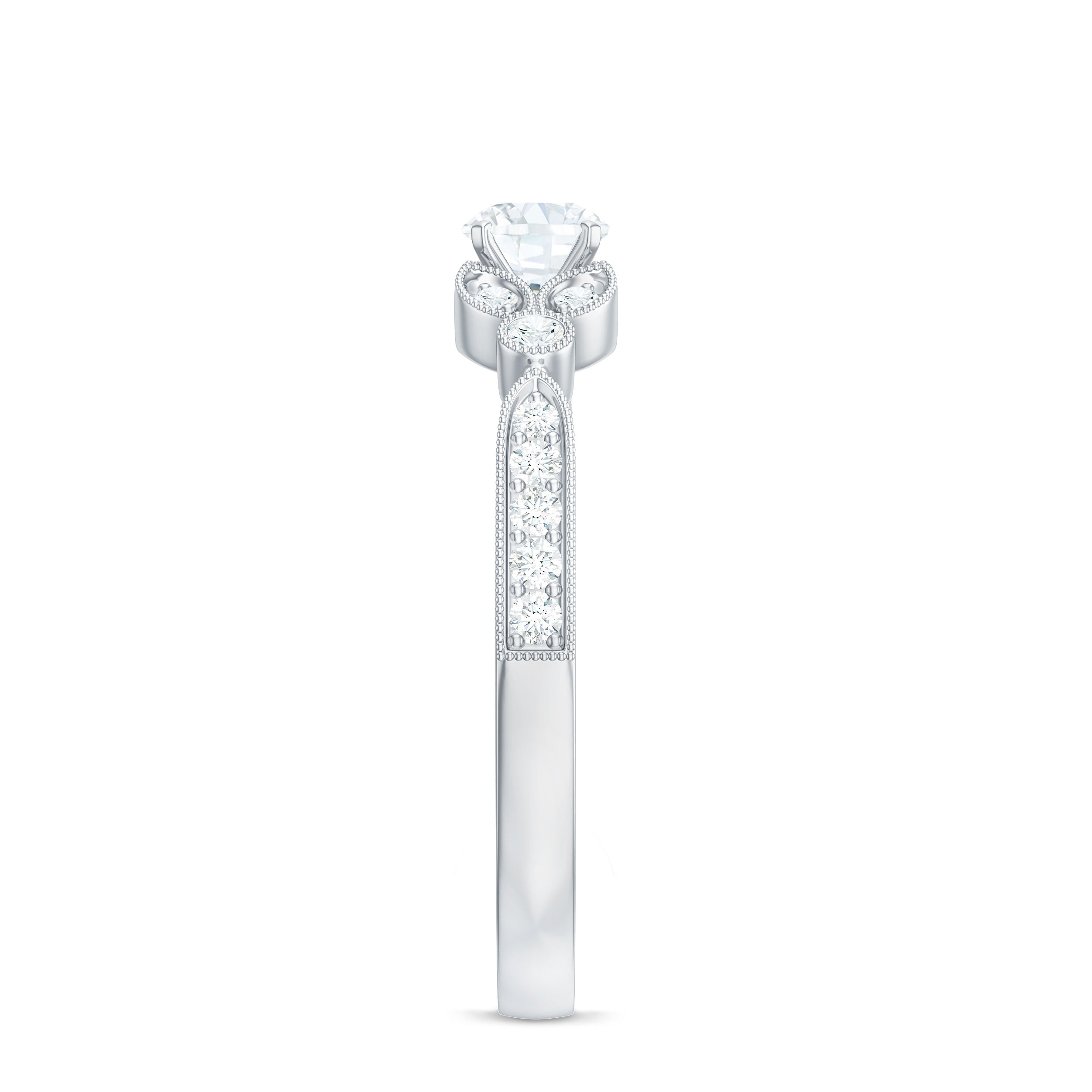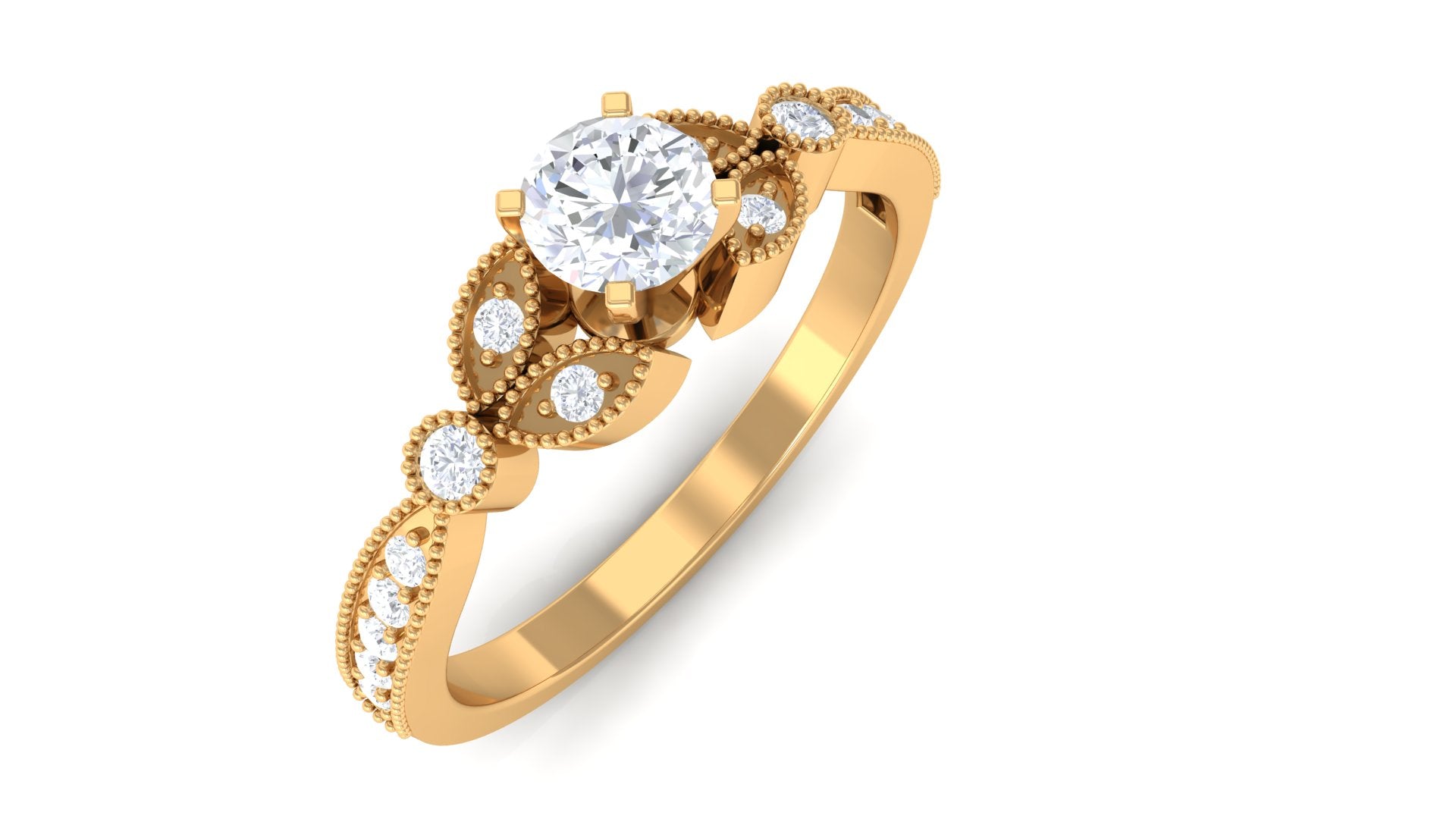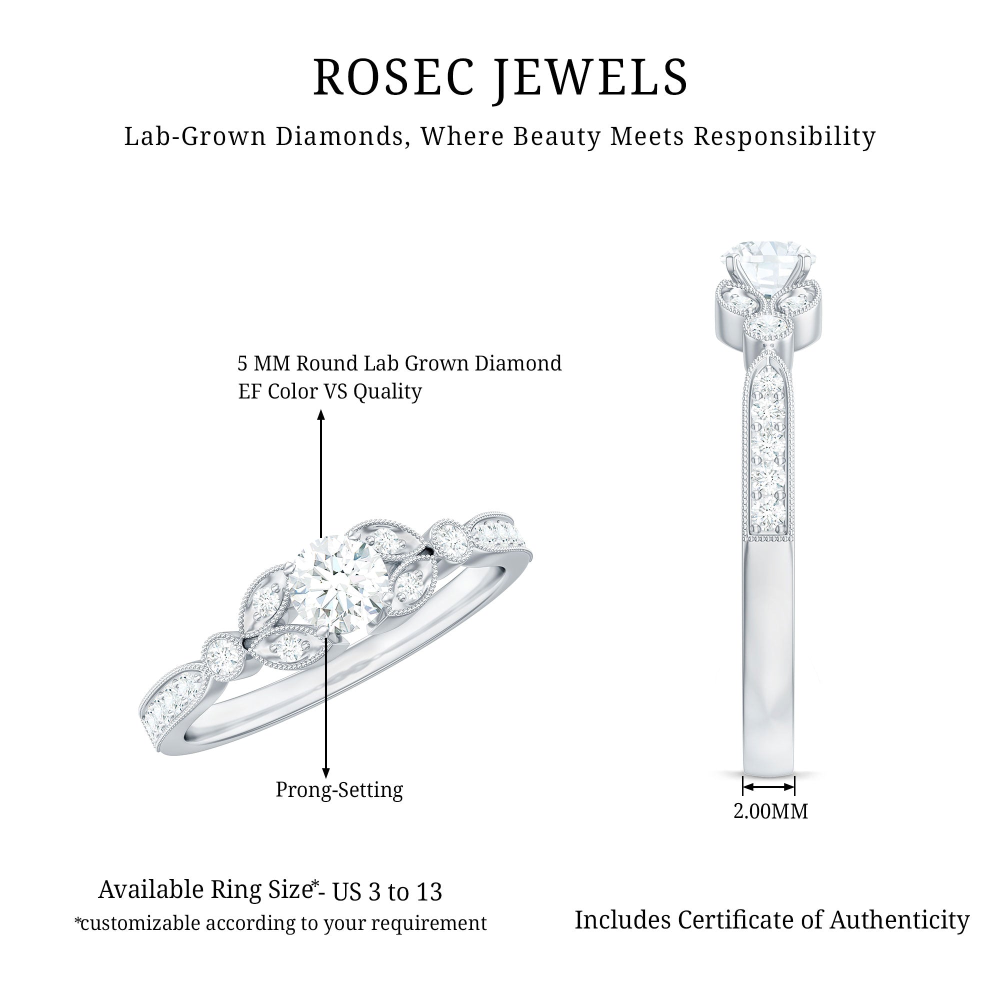 Enhance your special moment with this captivating Diamond Engagement Ring, perfect for your big day. Handcrafted to capture the essence of old-world charm, it features a 5 mm round cut center diamond (lab grown) held securely in a prong setting. The brilliance of this central stone is accentuated by an elaborate band adorned with exquisite details. It is decorated with marquise shaped frames, each housing a round diamond, giving the Vintage Engagement Ring a nature-inspired vibe. These delicate stones are further enhanced by intricate milgraine detailing, which outlines the motifs and trails along the edges of the diamond-studded band. With its rich detailing, romantic charm, and timeless appeal, this Antique Diamond Ring is made for women who cherish both history and elegance.