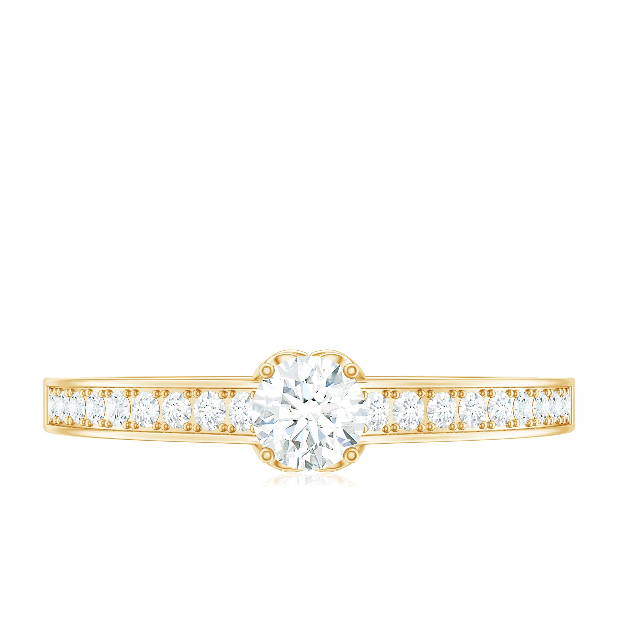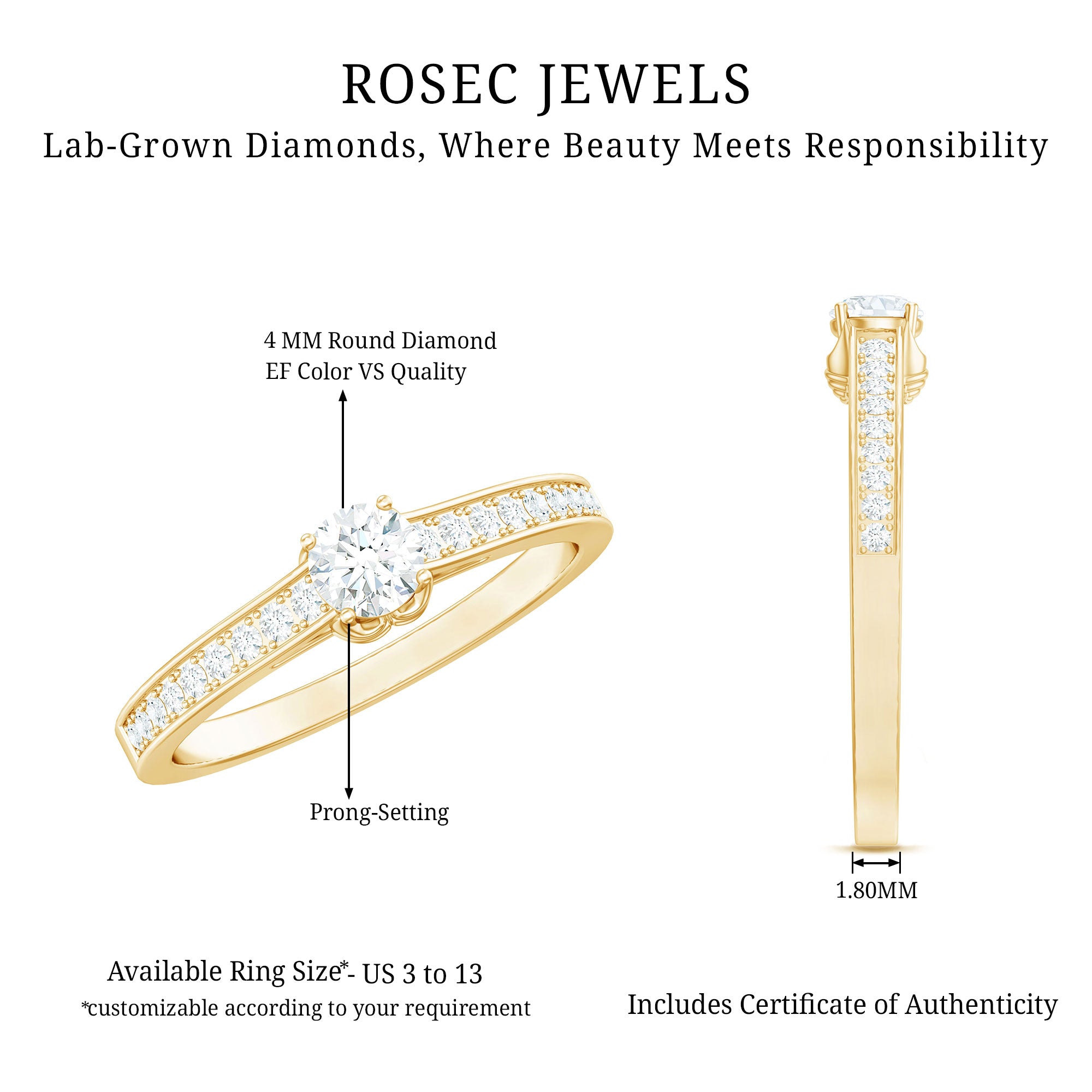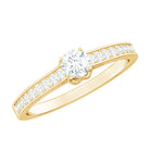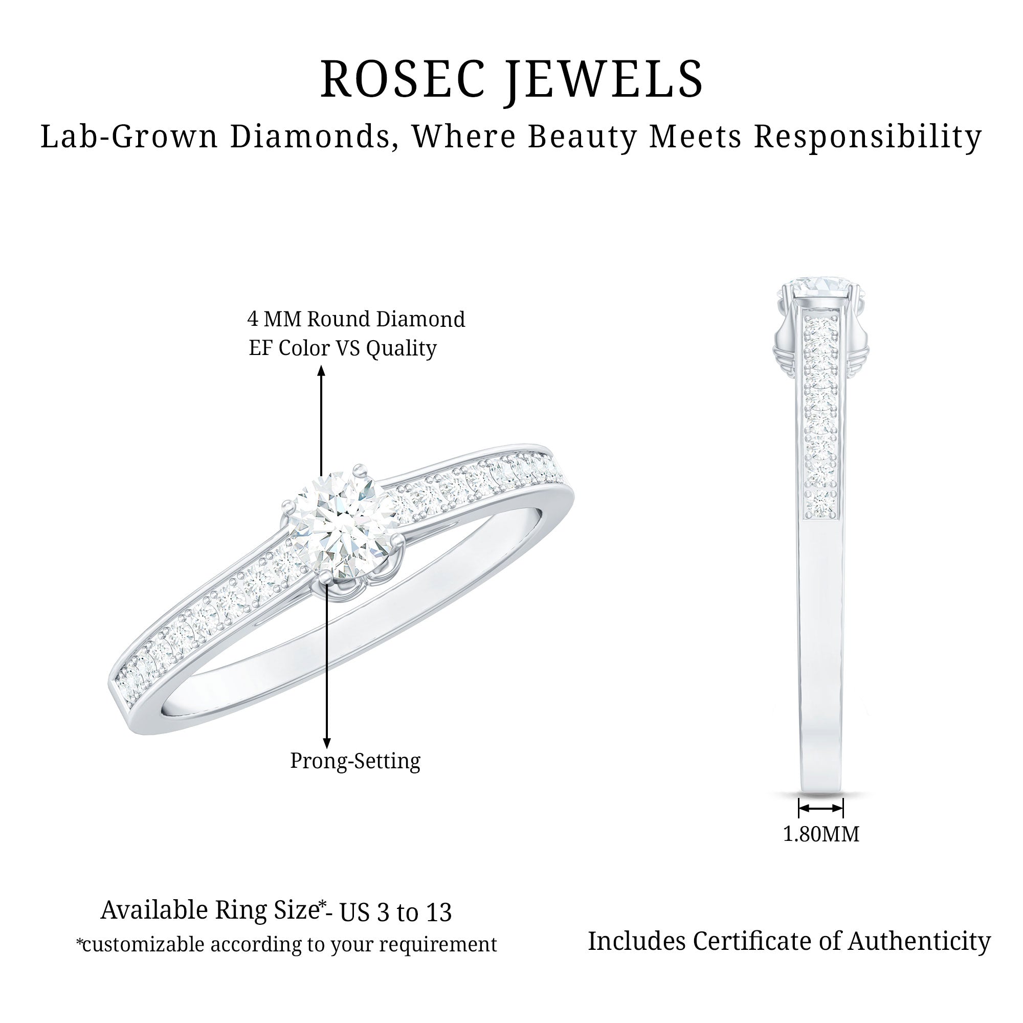 Simple in style this Lab Grown Diamond Ring embodies elegance with its timeless design. Featuring a 4 MM Round Shaped Lab Grown Diamond in Prong Setting with the round petite diamond decorated as side stones. Breathtakingly beautiful this Minimal Diamond Ring lets you keep in the spotlight exuding a subtle beauty. Perfect for those who appreciate minimalist style, this Diamond Promise Ring showcases the brilliance and radiance of an EF-VS Quality Lab Grown Diamond, symbolizing the pure, enduring love between two people. people. Its elegant simplicity makes it an ideal choice for brides who prefer a delicate, timeless piece of jewelry.