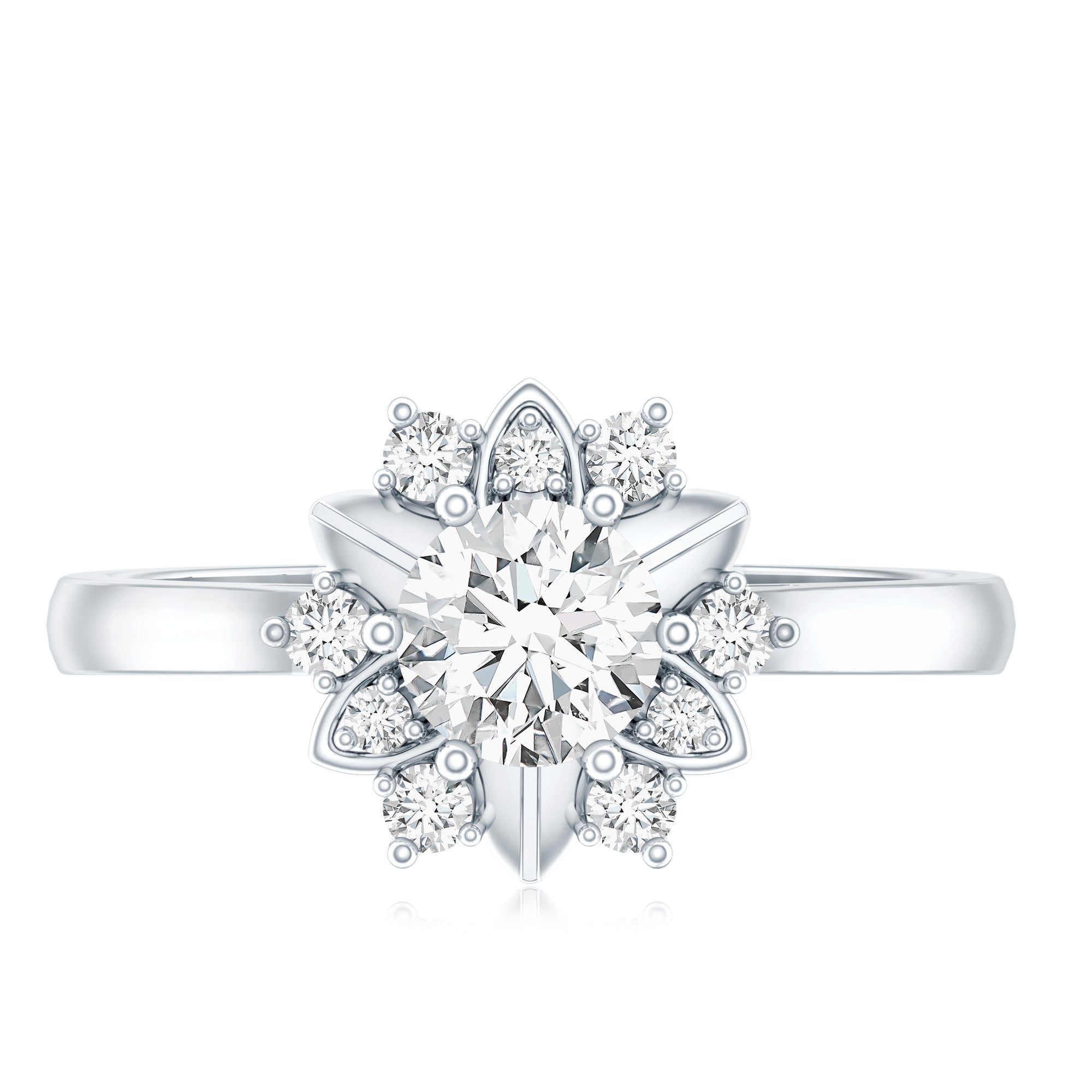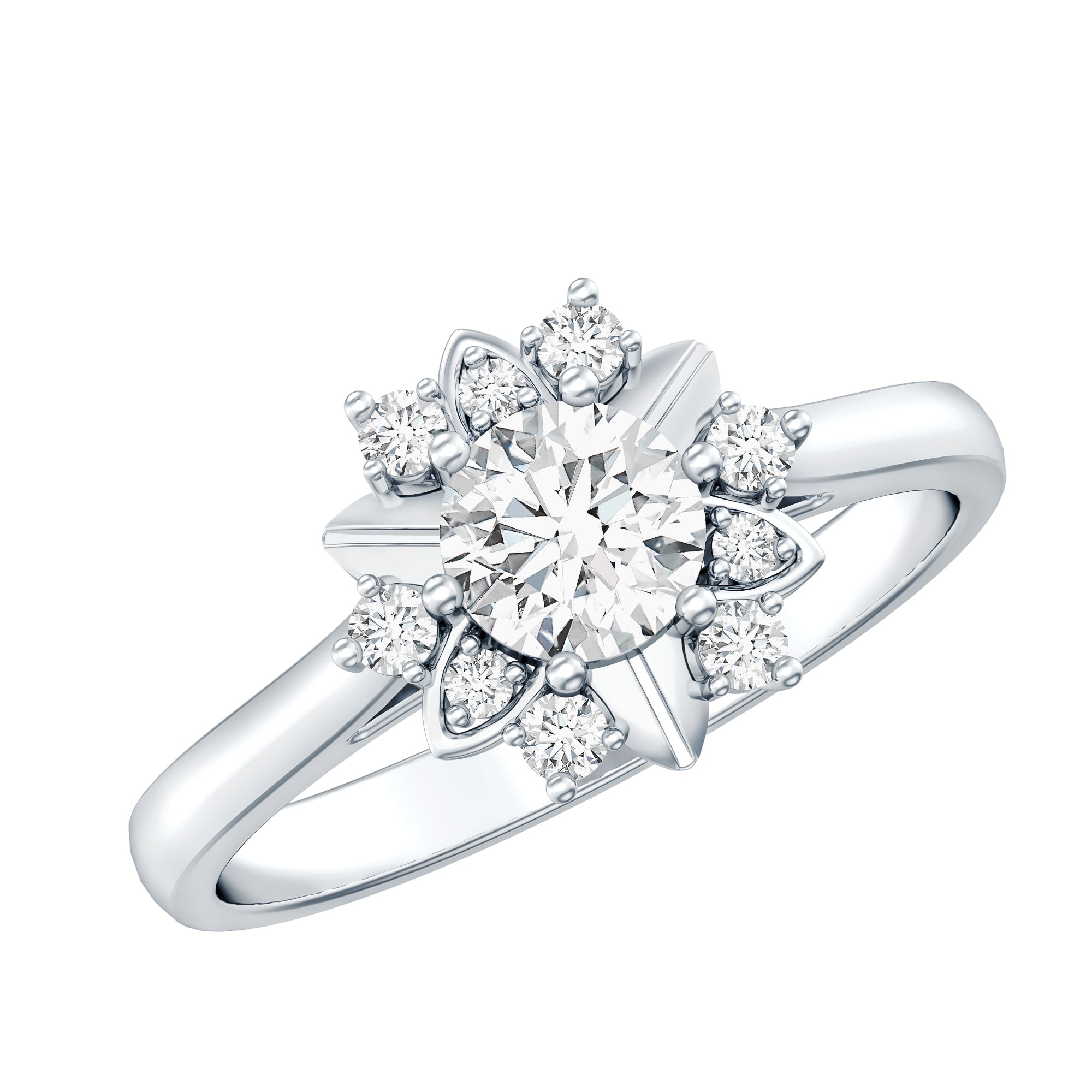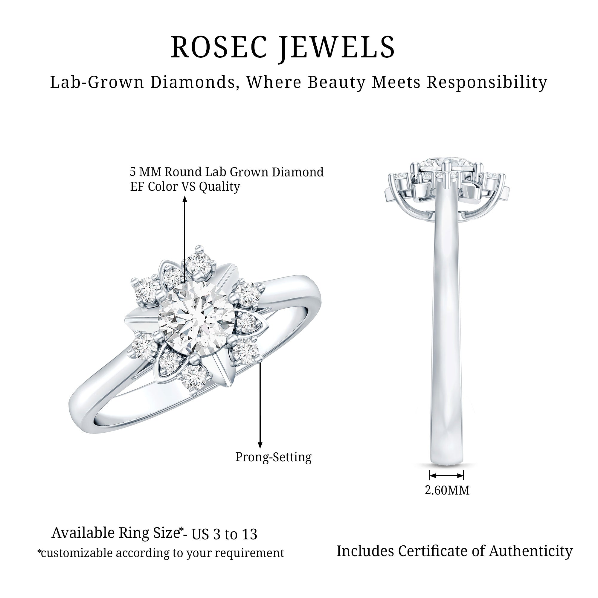 Experience the classic charm of this Flower Engagement Ring, inspired by the enduring allure of nature. This Promise Ring showcases a 5 MM Round Diamond as the centerpiece, elegantly set in Prong Setting and encircled with shimmering gemstones and delicate flower petals. An ideal selection for your beloved, this Lab Grown Diamond Ring will beautifully enhance her Jewelry Collection. Crafted by Rosec Jewels, this Half Carat Diamond Engagement Ring is designed to captivate, blending timelessness with a modern twist, and classic elements with a unique flair. If youre in search of the perfect Floral Ring, this stunning piece is the one for you.