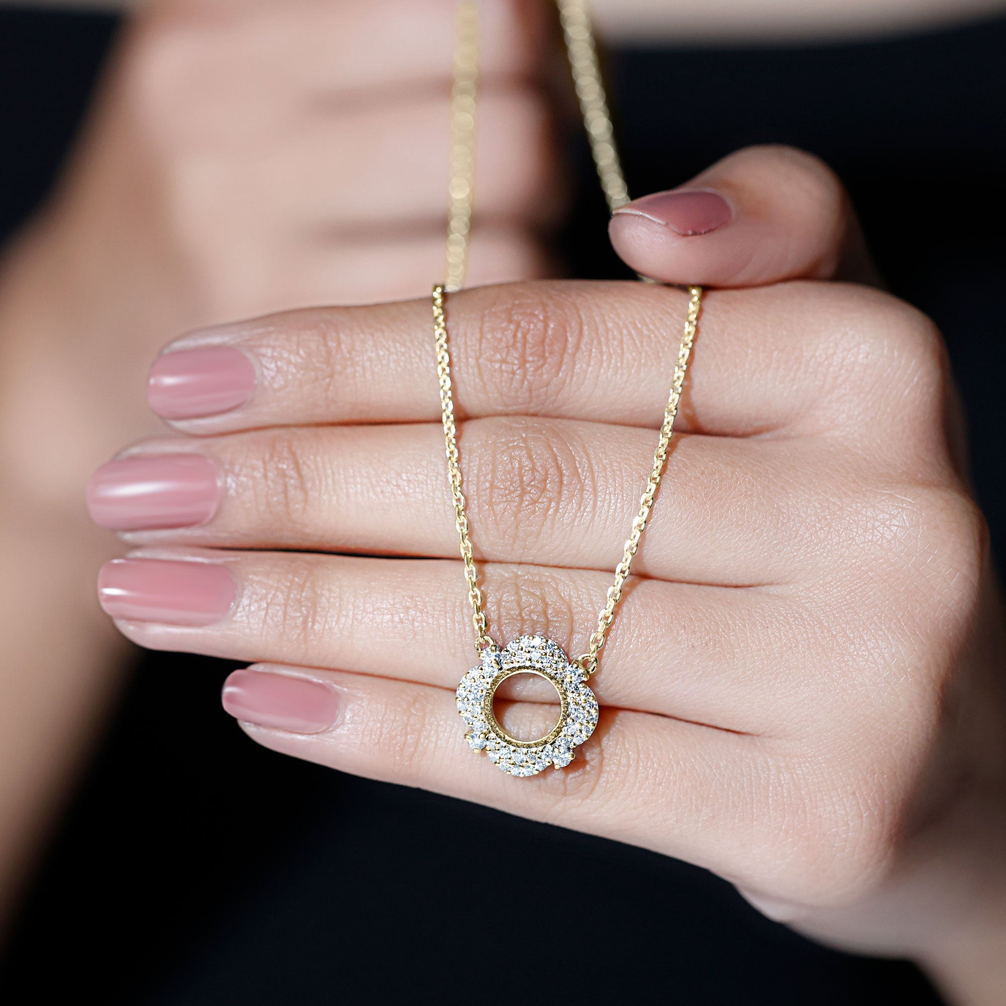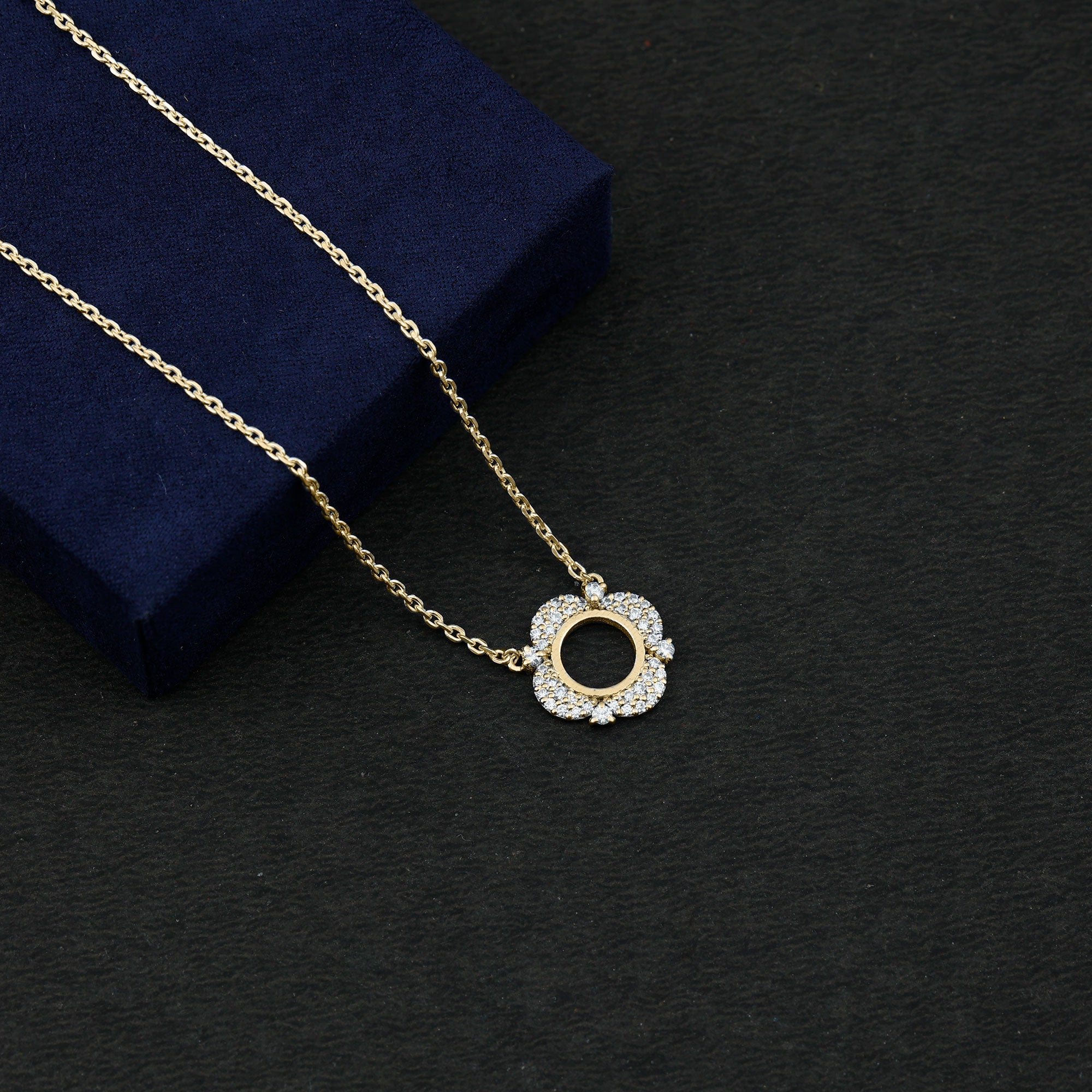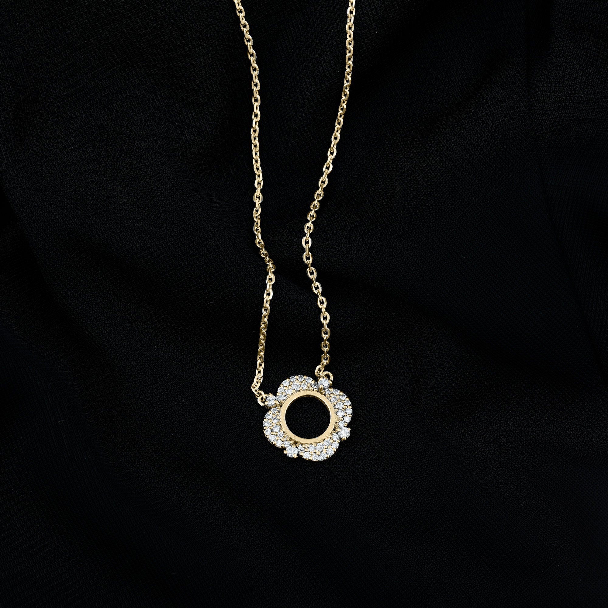 Shine bright and make a statement with this Diamond Eternity Necklace, it features a classic open circle design, symbolizing infinity and endless possibilities. But what makes it stand out is the gorgeous floral-inspired pattern around the edges. Clusters of shimmering round cut diamonds (unnatural) are set in a way that gives the Designer Necklace a petal-like effect. The Diamond Flower Necklace is as versatile as it is stunning, perfect to upgrade any casual and formal look. The gemstones in this necklace are lab grown providing the same sparkle and durability as natural stones but in a more eco-friendly and budget-friendly way.