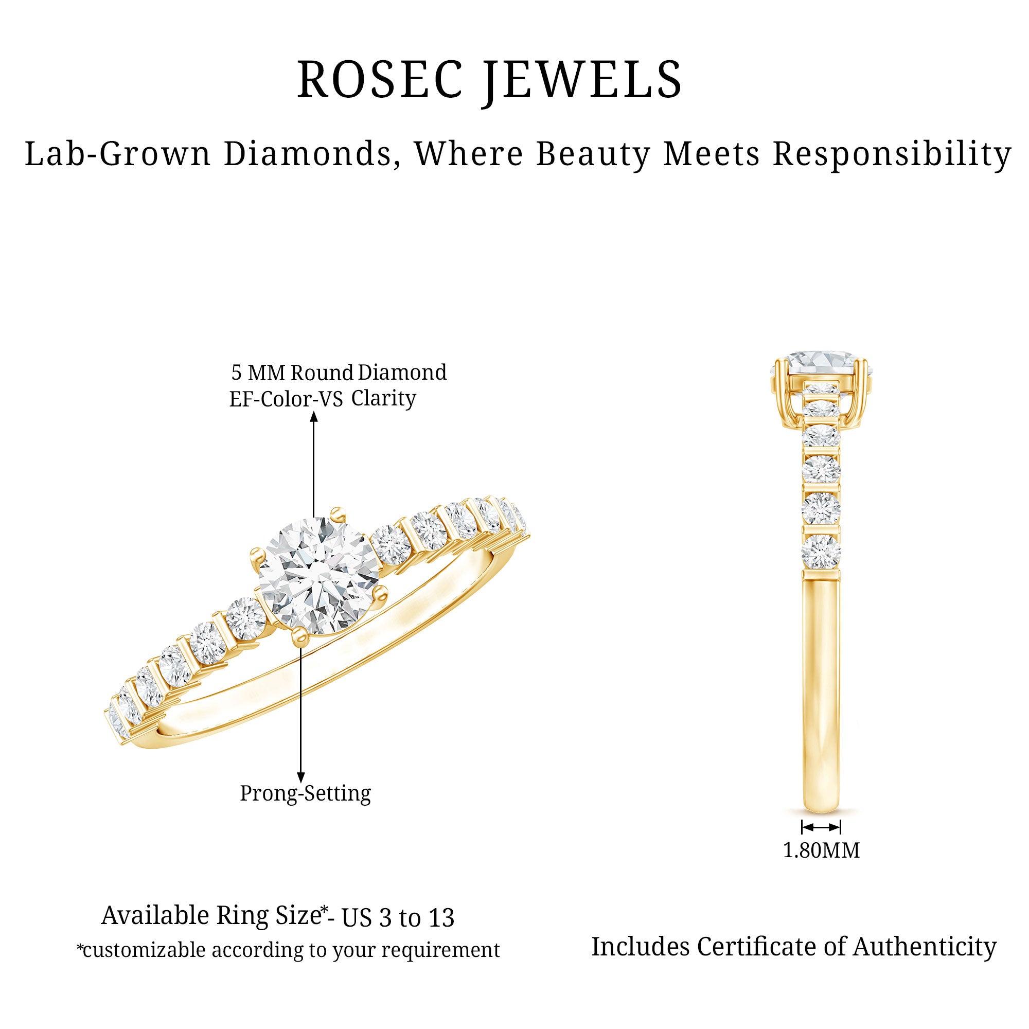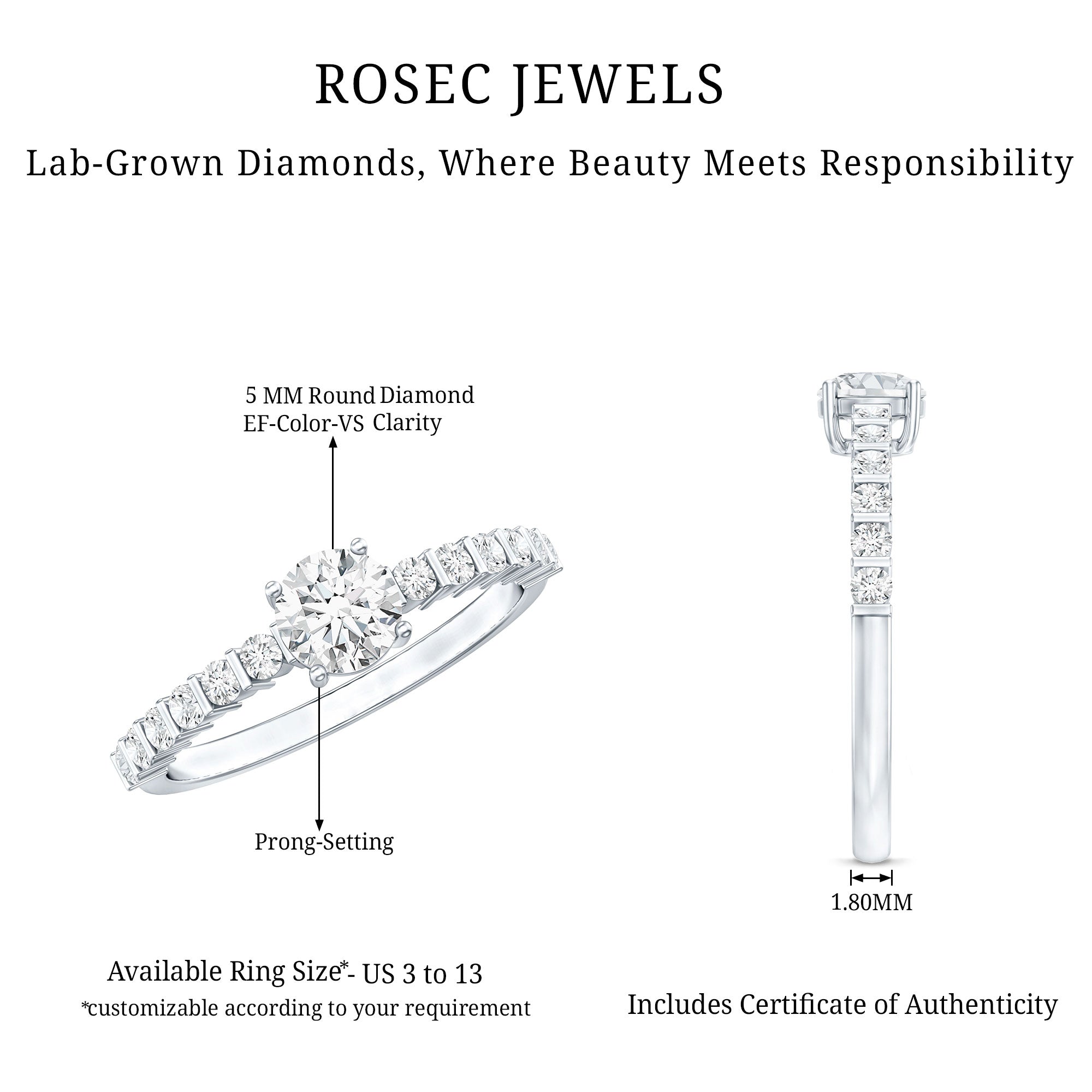 Fall in love with a ring that truly touches the heart. This Round Diamond Engagement Ring is crafted to honor the promises that mean the most. It showcases a breathtaking prong set 5 MM round cut lab grown diamond at its center, radiating with passion and intention, accompanied by delicate side stones set in bar setting to create an illusion of a floating effect. Made in EF-VS Quality, this Promise Engagement Ring is not only stunning but also perfect for engagements, anniversaries, or simply to express that you are always mine. Its timeless design exudes effortless elegance, with just the right hint of charm to capture attention without being over the top. From romantic proposals to delightful surprises, this Lab Grown Diamond Engagement Ring creates those unforgettable moments that linger in your memory. Packaged in a beautiful jewelry box and available in US ring sizes 3 to 13, this Side Stone Engagement Ring is designed to fit every hand effortlessly. Adorable, elegant, and undeniably sincere, this Simple Diamond Ring is like that one love moment you want to relive every time.