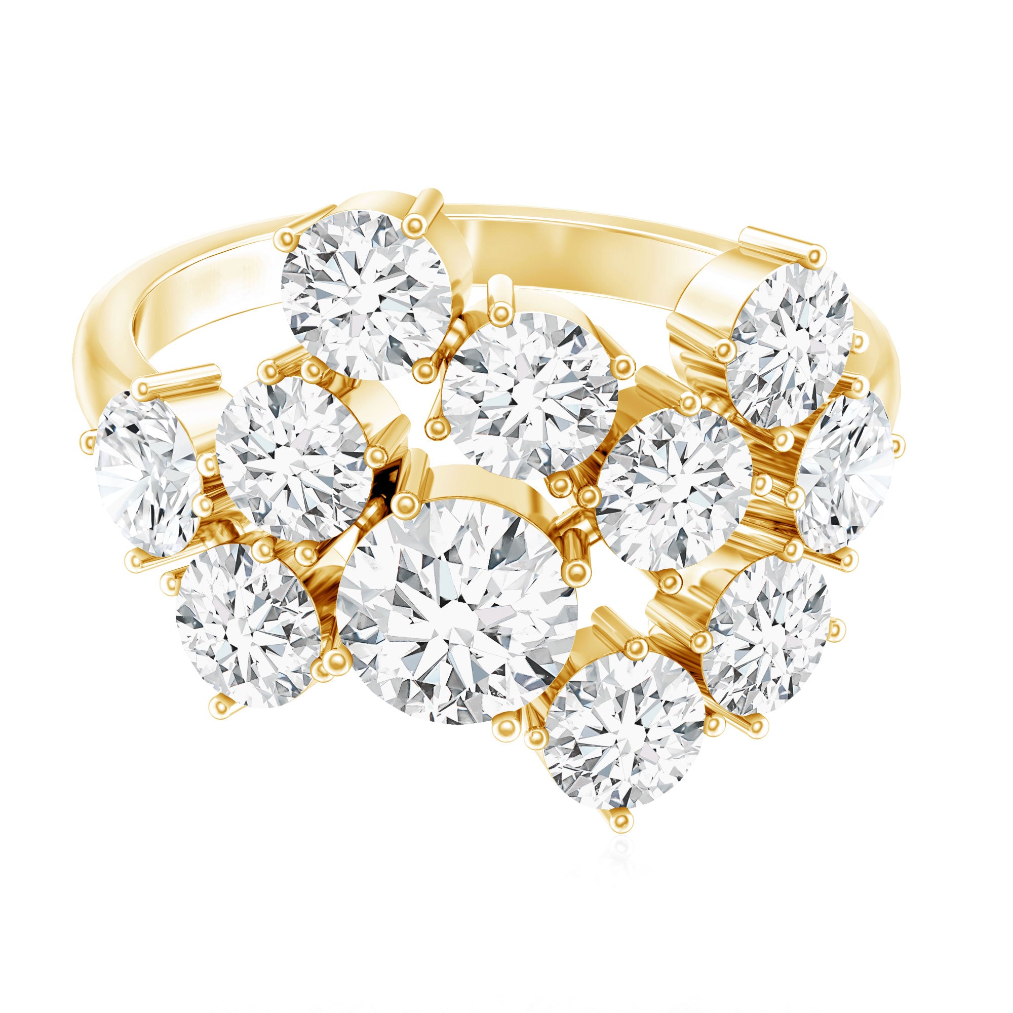 Elevate your style with this dazzling Lab Grown Diamond Engagement Ring, designed to make a bold and unforgettable statement. This elegant piece features a stunning arrangement of round brilliant cut lab made diamonds in varying sizes, artistically set in secure prong setting that enhances each stones brilliance and sparkle. Crafted for those who love standout jewelry, this Statement Ring is not just perfect for engagements but also for cocktail parties, festive evenings, or any special occasion where you want your style to speak. The diamonds used in this Designer Cluster Ring are of EF color and VS clarity, ensuring exceptional brightness, giving you a flawless radiance like natural stones. Our Womens Diamond Ring is available in a variety of metal types and metal colors, providing you option to make it a truly personalized piece. It is also offered in multiple ring sizes to ensure a perfect fit for every hand. Mark your lifes most special day with a piece of fine jewelry that reflects your unique personality. This Diamond Cluster Ring is a brilliant choice that fuses luxury, elegance, and modern ethics into one stunning design.
