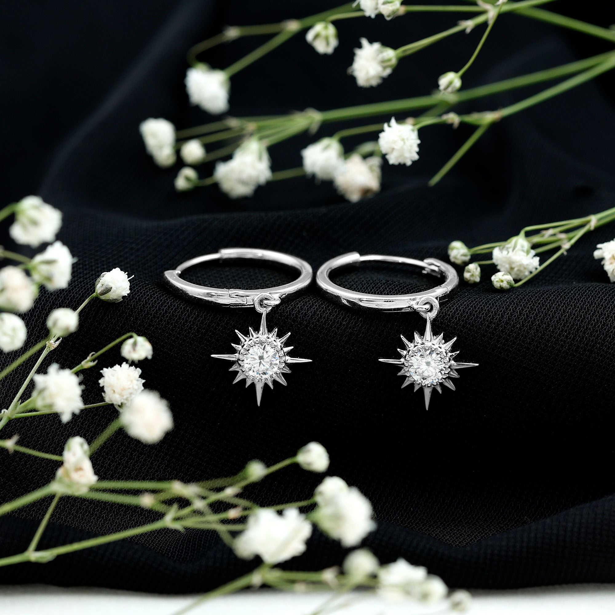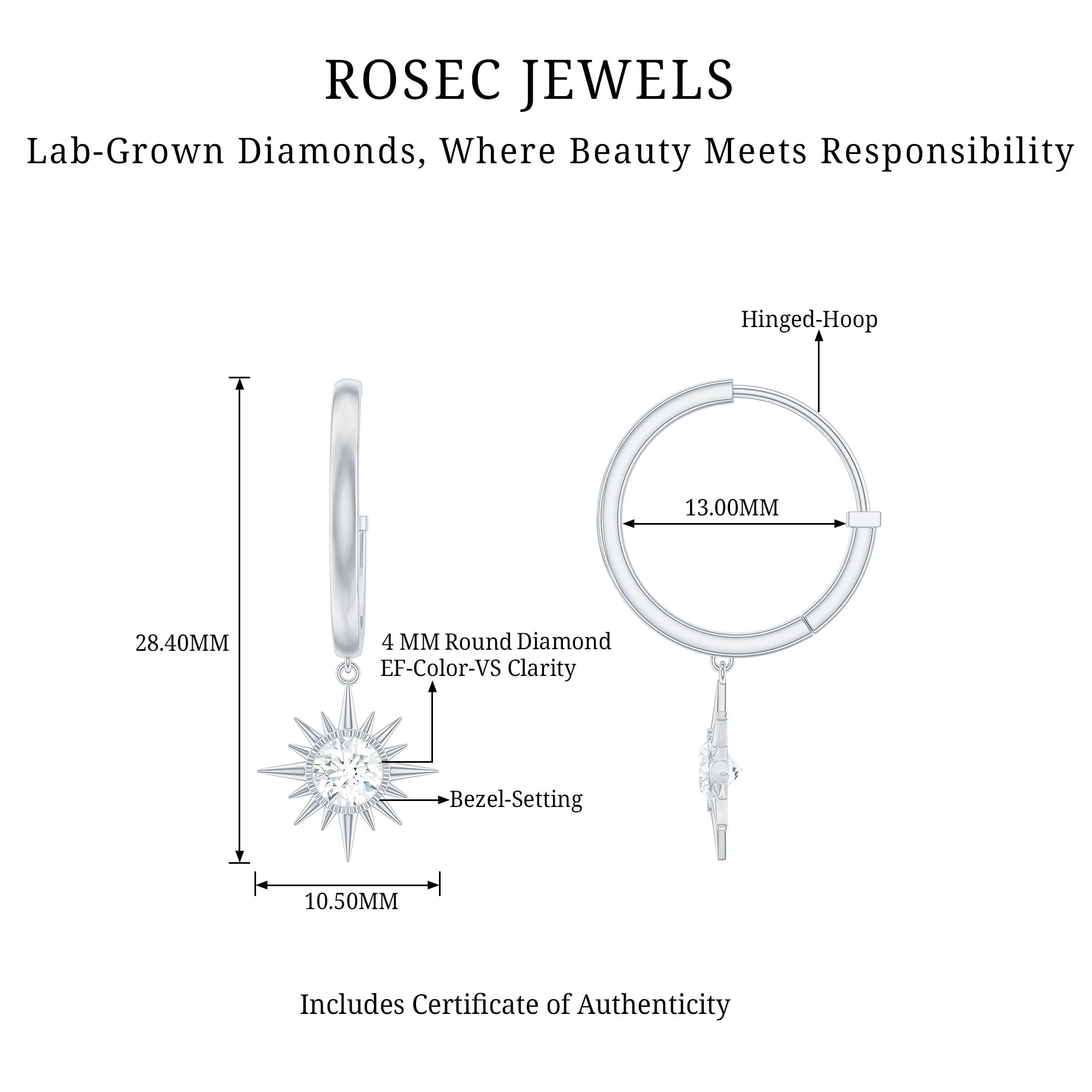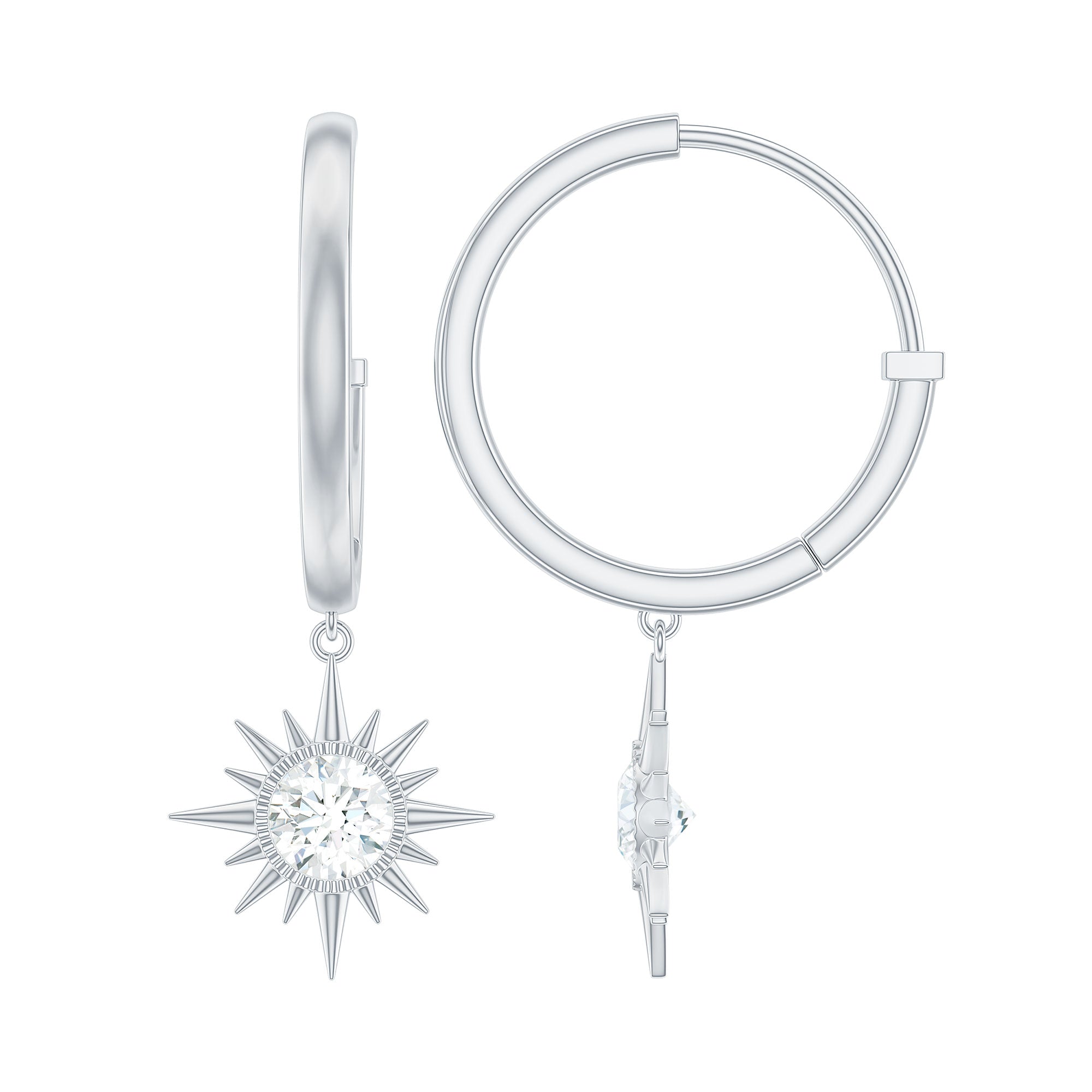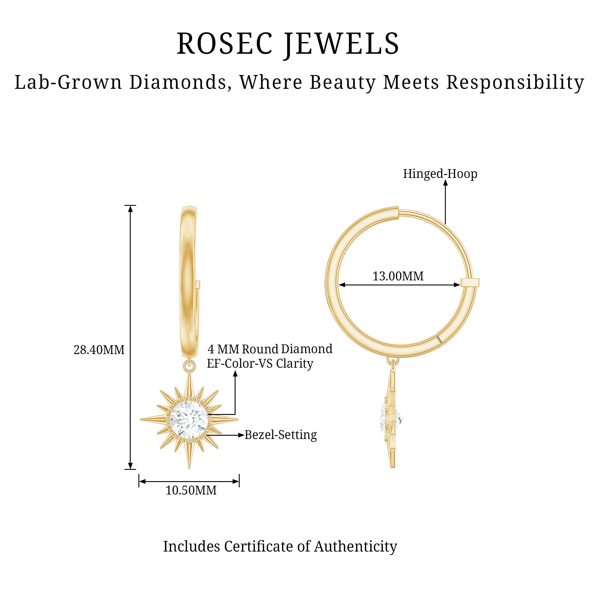Experience elegance with these Diamond Sunburst Earrings, which are delicately crafted with high-quality metal. The Sunburst Drop is hanging from a precious metal small hoop for easy carrying. These Hoop Drop Earrings are perfect for occasions such as Christmas and New Year. These Hinged Hoops Earrings dazzle with EF-VS Quality Diamond. These Celestial Hoop Earrings are perfect for gifting your lady if she is April-born. These Diamond Earrings will be delivered in a premium quality box with a certificate of purity and quality of the Gemstone.