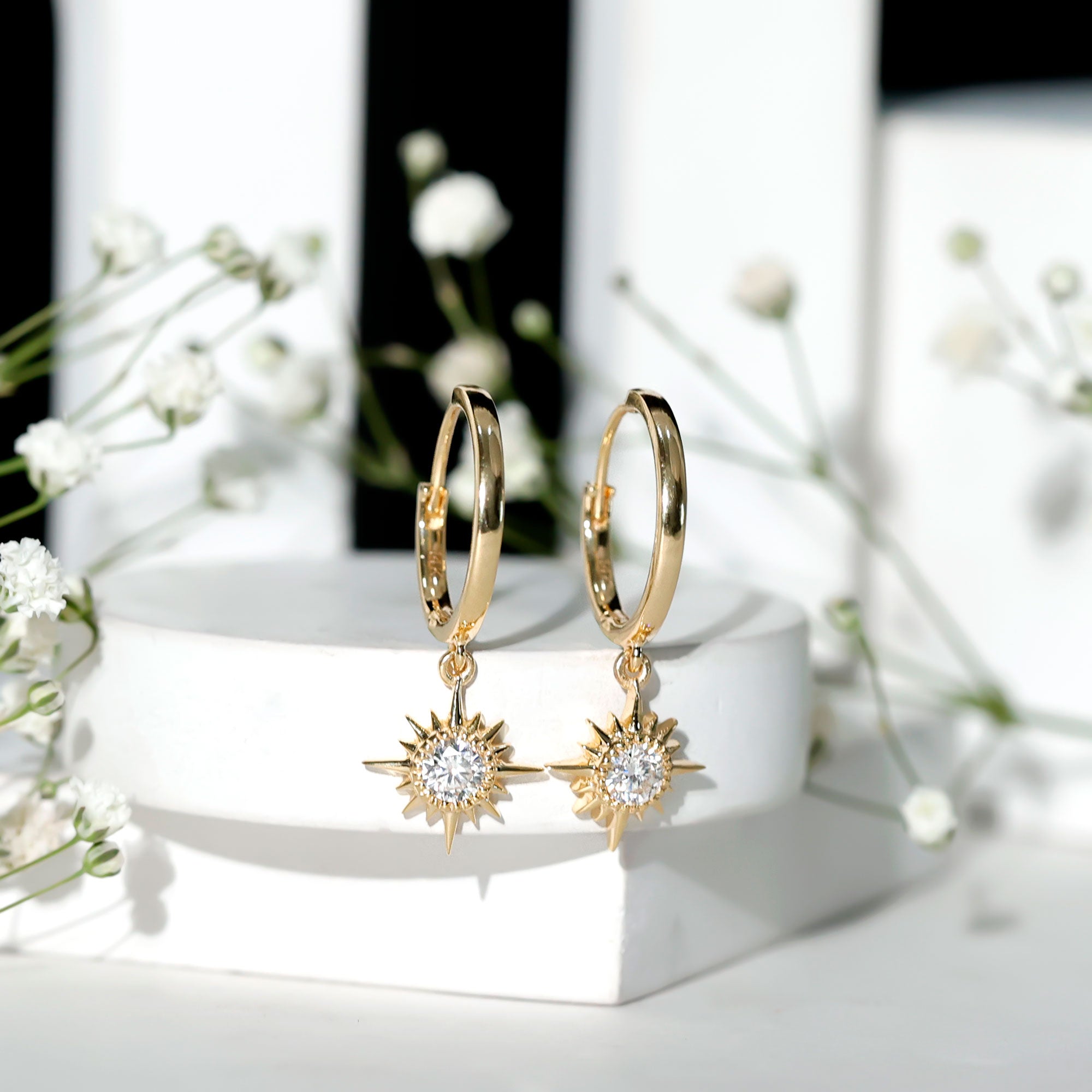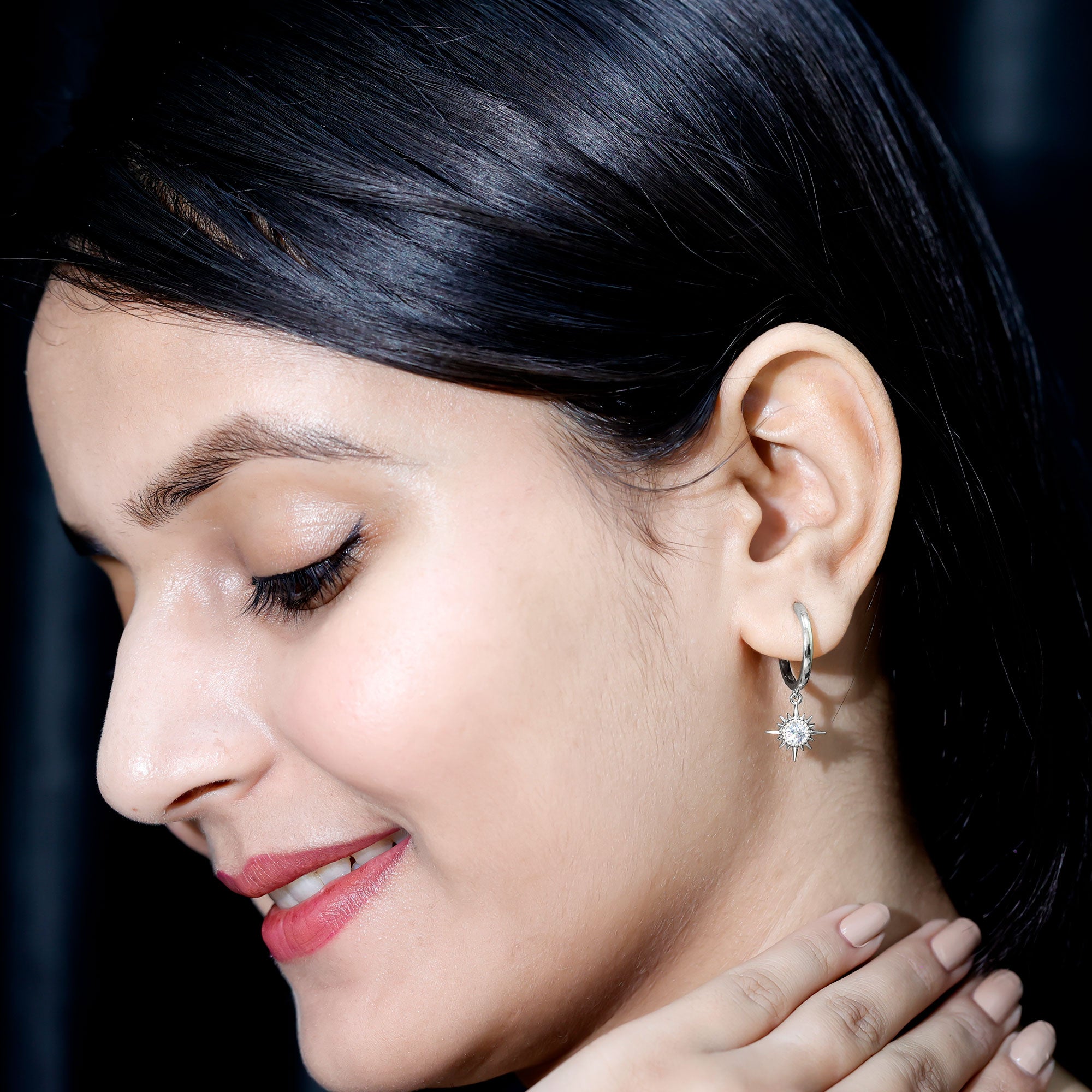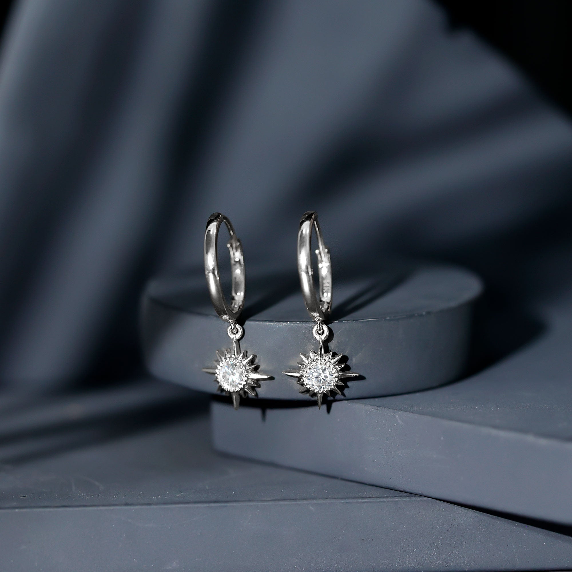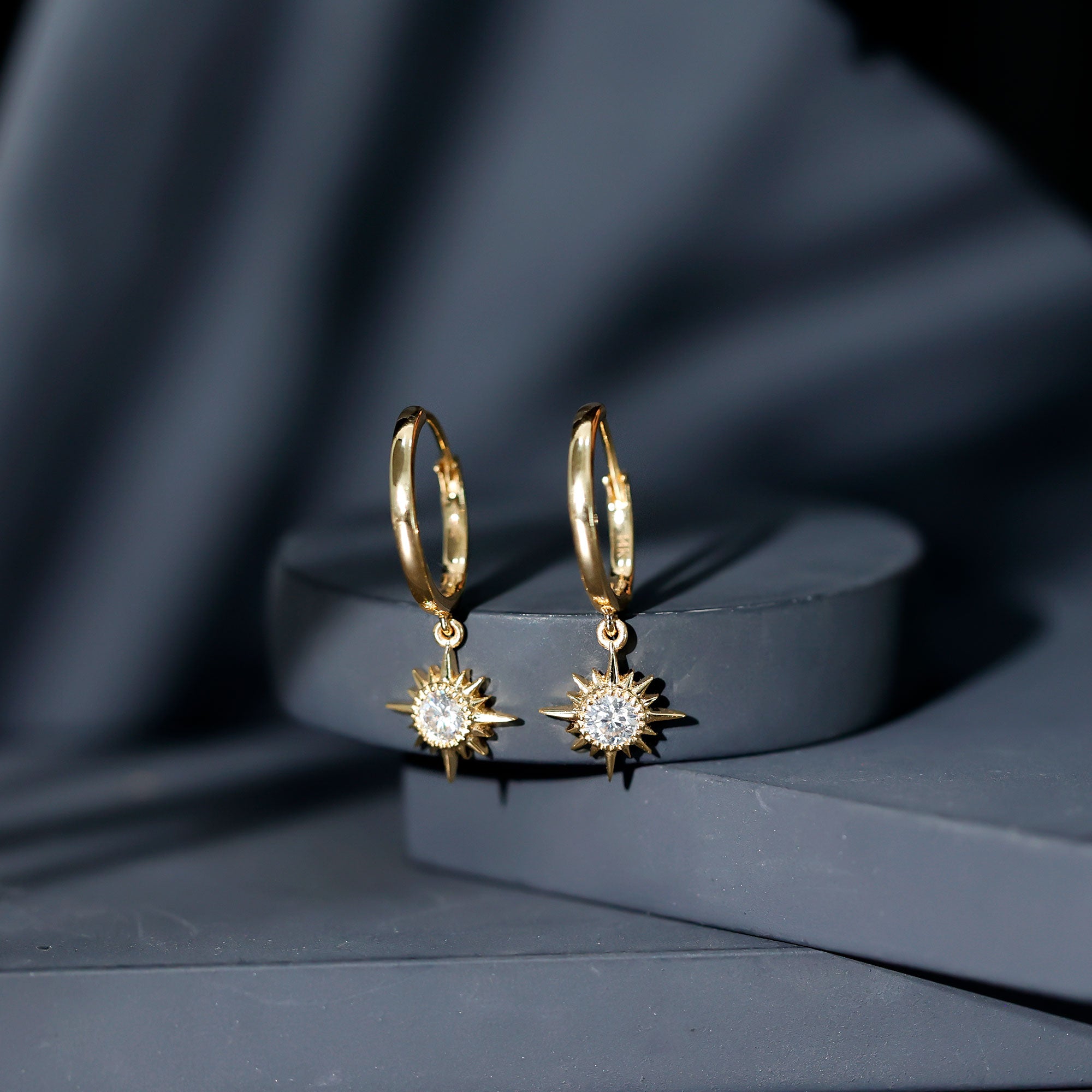 Experience elegance with these Diamond Sunburst Earrings, which are delicately crafted with high-quality metal. The Sunburst Drop is hanging from a precious metal small hoop for easy carrying. These Hoop Drop Earrings are perfect for occasions such as Christmas and New Year. These Hinged Hoops Earrings dazzle with EF-VS Quality Diamond. These Celestial Hoop Earrings are perfect for gifting your lady if she is April-born. These Diamond Earrings will be delivered in a premium quality box with a certificate of purity and quality of the Gemstone.