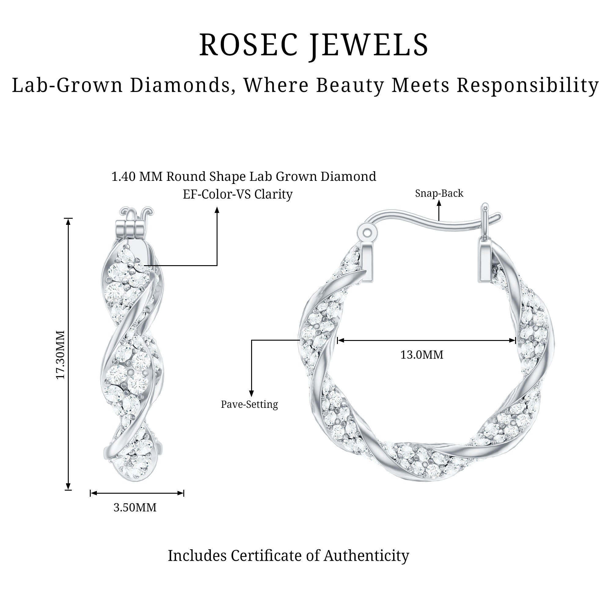 Add a stylish twist to your everyday look with these Lab Grown Diamond Earrings. Designed in a unique twisted style, these Hoop Earrings offer a modern take on a classic favorite. The elegant curves catch the light beautifully, while the dainty Lab Grown Diamond stones add just the right amount of sparkle without being too bold. Each earring is carefully crafted with EF-VS Quality Lab Diamond stones that shine bright, giving you all the brilliance of natural gemstones with a more conscious, sustainable touch. The twisted design adds texture and movement, making these Lab Diamond Earrings stand out in the most subtle, sophisticated way. They are comfortable and easy to wear, perfect for day-to-night styling. Whether you are heading to the office, a casual brunch, or a night out, these Diamond Hoop Earrings (Lab Diamond) will effortlessly elevate any outfit. They come beautifully packaged in a jewelry box, making them a great gift for birthdays, anniversaries, or simply to treat yourself. Classic, elegant, and just a little different, these Cultured Diamond Earrings are made for women who like their jewelry to have a bit of personality. Easy to pair, hard to miss, and sure to become a go-to piece in your collection.