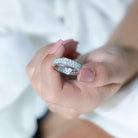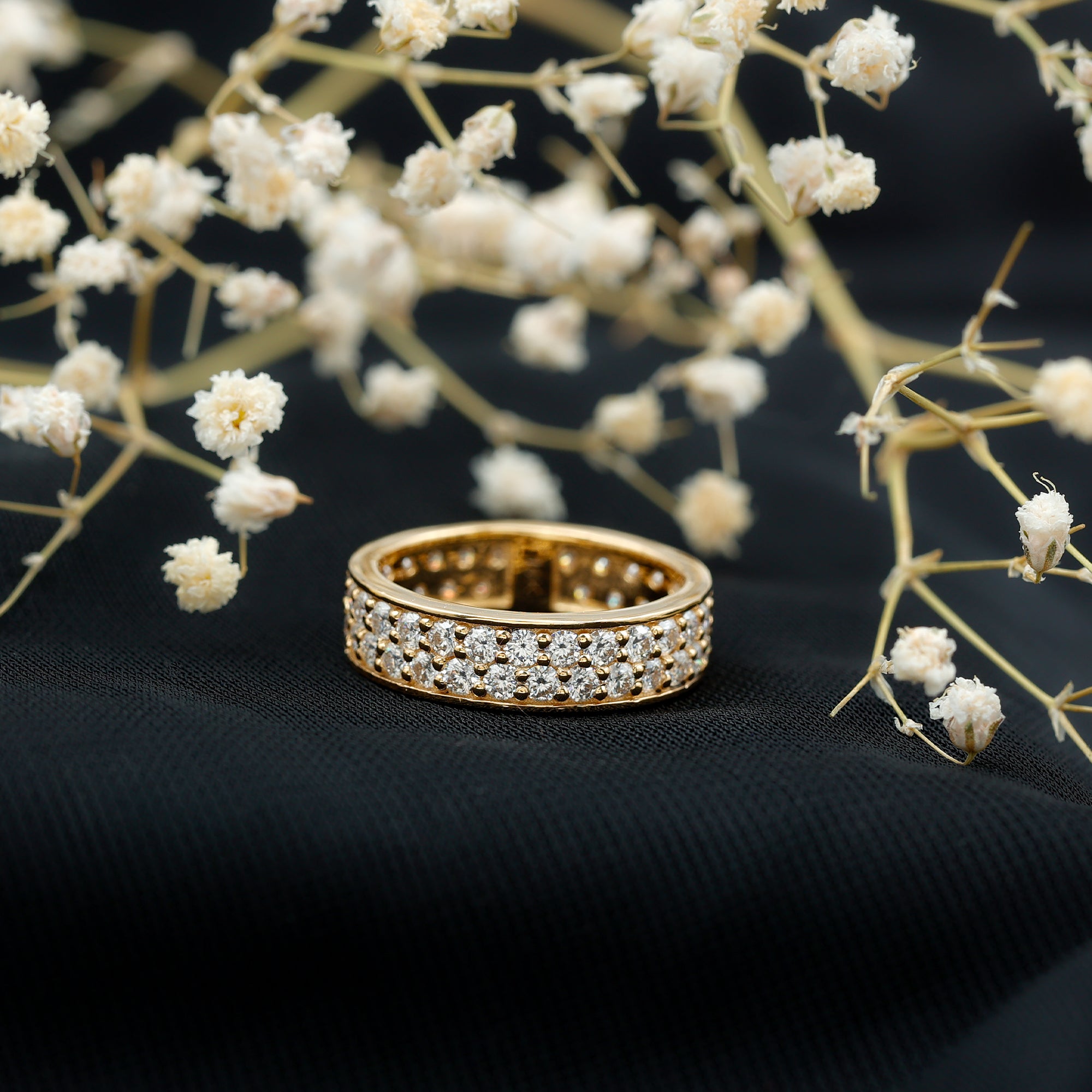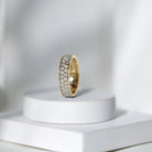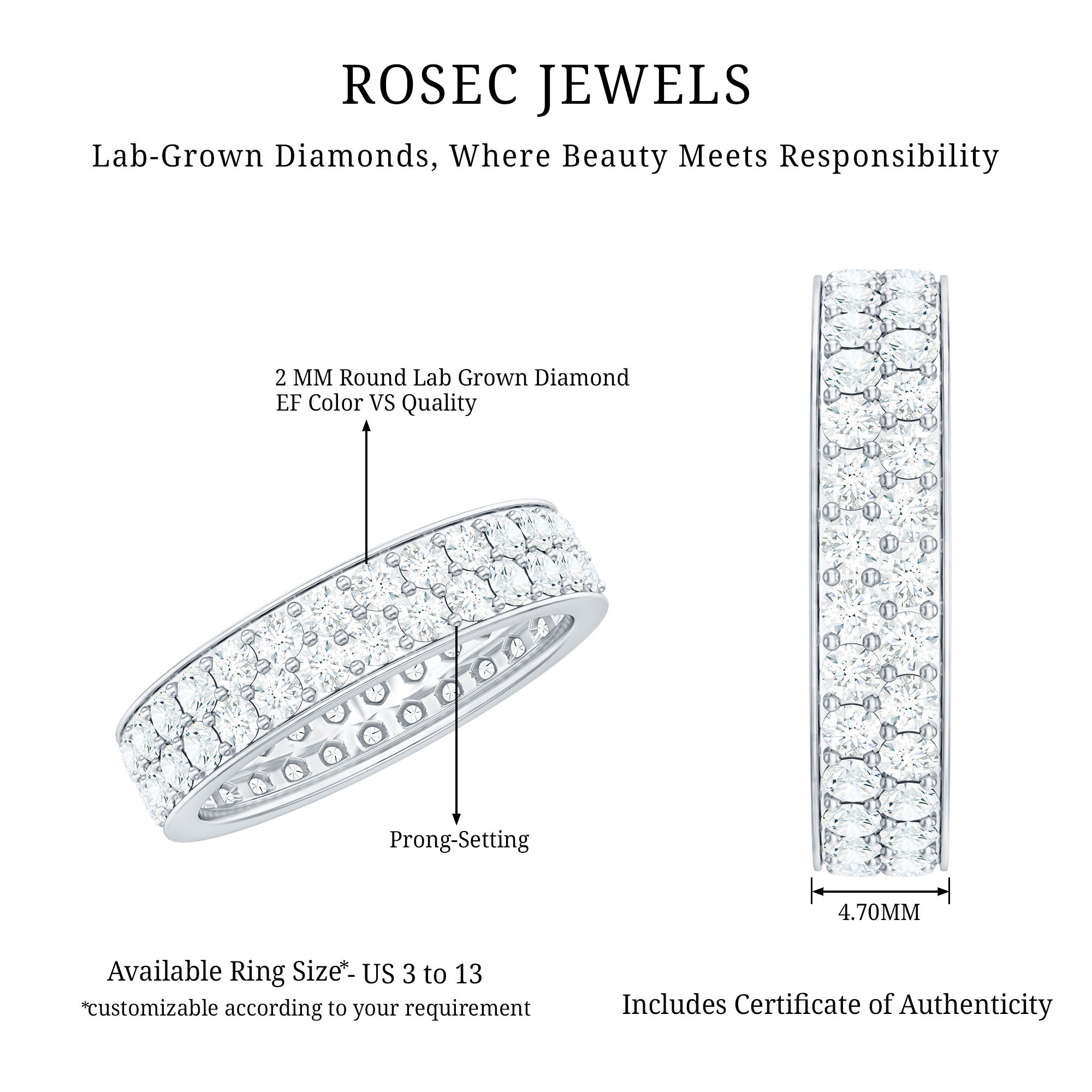 This stunning Lab Grown Diamond Band Ring perfectly blends elegance and sparkle with a vibrant appearance. This Eternity Wedding Band features with Round Shaped Lab Grown Diamond in Pave Setting making beautiful 2 Rows on the band. The Pave Set Diamond Ring in an eternity pattern symbolizes never ending love and is also a great reminder for the one who loves to wear the extra dose of sparkle. Being a standalone piece, this Diamond Eternity Band is perfect for anniversaries, weddings, April birthdays or while celebrating any special occasion. The EF-VS Quality Lab Diamond has a stunning appearance giving a reflection of the stylish light.