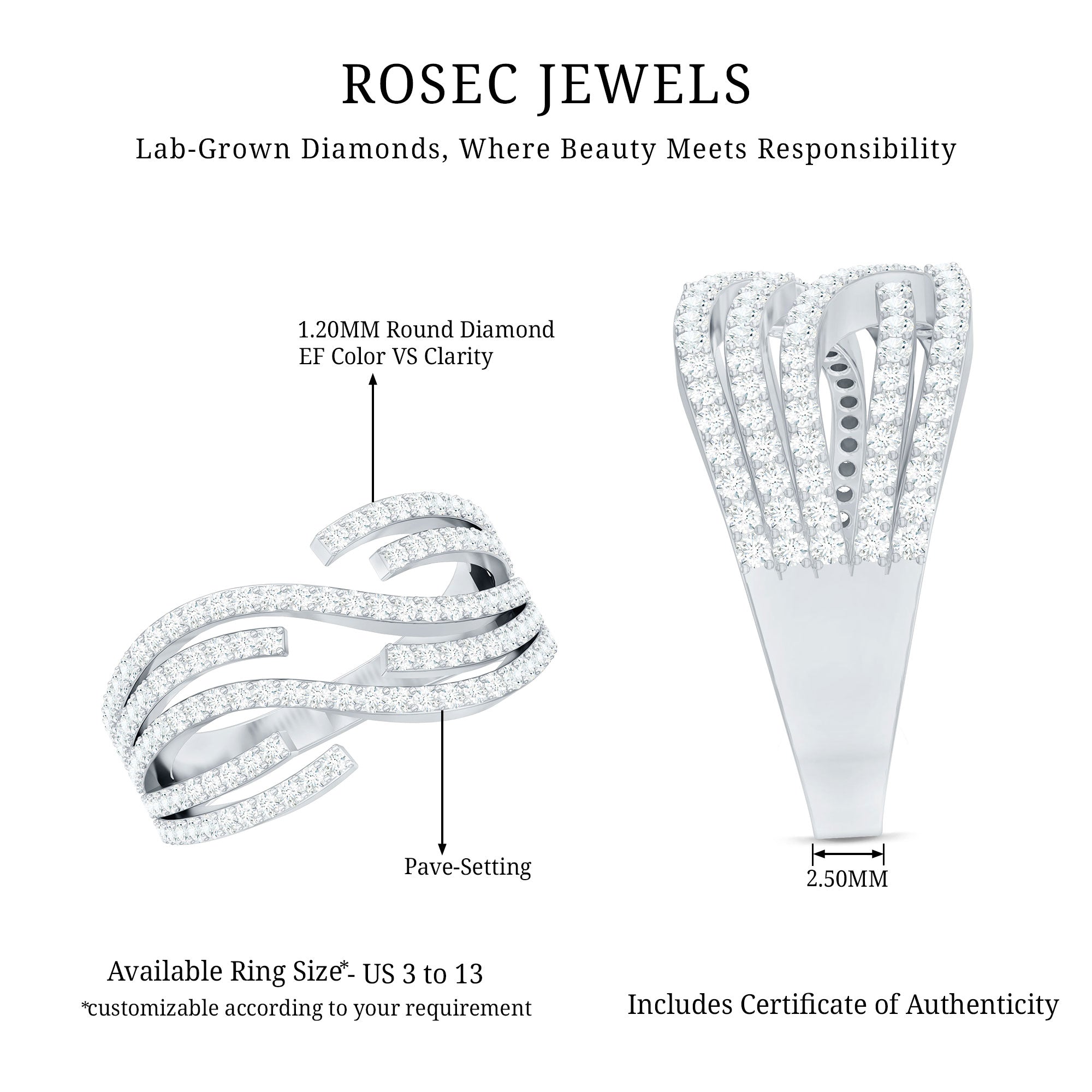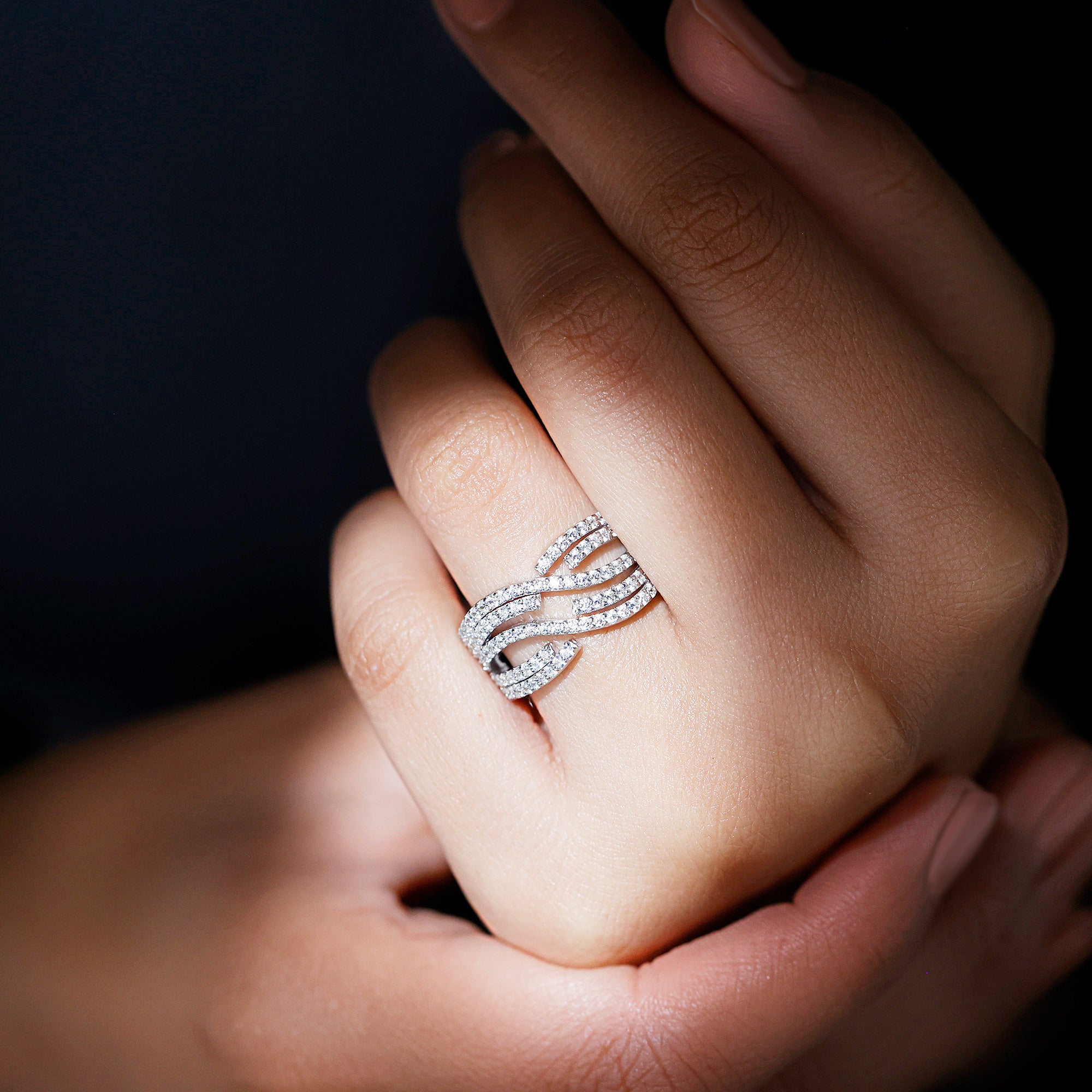 Celebrate love and romance with this breathtaking Infinity Wedding Band, ideal for a bride on her special day. This Designer Band Ring is embellished with round shaped pave set diamonds (lab grown) on multiple curved rows, together they create a unique infinity pattern. The carefully designed space in between the rows adds a contemporary touch while ensuring a lightweight and comfortable fit. Whether worn as a statement Diamond Wedding Ring, an Anniversary Ring or a luxurious fashion piece, this Infinity Ring is perfect for those who love unique designs with a dazzling impact.