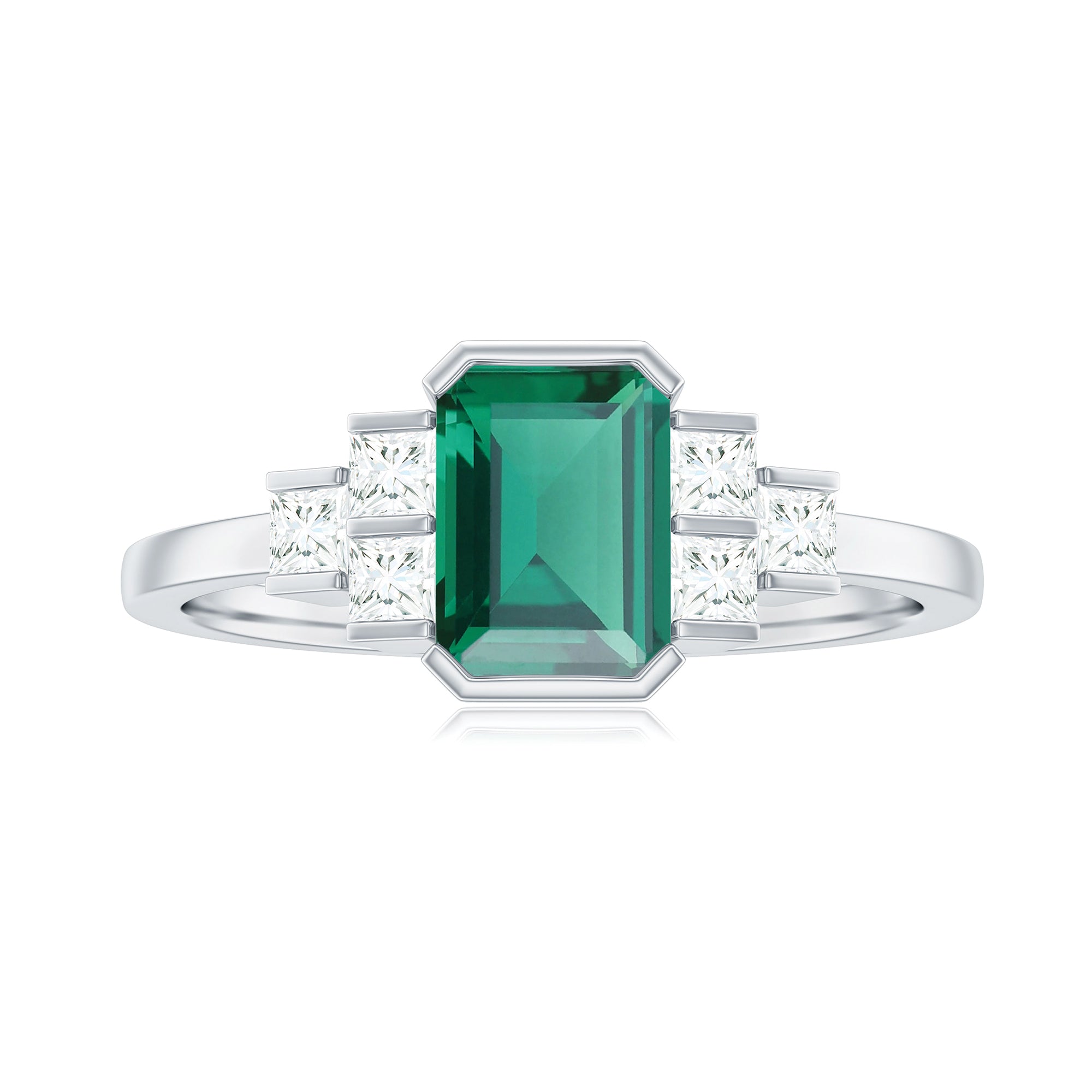 Make your special day unforgettable with a ring that blends timeless beauty and bold elegance. This Lab Grown Emerald Engagement Ring is designed to capture her heart at first glance. Thoughtfully designed, this Solitaire Engagement Ring features a 6X8 mm Emerald Cut Lab Created Emerald of Aaaa Quality as a center stone, admired for its deep green hue that symbolizes renewal, harmony, and everlasting love. On either side, sparkling Princess Cut Diamond gemstones are set in a trio arrangement, adding balance, brilliance, and a touch of Art Deco sophistication to the design. The combination of geometric cuts and contrasting shapes gives the Emerald Cut Engagement Ring a unique character, making it both modern and vintage-inspired. The Emerald Cut is known for its elegance, reflecting light for a look that is captivating. Together, the gemstones create a harmonious story of love, commitment, and strength. This Emerald Diamond Engagement Ring is a meaningful symbol of your promise and devotion. She will surely love this Emerald Cut Emerald Ring, and it will become her favorite piece, cherished for a lifetime. Perfectly crafted to celebrate the beginning of forever, this Lab Created Emerald Ring will make your special day truly memorable.