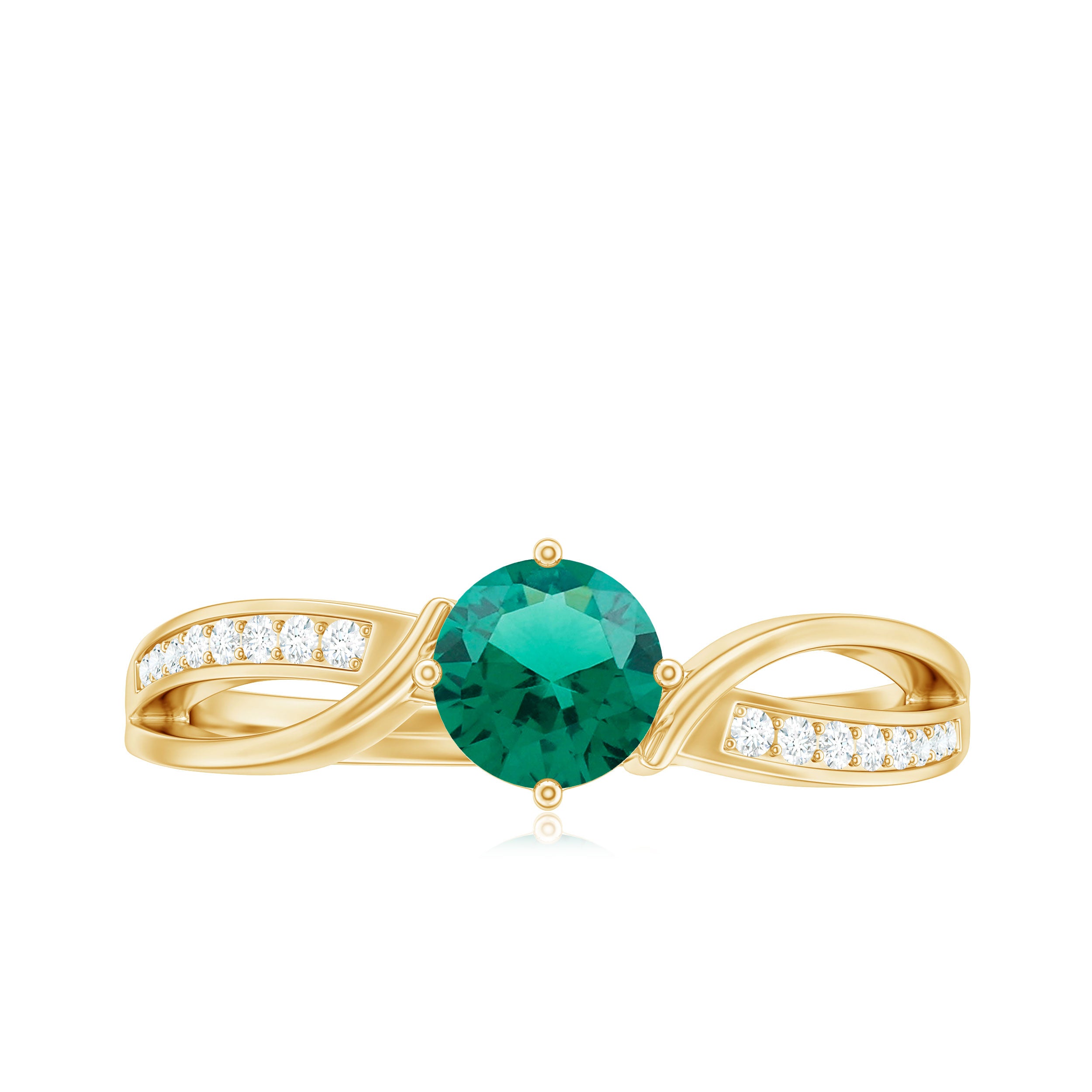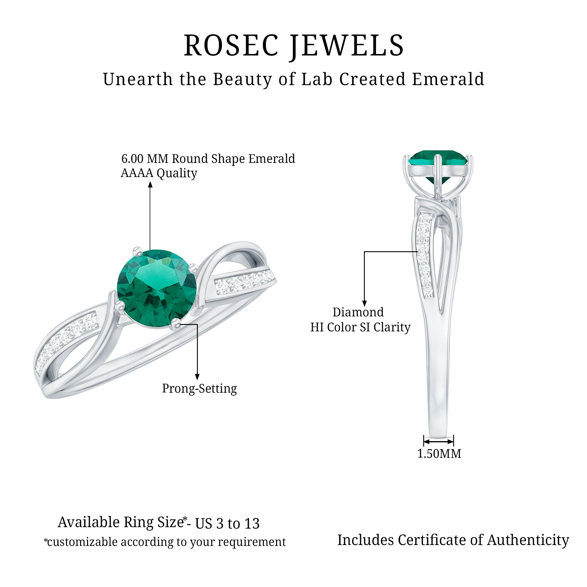Make your love story shine with this elegant Lab Grown Emerald Engagement Ring. At the heart of this design is a rich green 6 mm Round Shape Lab Created Emerald of AAAA Quality set in 4 Prong Diagonal Setting, that steals the spotlight with its vibrant color and timeless beauty. The Lab Emerald sits gracefully at the center of an Infinity Shaped shank, symbolizing eternal love and endless connection. The shank is delicately adorned with dainty HI-SI Diamond stones that sparkle with every movement, adding a touch of glamour without being over the top. This Infinity Engagement Ring is the perfect mix of modern design and meaningful symbolism, making it a beautiful choice for someone who values both style and sentiment. Handcrafted with perfection and attention to detail, this Lab Emerald Diamond Engagement Ring is a ring that is perfect for both special occasions and everyday wear. Whether you are popping the question or celebrating a special milestone, this Lab Emerald Ring for Engagement brings a fresh, trendy feel to a classic engagement look. It is simple, stylish and full of meaning, just like your love.