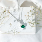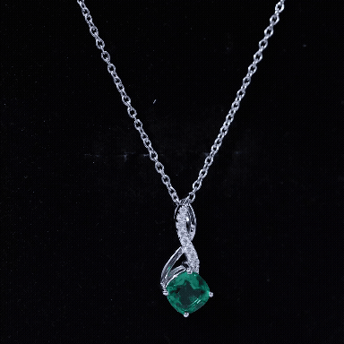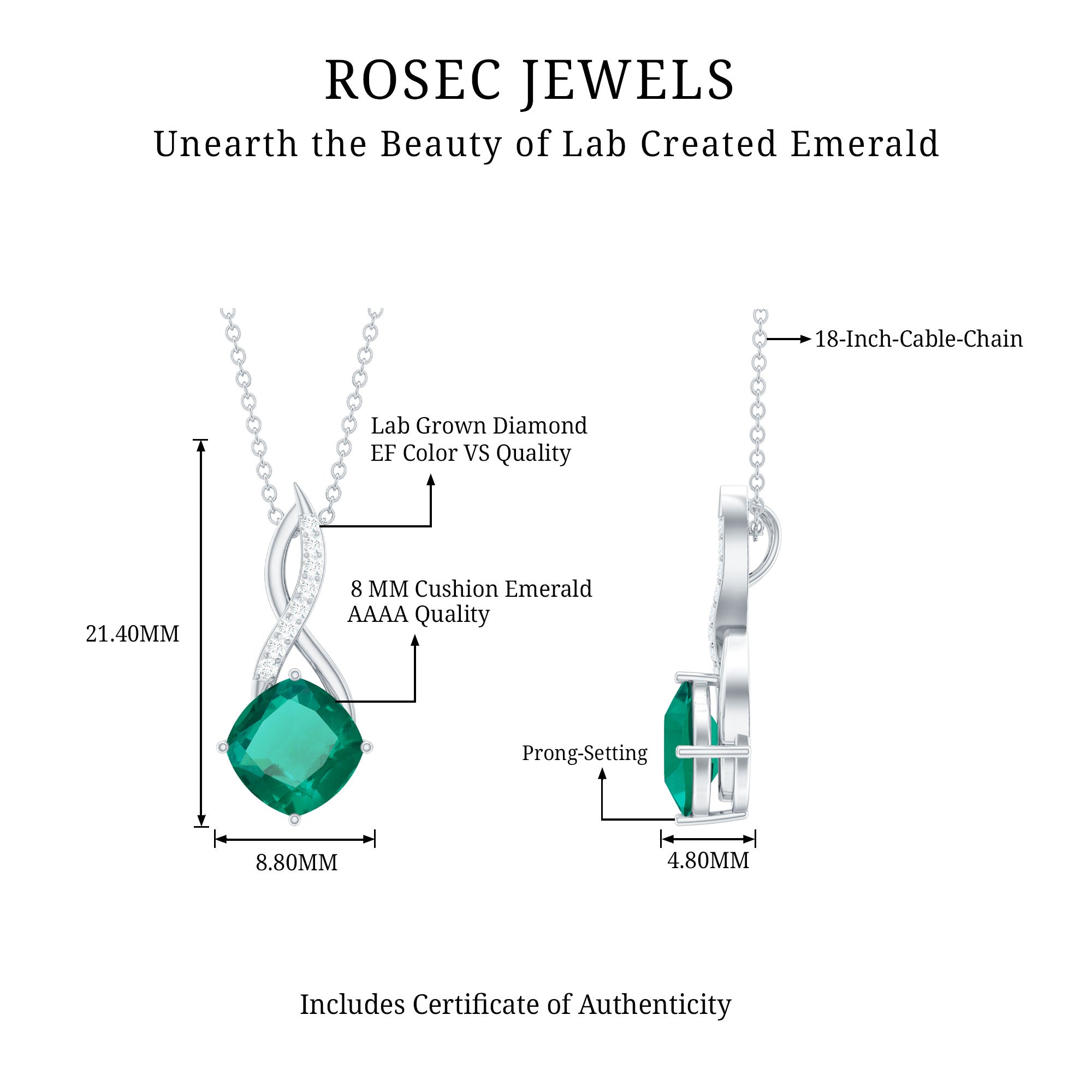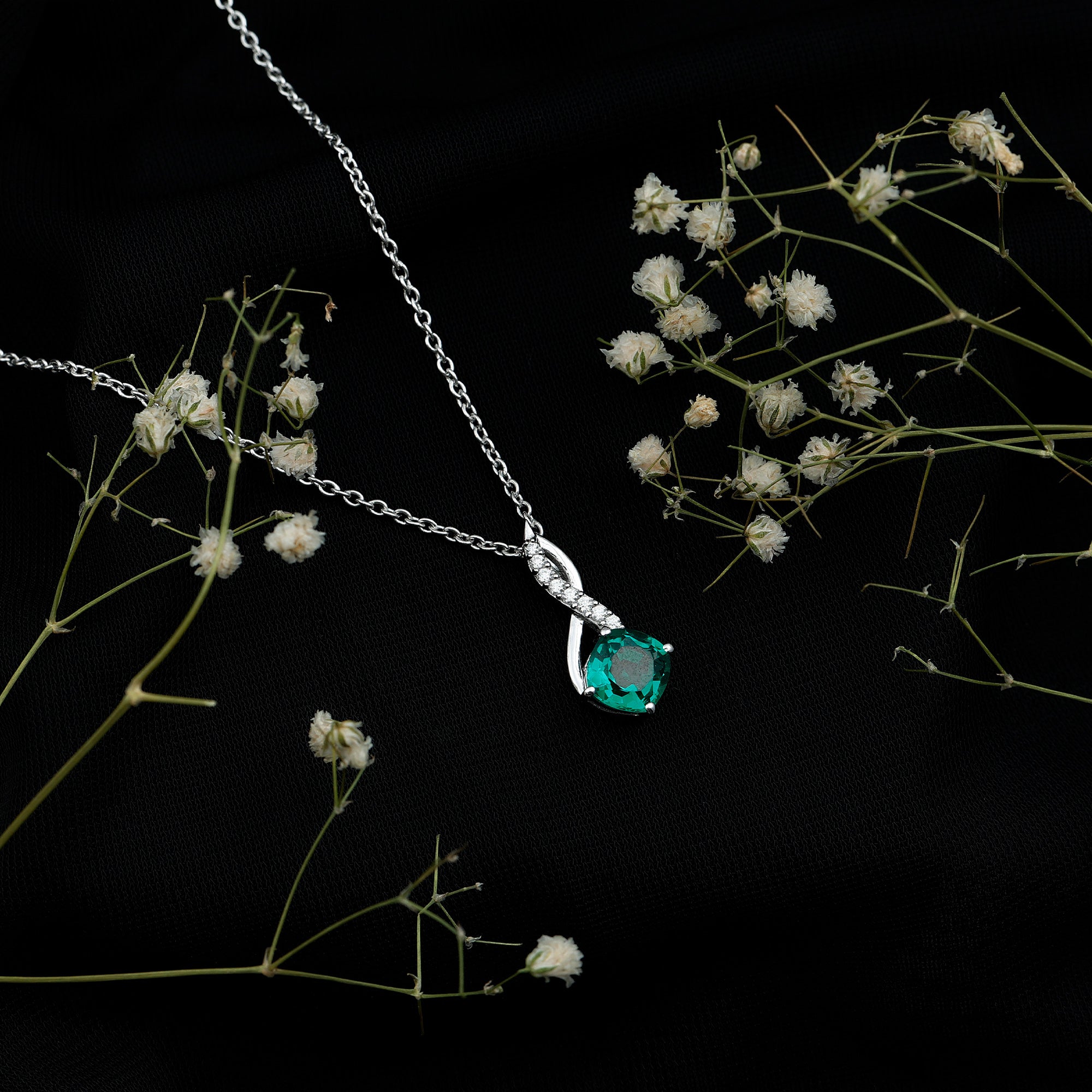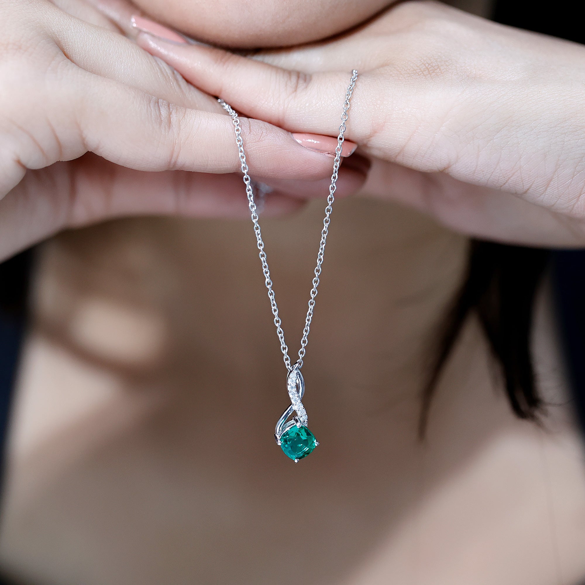 A token of timeless elegance, this Lab Emerald Pendant Necklace is a stunning symbol of love, unity and everlasting beauty. Fashioned in 925 Sterling Silver, the delicate Infinity Knot is adorned with sparkling Lab Grown Diamond stones that shimmer with every movement, while a vibrant 8 mm Cushion Cut Lab Created Emerald set diagonally in Prong Setting adds a pop of rich, captivating color at its center. The thoughtful design combines modern sophistication with classic charm, making it a versatile piece that complements everything from bridal gowns to elegant evening wear. The accompanying silver chain ensures the necklace sits gracefully, highlighting the intricate details without overpowering your outfit. Delivered in a beautiful jewelry box, this Infinity Necklace is ready to gift, making it an ideal choice for weddings, brides, anniversaries or a heartfelt present for someone truly special. This Lab Grown Emerald Necklace is a meaningful keepsake that celebrates love, commitment and the sparkle of cherished moments. Whether worn on your big day or as a statement of everyday elegance, this Lab Emerald Diamond Necklace feels both luxurious and deeply personal, destined to be treasured for years to come.