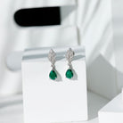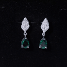 Let your style shine with the calm and charm of nature. These beautiful Lab Grown Emerald Earrings are inspired by the shape of leaves, giving them a soft and elegant look. The top part of each earring is designed with a leaf motif, set with sparkling round cut moissanite stones that shine bright and clear with D-VS1 quality. Hanging from a leaf design is a deep green 6X8 MM pear shaped lab created emerald of AAAA quality set in a secure prong setting and adding a pop of color. These Teardrop Wedding Earrings are handcrafted in 14K white gold plated silver and have a screw back closure to keep them safe and comfortable to wear all day. These Drop Emerald Earrings are lightweight, elegant, and perfect for any occasion - whether it is a festive event, a wedding, or just a day when you want to feel special. Simple, stylish, and nature inspired, these Emerald and Moissanite Earrings are a lovely mix of beauty and meaning.