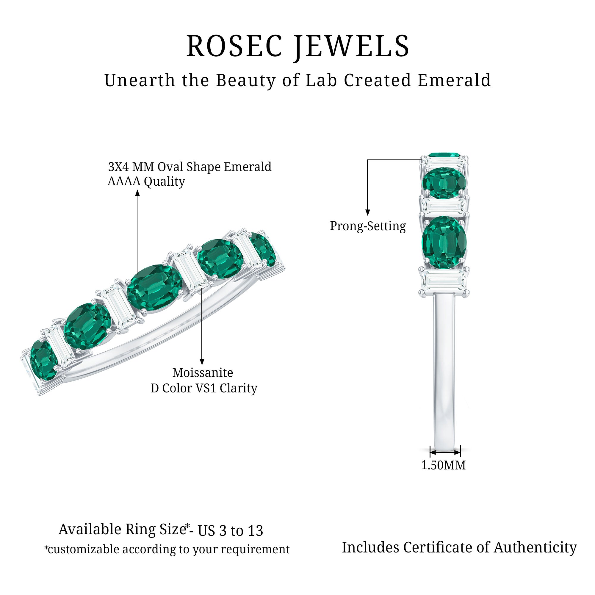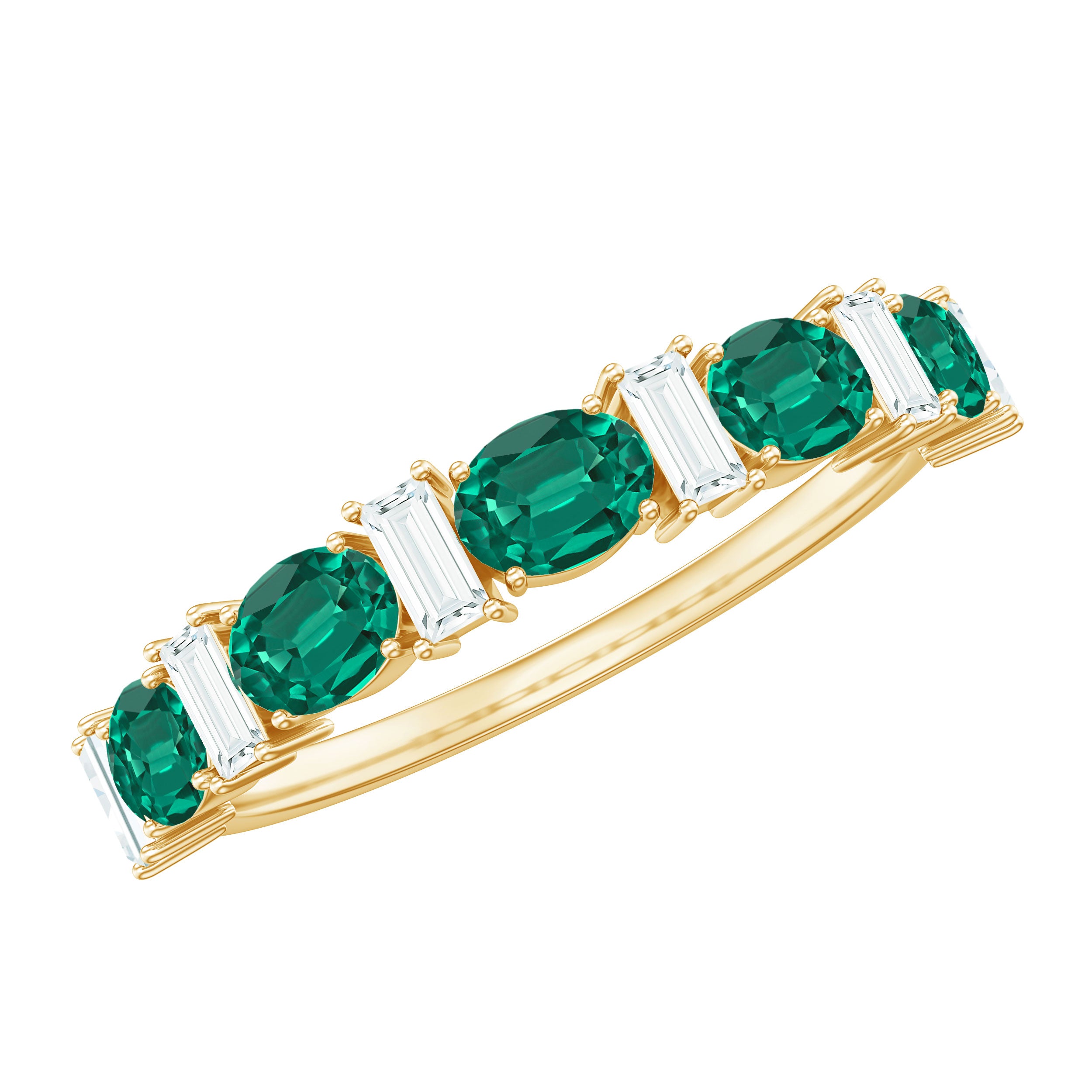 Make a striking style statement with this Half Eternity Band, a design that blends modern artistry with timeless elegance. This unique band showcases lush 3X4 mm Oval Shape Lab Created Emerald stones set horizontally across the ring, their vivid green hue creating a bold yet graceful rhythm. In perfect contrast, vertical Baguette Shape Moissanite stones are placed between the AAAA Quality Lab Emerald stones, their radiant sparkle adds brilliance to the design. The interplay of shapes, oval and baguette, horizontal and vertical, creates a captivating balance that feels fresh, contemporary and unforgettable. Crafted in a half eternity style, this Lab Emerald Anniversary Band ensures both comfort and everyday wearability while still making an undeniable statement of luxury. Ideal as a wedding band, anniversary ring or a distinctive stackable piece, this Wedding Anniversary Ring offers versatility while standing out on its own. With its detailing and harmonious fusion of Lab Emerald and Moissanite, this Half Eternity Wedding Band is a modern masterpiece that reflects individuality, elegance and a love designed to shine without end.