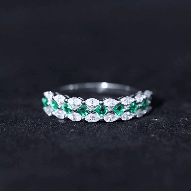 Captivate hearts on your special day with the stunning Half Eternity Wedding Band, a perfect blend of elegance, meaning, and brilliance. The design features a beautiful center row of 3 mm Princess Cut Lab Created Emerald stones, set diagonally in Prong Setting to create a unique and eye-catching pattern. On either side of the Lab Emerald row, Marquise Shape Moissanite stones are placed horizontally, adding extra sparkle and a touch of sophistication. The combination of Lab Grown Emerald and Moissanite creates a stunning contrast of color and light, making the Half Eternity Band stand out with graceful charm. Available in various ring sizes from 3 to 13, this Lab Grown Emerald Ring is designed to fit comfortably and complement your engagement ring perfectly or stand beautifully on its own. This Princess Cut Emerald Ring comes elegantly packaged in a jewelry box, ready to be gifted as a treasured keepsake. Whether exchanged on your wedding day or given as a symbol of everlasting love, this Emerald Wedding Band will surely be the perfect choice for her, a radiant reminder of your shared journey and the promise of forever.