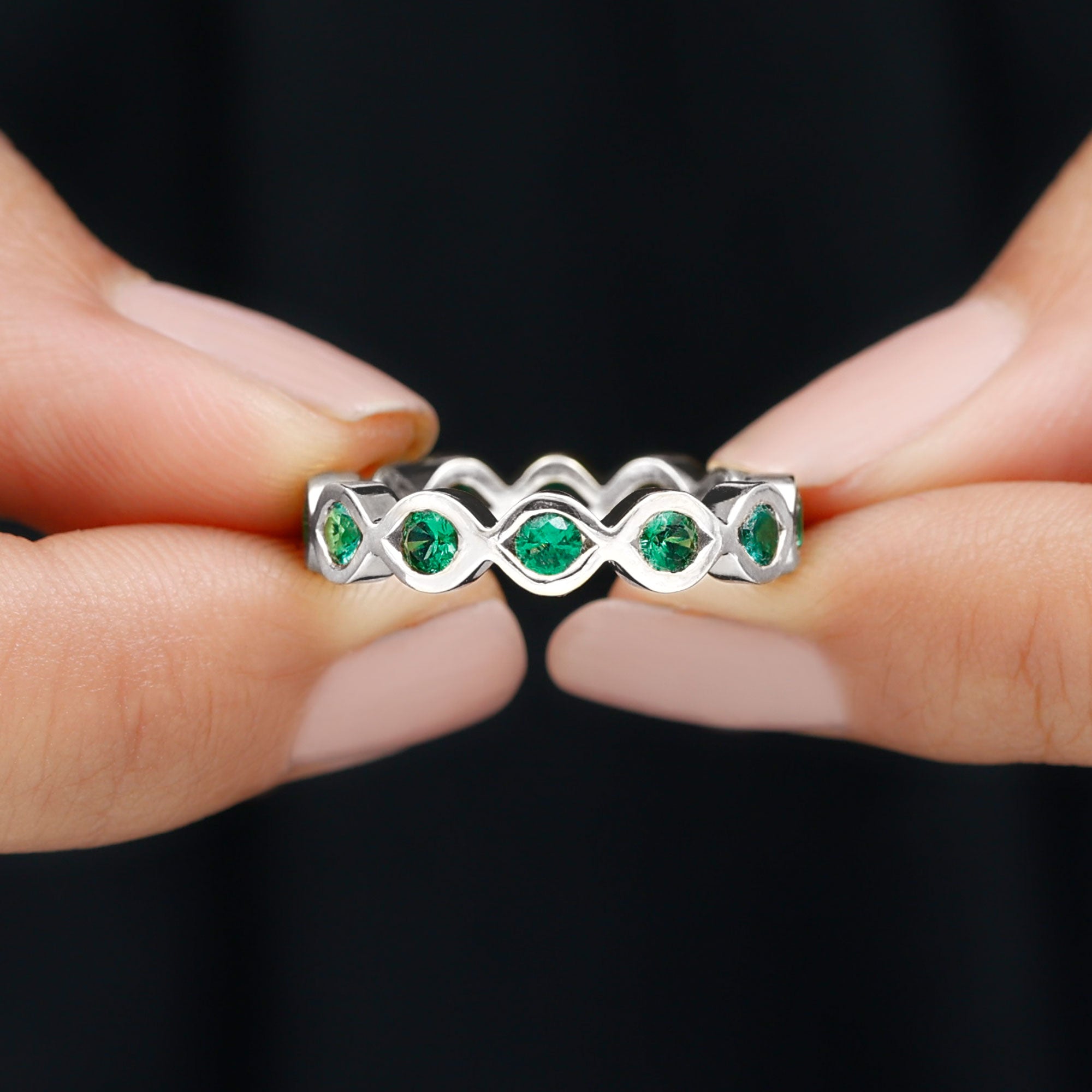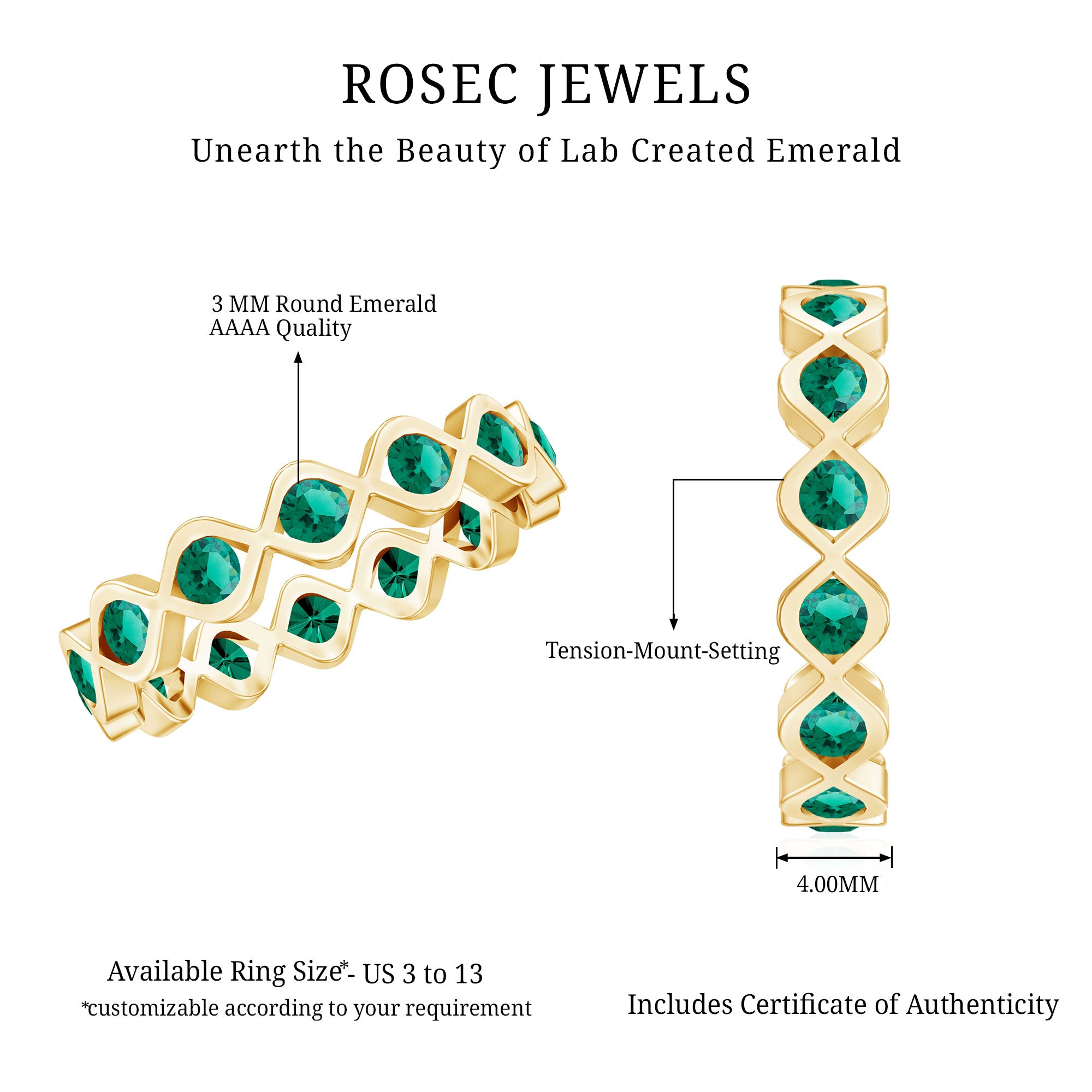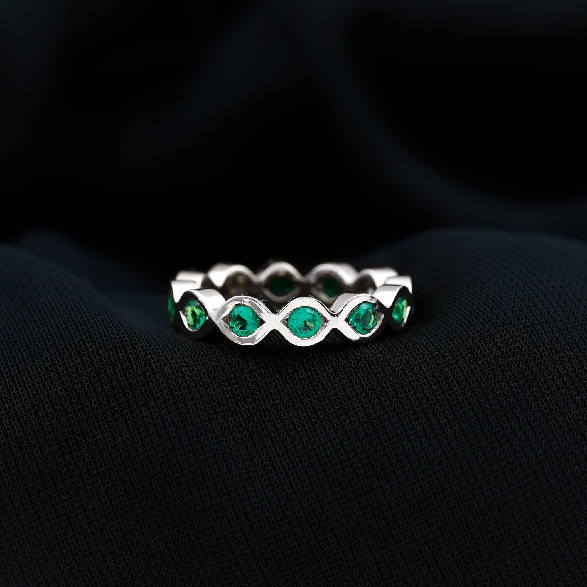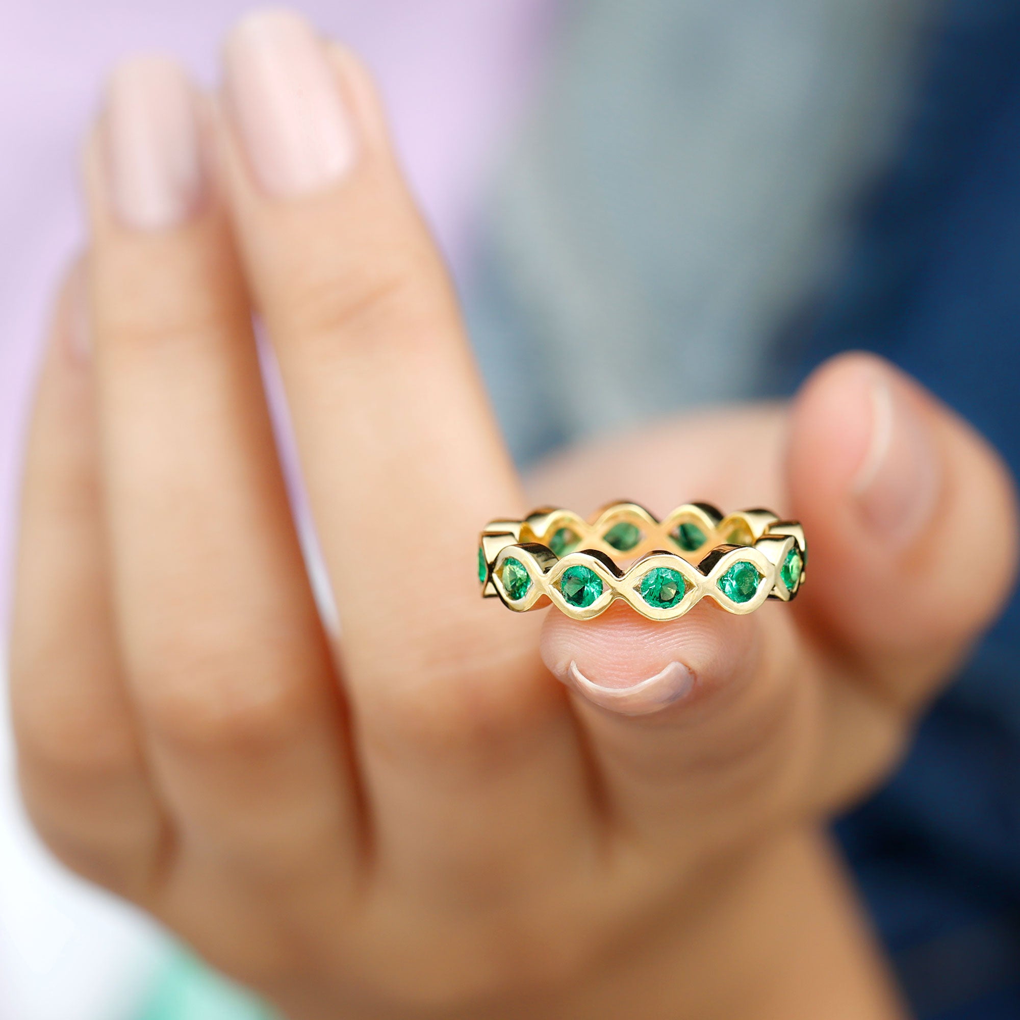 An eternal bond deserves a ring that tells its story. This Full Eternity Ring beautifully symbolizes endless love and infinite togetherness. The Infinity design represents the unbroken connection between two souls, a continuous loop with no beginning or end. The vivid green Lab Grown Emerald stones of AAAA Quality woven into the twist add life and hope to this meaningful Infinity Band Ring, while the full eternity style signifies commitment that lasts forever. Crafted with perfection, this Fine Band Ring features 3 mm Round Shape Lab Emerald set continuously around the band that creates a seamless flow of color. The twist detail adds a modern and artistic touch and also enhances the sparkle of the Lab Emerald stones from every angle. Perfect for marking special moments such as anniversaries, weddings or milestones in your journey together, this Lab Emerald Eternity Band is a lasting symbol of devotion. Delivered in a sophisticated jewelry box and available in various ring sizes, this Lab Grown Emerald Ring makes a thoughtful and timeless gift that will be cherished for a lifetime.