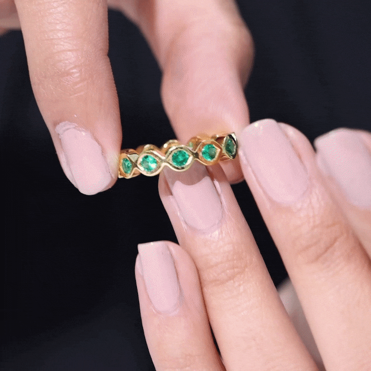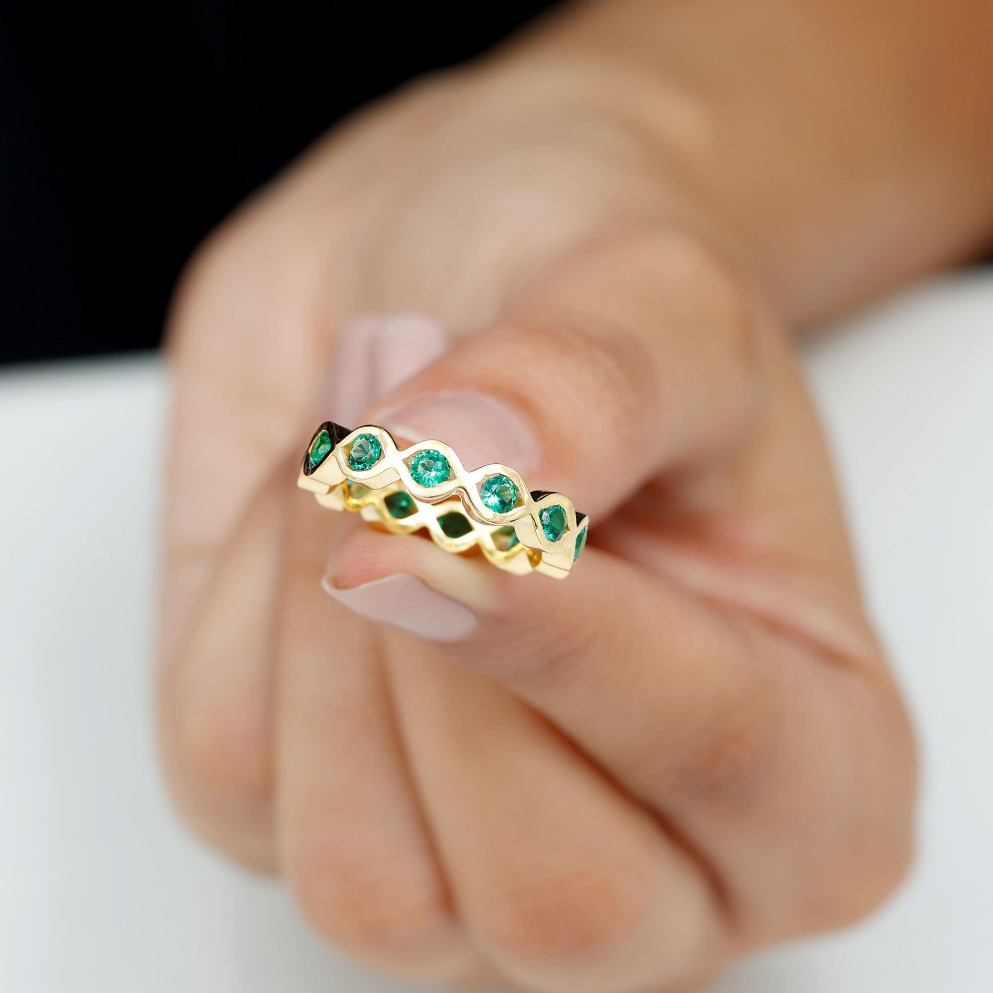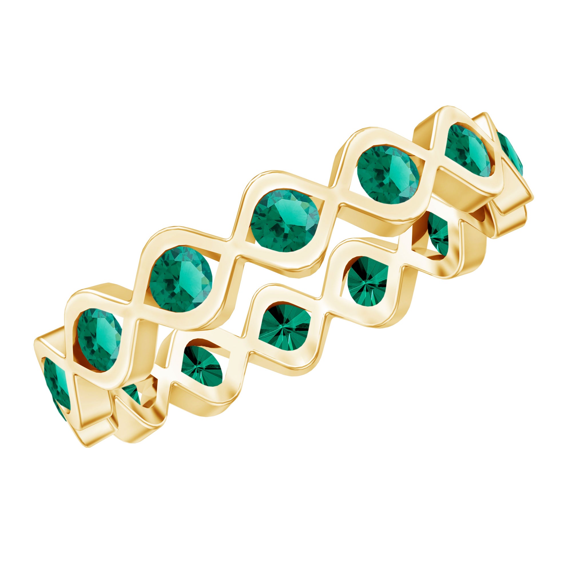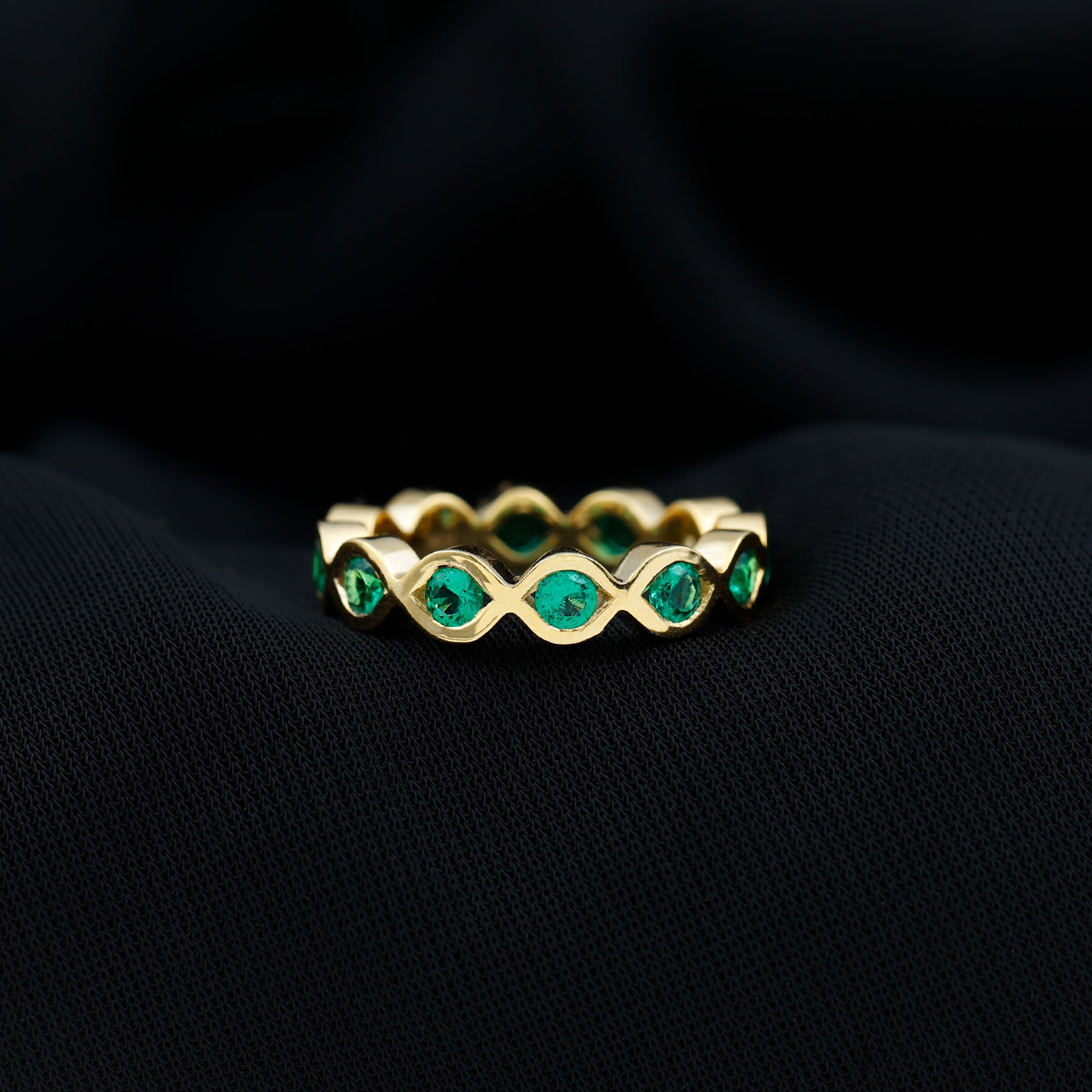 An eternal bond deserves a ring that tells its story. This Full Eternity Ring beautifully symbolizes endless love and infinite togetherness. The Infinity design represents the unbroken connection between two souls, a continuous loop with no beginning or end. The vivid green Lab Grown Emerald stones of AAAA Quality woven into the twist add life and hope to this meaningful Infinity Band Ring, while the full eternity style signifies commitment that lasts forever. Crafted with perfection, this Fine Band Ring features 3 mm Round Shape Lab Emerald set continuously around the band that creates a seamless flow of color. The twist detail adds a modern and artistic touch and also enhances the sparkle of the Lab Emerald stones from every angle. Perfect for marking special moments such as anniversaries, weddings or milestones in your journey together, this Lab Emerald Eternity Band is a lasting symbol of devotion. Delivered in a sophisticated jewelry box and available in various ring sizes, this Lab Grown Emerald Ring makes a thoughtful and timeless gift that will be cherished for a lifetime.