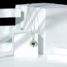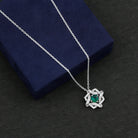 Discover the timeless charm of our Emerald Pendant Necklace, made from stunning 14k white gold plated sterling silver. This piece is embellished with sparkling moissanite stones and a lush green lab emerald, designed to leave a lasting impression and elevate any outfit. The pendant showcases a graceful interlock design, featuring a prong set 6 MM round cut lab-created emerald at its center, surrounded by interlocked geometric frames adorned with tiny moissanite gems. With its subtle elegance, this Lab Grown Emerald Necklace beautifully highlights your unique style. The deep green hue of the AAAA quality lab emerald radiates sophistication and allure, making it the perfect accessory for any occasion. This Designer Emerald Necklace is not only great for everyday wear but also serves as a stylish statement for cocktail parties, a thoughtful gift for birthdays, anniversaries, or Valentines Day for someone special, or even as a stunning addition to your wedding day look for a striking contrast.