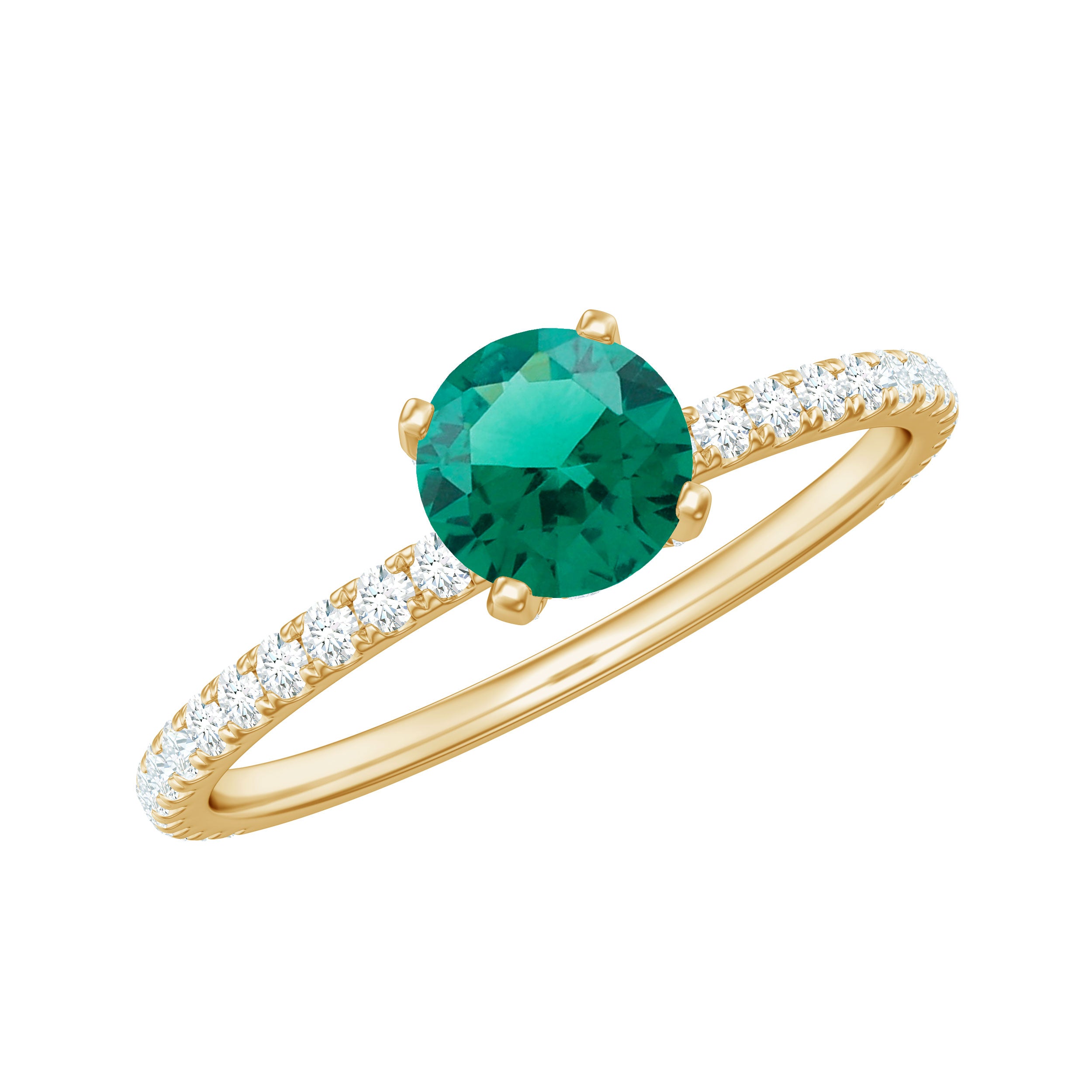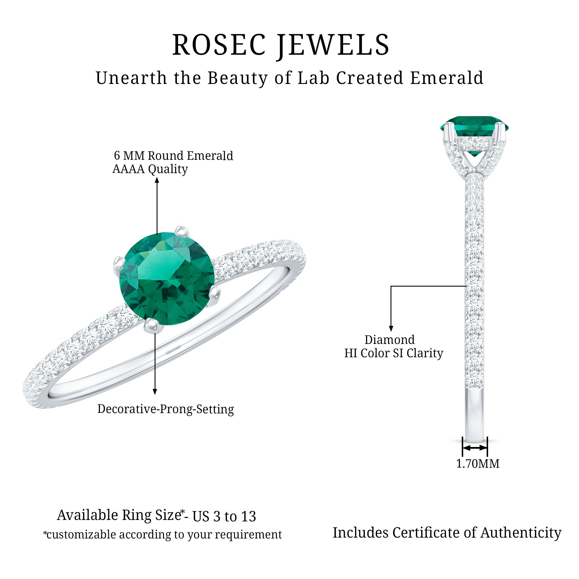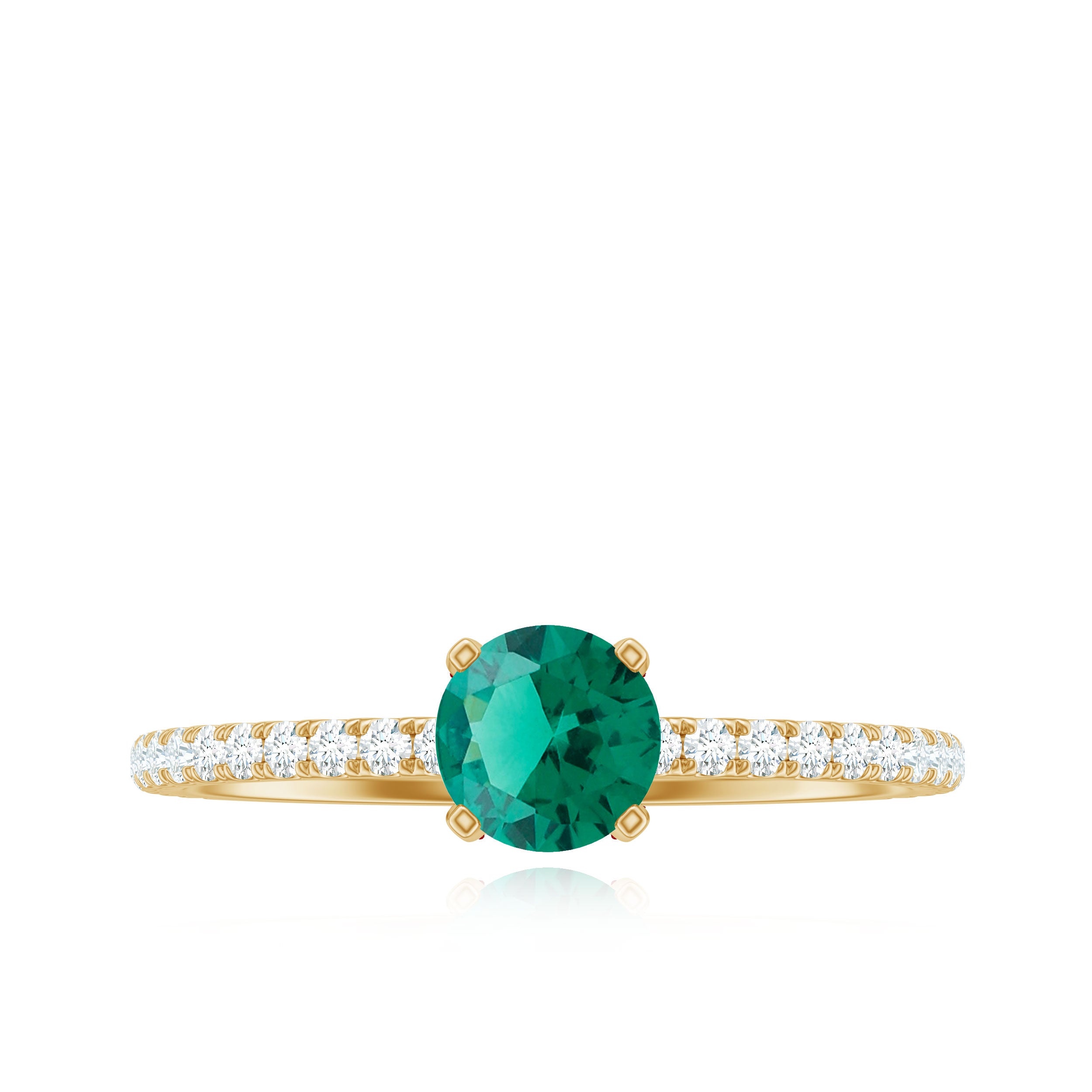 Make a bold and unforgettable statement with this mesmerizing Solitaire Engagement Ring, where timeless elegance meets modern luxury. At the center of this Fine Engagement Ring lies a vibrant 6 mm Round Shape Lab Created Emerald, known for its rich green hue and exceptional clarity. Set in Prong Setting adorned with dainty Diamond stones, the Lab Emerald takes center stage, a striking symbol of love, growth and new beginnings. The band is delicately accented with a row of shimmering Diamond stones, adding just the right amount of sparkle without stealing the show. This Lab Grown Emerald Engagement Ring is effortlessly elegant and endlessly romantic. Perfect for the woman who embraces color and craves individuality, this Emerald Diamond Engagement Ring is a fresh take on the classic solitaire. This Lab Created Emerald Ring is ideal for engagements and also makes a stunning statement for anniversaries or special milestones. Crafted with perfection, this Lab Emerald Solitaire Ring is as ethical as it is exquisite. Arrives in a signature jewelry box and is available in a range of sizes to ensure the perfect fit. If you are ready to pop the question with a ring that is as vibrant and unforgettable as your love story, this is the one.