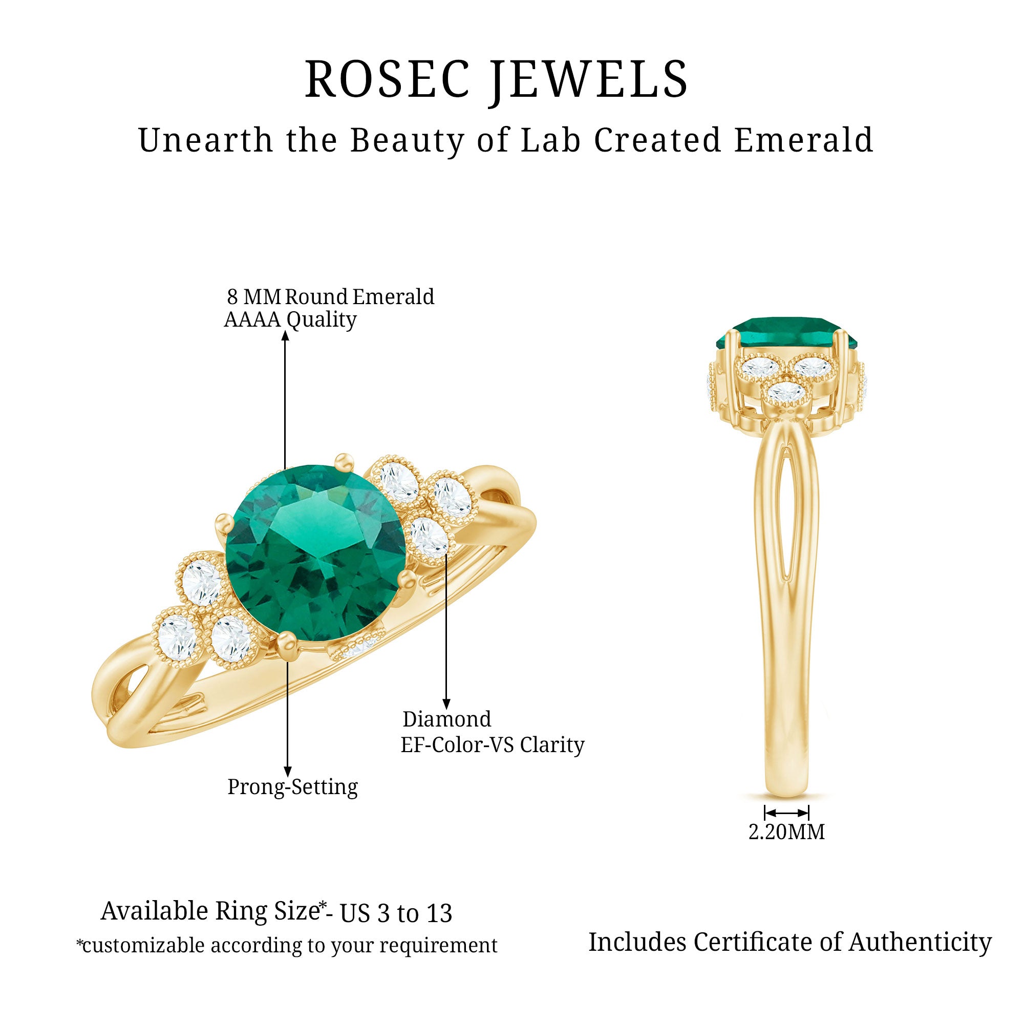 Dazzle up your love story with this Designer Engagement Ring showcasing a 8 mm Round Shape Lab Created Emerald that takes center stage, complemented by a Trio of Lab Grown Diamond gemstones in the Emerald Diamond Ring set on either side with Beaded Embellishment. Elevate your commitment with a symbol as timeless as your love that sparkle with Aaaa Quality Emerald and Ef-Vs Quality Diamonds. Trust Rosec Jewels for unparalleled craftsmanship and ethical sourcing, making every moment sparkle with this Classic Ring.