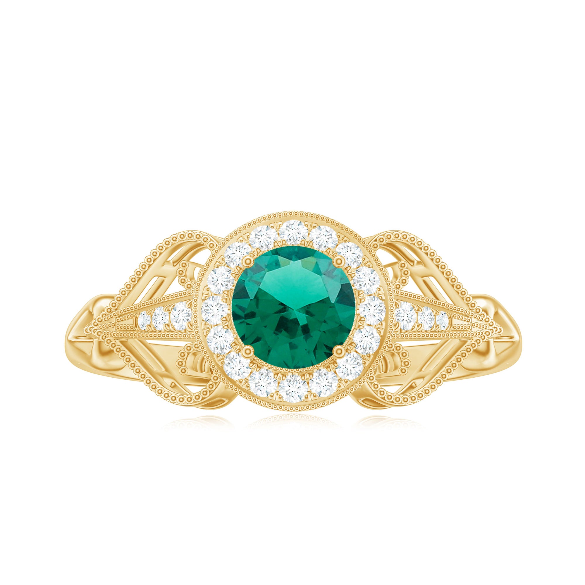 Handcrafted with perfection and attention to detail, this Vintage Looking Engagement Ring honors the past without sacrificing contemporary style. Capturing the grace of the bygone era, this Fine Engagement Ring features a 6 mm Round Shape Lab Created Emerald of AAAA Quality as the center stone set in Prong Setting, surrounded by a sparkling Halo of HI-SI Diamond stones, enhancing its vibrant green hue and adding radiant brilliance. The vintage style band of this Lab Grown Emerald Ring is thoughtfully designed to echo timeless romance, adorned with delicate Beaded Detailing that adds texture and a touch of antique flair. The band is further embellished with shimmering, dainty Diamond stones, set gracefully along the shoulders to create a continuous sparkle from every angle. This Lab Grown Emerald Diamond Ring is a perfect tribute to enduring love and timeless style. Whether as a heartfelt proposal or a meaningful anniversary gift, this Vintage Emerald Engagement Ring is sure to become a cherished heirloom for generations to come.