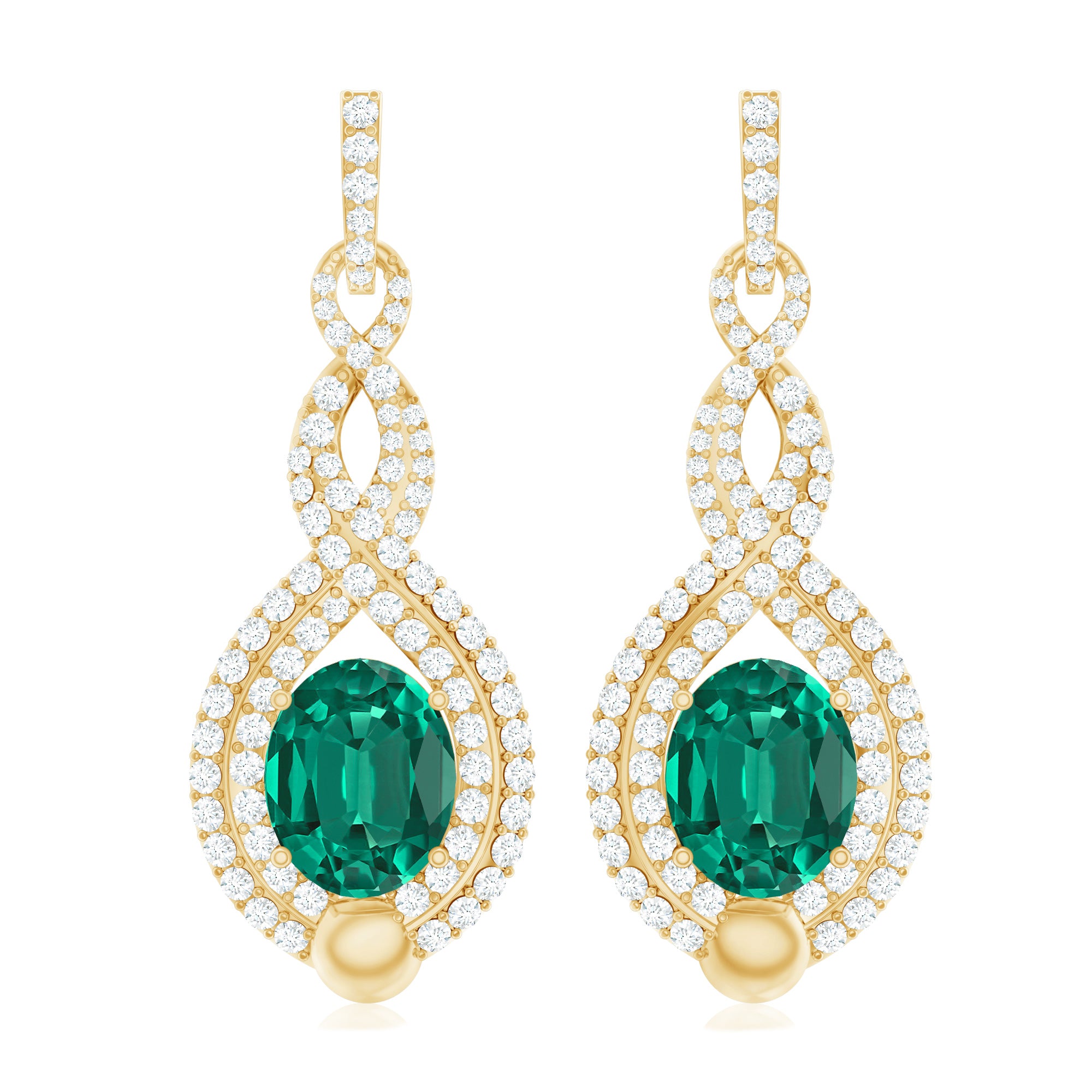 Celebrate your growing love with our Created Emerald Drop Earrings. The 8x10mm Oval Shaped Emerald makes a bold statement, complemented by Round Diamond for a complete, elegant look. Versatile and beautiful, these Infinity Earrings adds grace to any attire. Experience the fusion of natures green allure and the timeless dazzle of Aaaa Quality Emerald and Ef-Vs Quality Diamond, a symphony of luxury, prosperity, and enduring love. Elevate your elegance with the Emerald Diamond Earrings, embrace the benefits of Emerald and Diamond fusion, where beauty knows no bounds. Rosec Jewels specializes in crafting show-stopping pieces with Certified Lab Grown Gemstones. Check it out and indulge in timeless elegance.