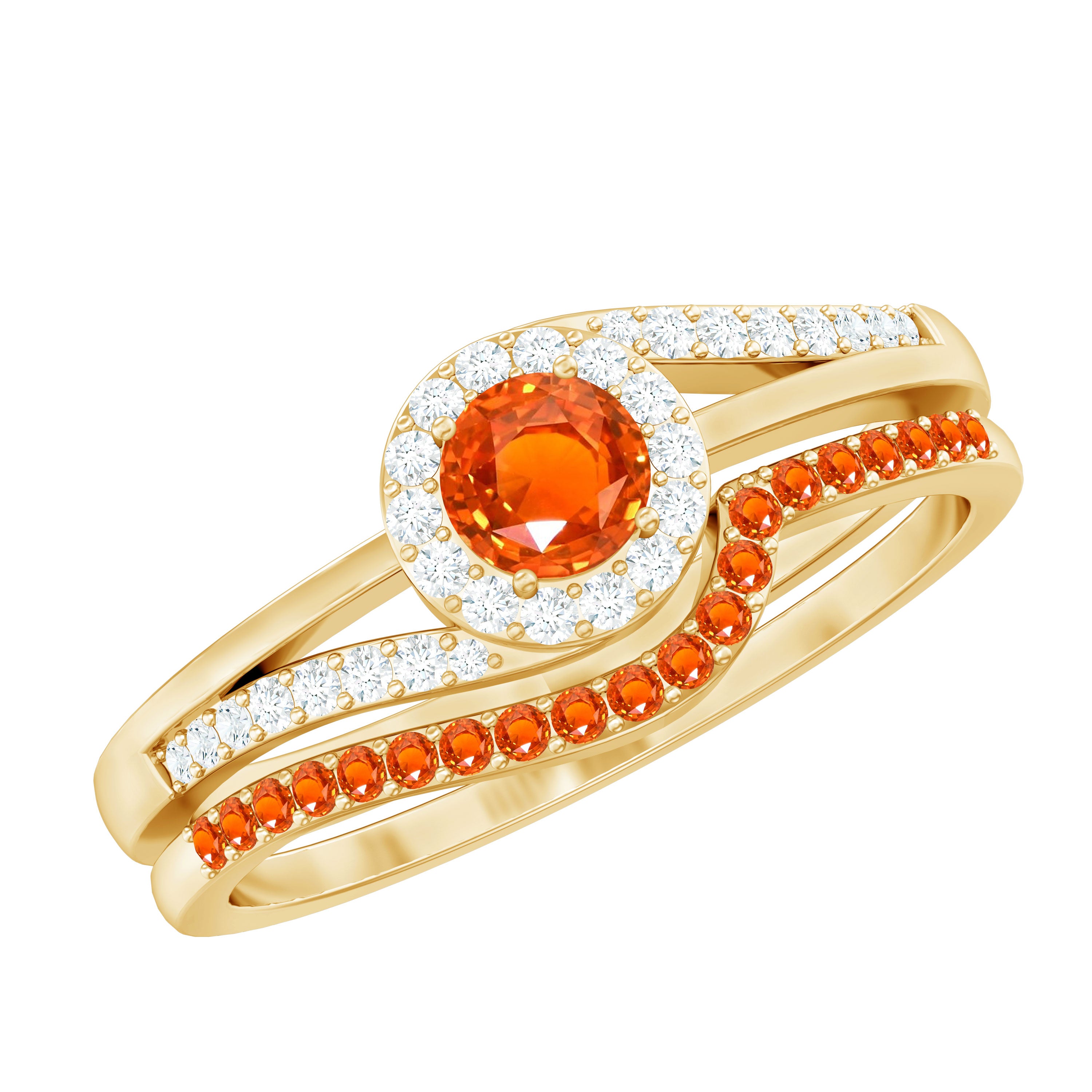 Make your special day unforgettable with this radiant Wedding Bridal Ring Set, designed to celebrate love in its most joyful form. This stunning set of 2 brings together warmth, sparkle and modern elegance in a way that feels both meaningful and unforgettable. The Engagement Ring features a glowing 5 mm Round Shape Lab Created Orange Sapphire set in Prong Setting at its center, surrounded by a shimmering Diamond Halo that amplifies its fiery brilliance. The Bypass Shank, delicately adorned with Diamond stones, adds graceful movement and a contemporary touch, symbolizing two lives beautifully intertwined. Paired with it, the Enhancer Ring shines with Lab Created Orange Sapphire stones, perfectly complementing the engagement ring and creating a bold yet harmonious look. This Lab Orange Sapphire Wedding Ring Set tells a story of passion, commitment and a future filled with light. Presented in a signature jewelry box and available in a range of sizes, this Wedding Engagement Ring Set is ready to mark one of the most meaningful moments of life. Whether exchanged as wedding bands or gifted to celebrate a lasting promise, this Lab Orange Sapphire Diamond Engagement Ring with Enhancer is a vibrant expression of love, devotion and the magic of beginning forever together.
