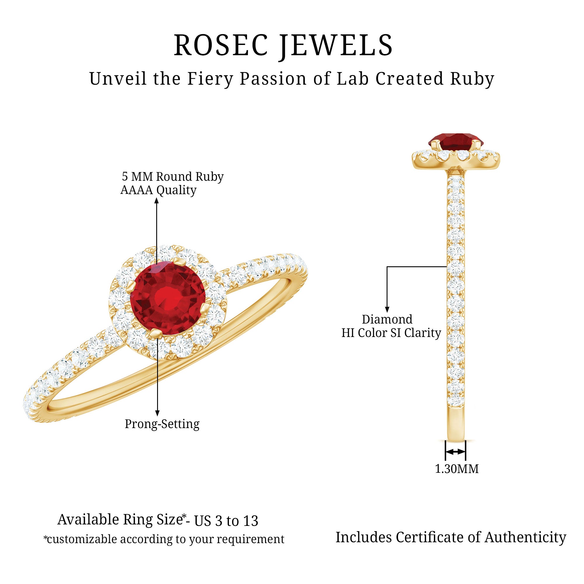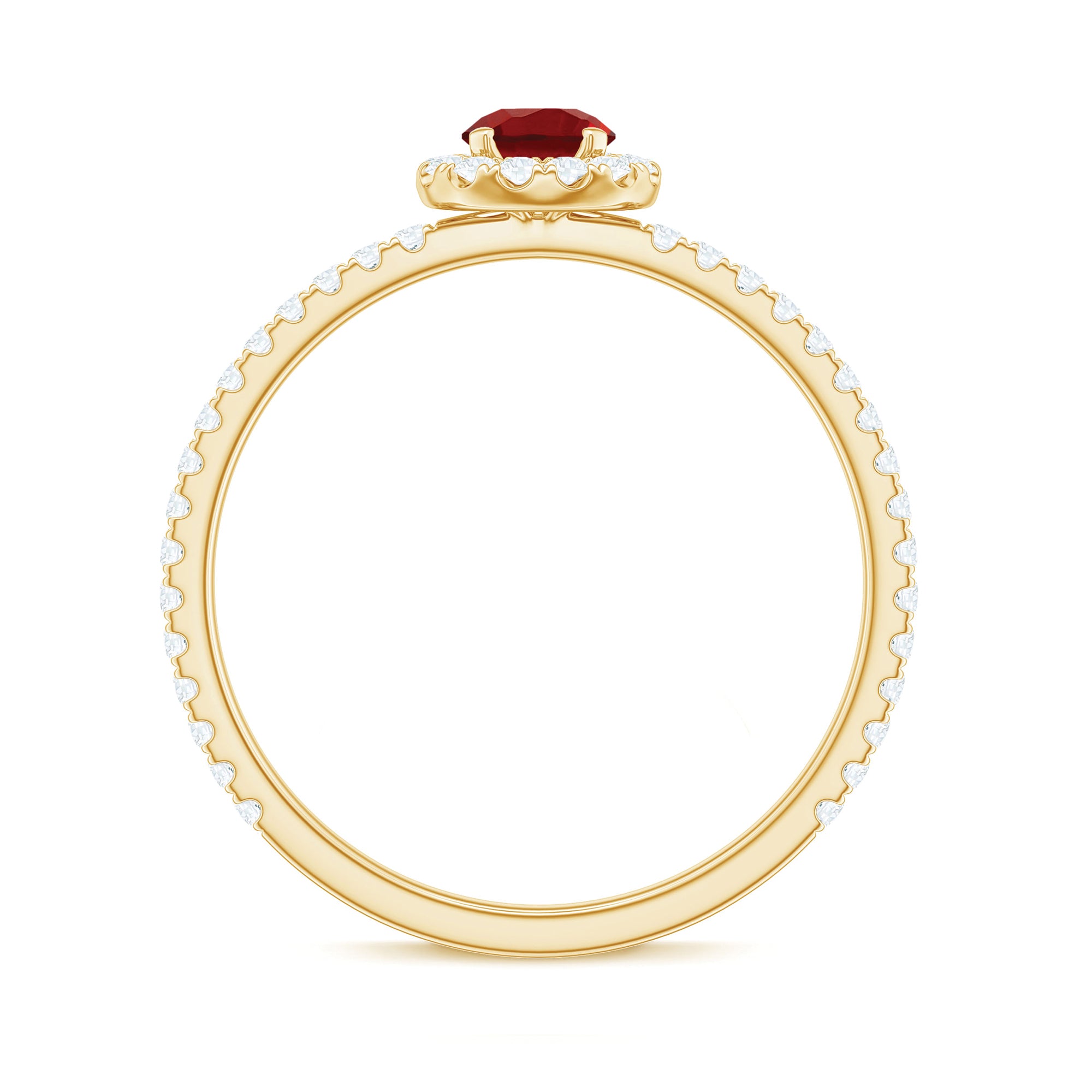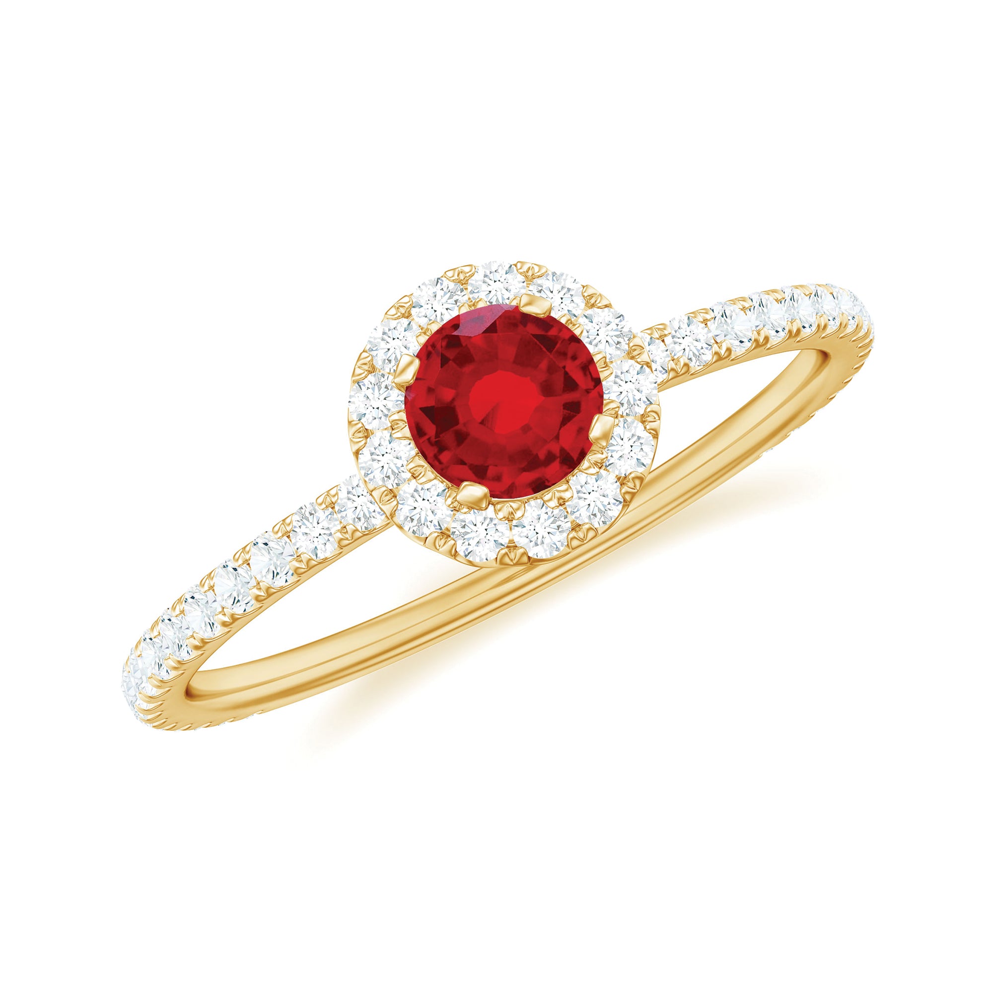 Let your love shine in every little detail with this Ruby and Diamond Ring that is made to turn heads. This Ruby Engagement Ring is designed for those who want something meaningful and full of beauty. It is curated with a 5 MM round lab created ruby, full of deep color and warmth. It is held in a secure prong setting and surrounded by a halo of round diamonds, giving the Lab Created Ruby Ring a bright and radiant look that catches the light from all sides. The diamonds continue down the band in a delicate line, adding extra shine. This Halo Engagement Ring blends timeless design with a touch of modern charm. It is perfect for someone who loves classic styles but wants a little extra sparkle and personality. Whether you are getting engaged or marking a love that is special, this Ruby and Diamond Engagement Ring is a beautiful way to show how much she means to you. It is available in multiple sizes and comes ready to gift in a thoughtfully designed jewelry box. Full of color, light, and meaning, this ring is a lasting reminder of love that stands strong and shines bright, day after day.