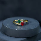 Celebrate love and connection with this meaningful Heart Shaped Promise Ring, a beautiful symbol of you and me. Thoughtfully crafted in Gold Plated Sterling Silver, this romantic Two Stone Ring features a striking pairing of 5 mm Heart Shaped Lab Created Ruby and Lab Created Emerald, representing two hearts, two souls and one unbreakable bond. The vibrant Lab Ruby stands for passion and love, while the lush green Lab Emerald symbolizes harmony and growth, together creating a powerful story of unity and balance. Placed beside each heart is a dainty Lab Grown Diamond, adding just the right amount of sparkle without overpowering the design. This Ruby and Emerald Ring is an ethical and eco-friendly expression of commitment. The modern bypass band gently wraps around both stones, showcasing your journey and the path you are taking together. Whether you are making a promise, celebrating a pre-engagement or simply marking a meaningful chapter in your relationship, this Toi et Moi Ring is a heartfelt gesture that speaks of love, loyalty and responsibility.