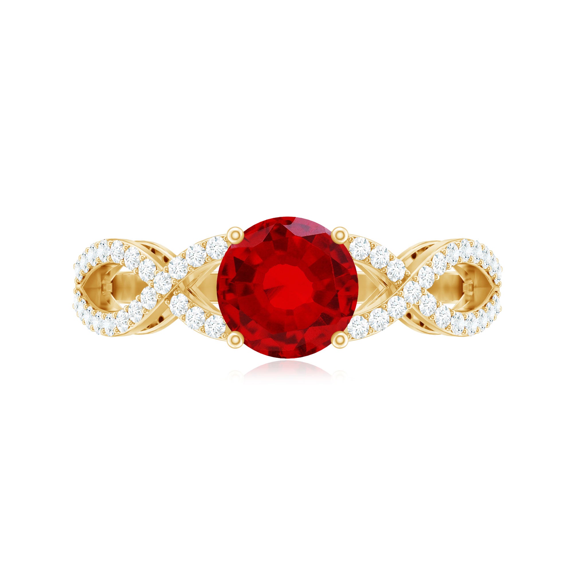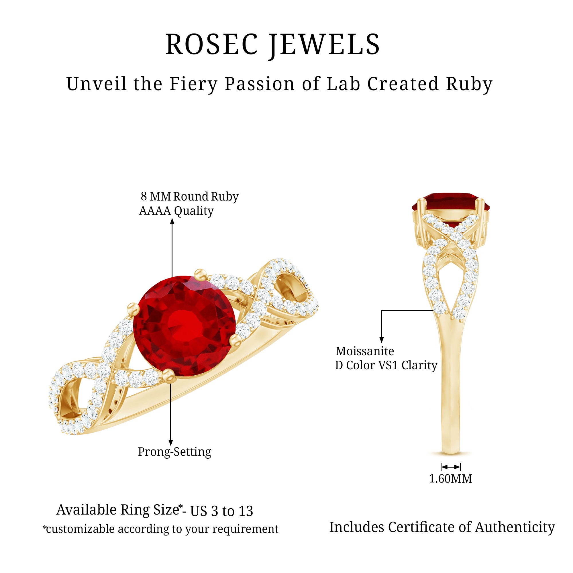 Begin a new chapter of love with this stunning Lab Created Ruby Ring, a perfect mix of elegance and meaning. At its center sparkles an 8 MM round cut lab grown ruby, securely held in prong setting that highlights its red color and natural brilliance. The ruby symbolizes love, strength, and passion, making it a beautiful choice for an engagement. The Ruby Solitaire Ring features a graceful crossover shank, representing two paths joining as one, just like two hearts coming together. This intertwined design gives the Ruby Engagement Ring a romantic and symbolic touch, while delicate moissanite stones along the band add subtle sparkle and refinement. Each stone catches the light beautifully, enhancing the glow of AAAA quality lab ruby without taking away from its charm. Crafted with precision and care, this Criss Cross Engagement Ring combines timeless beauty with a modern design. Perfect for engagements or meaningful gifts, this Ruby and Moissanite Ring captures the essence of connection and everlasting love.