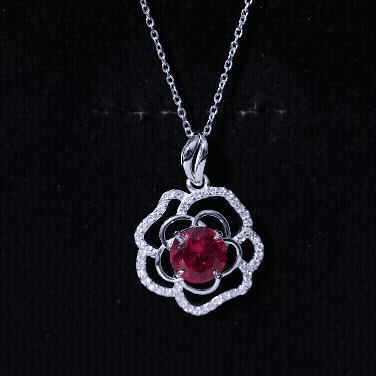 Certified Lab Grown Ruby Rose Pendant Necklace with Diamond Accent