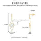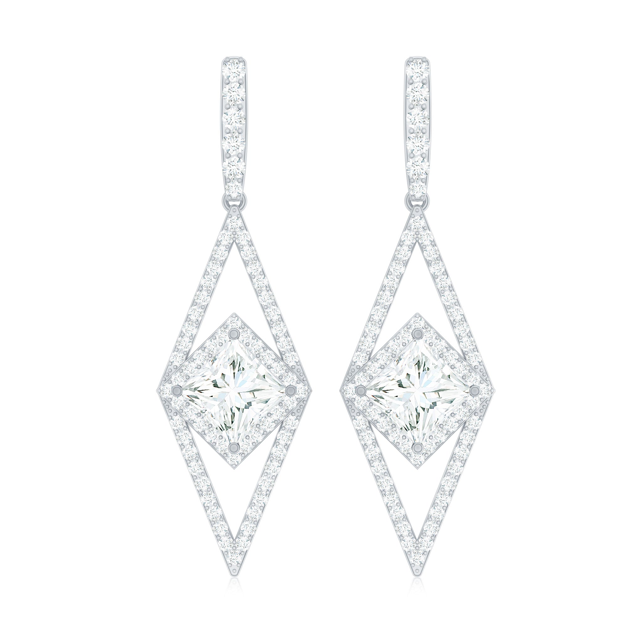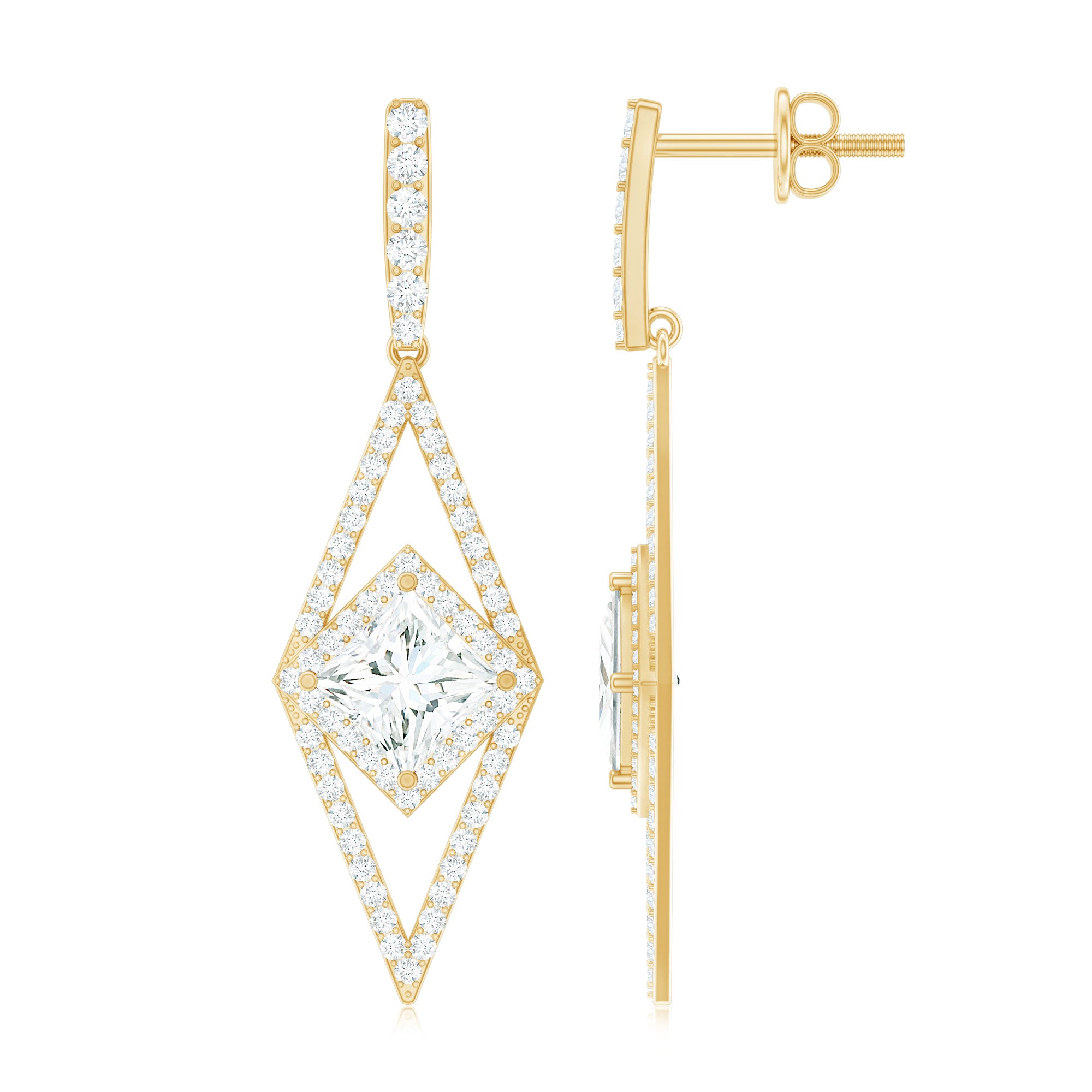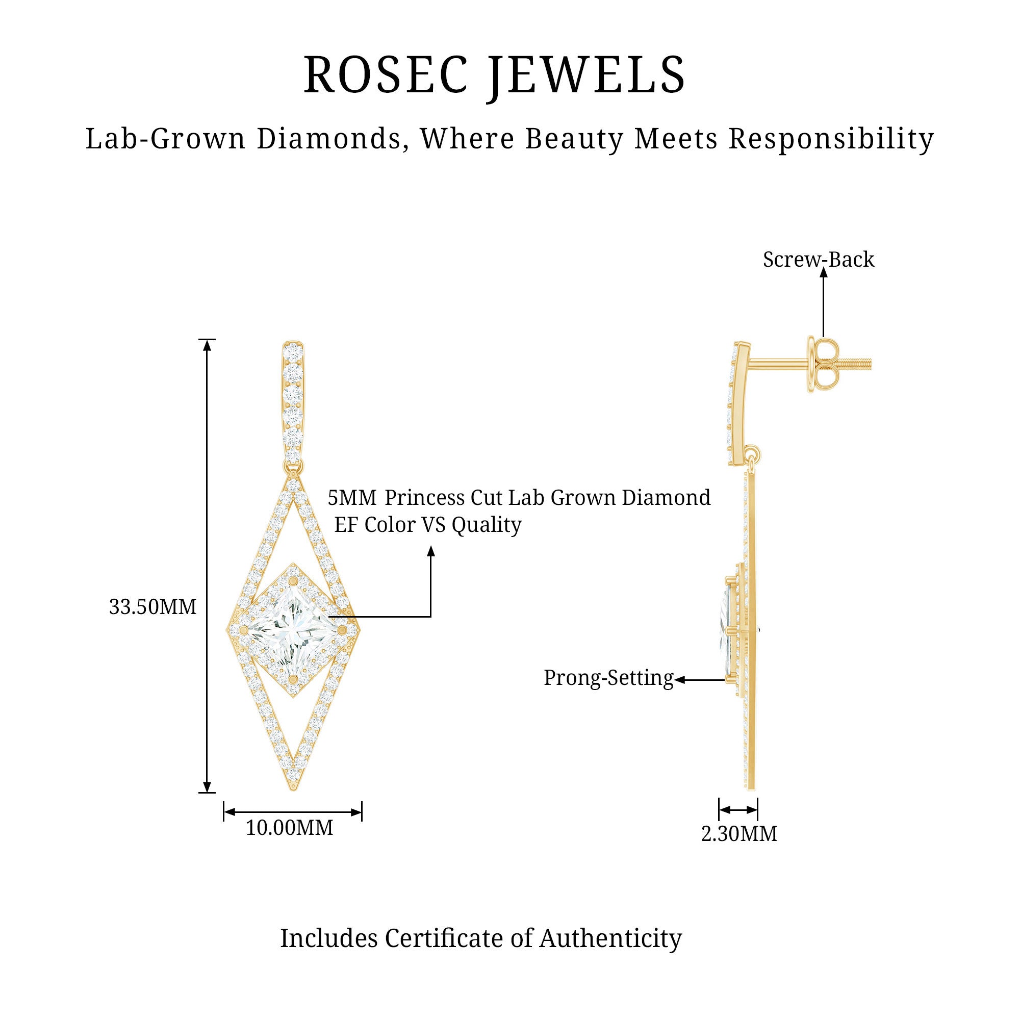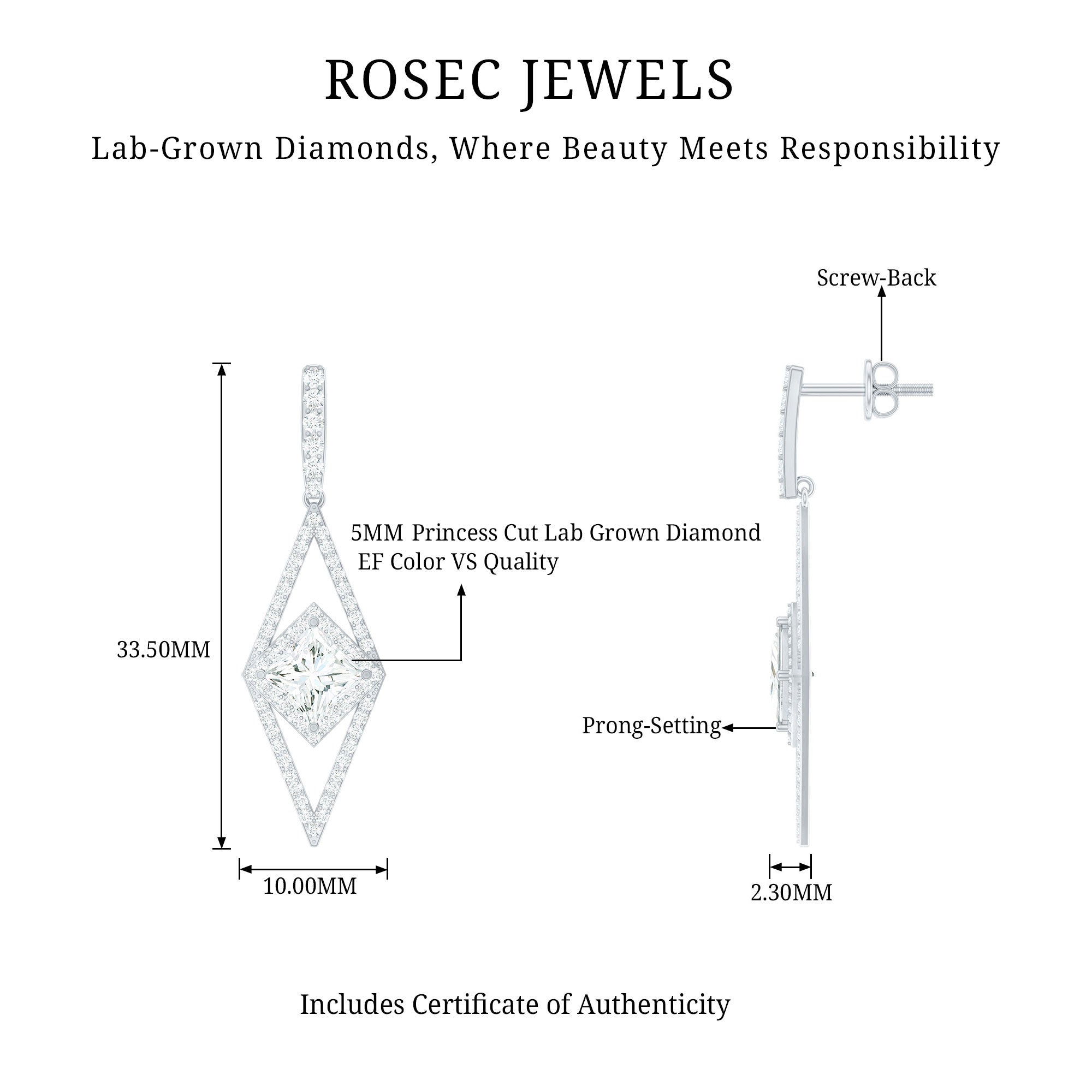 Bring out your gorgeous look with these Dangle Earrings featuring a diagonally set 5 mm Princess cut Diamond (Lab Grown) set in a Prong Setting and encircled by a halo of dainty gemstones, secured with Screw Back Closure. These ethically crafted Diamond Earrings for Women are further accentuated by round cut diamonds of Ef-Vs quality in a geometric shape and on a bar at the top, showcasing the perfect blend of minimalism and elegance. Rosec Jewels is committed to sustainable practices, ensuring these Bridal Earrings reflect both refined beauty and eco-conscious values.
