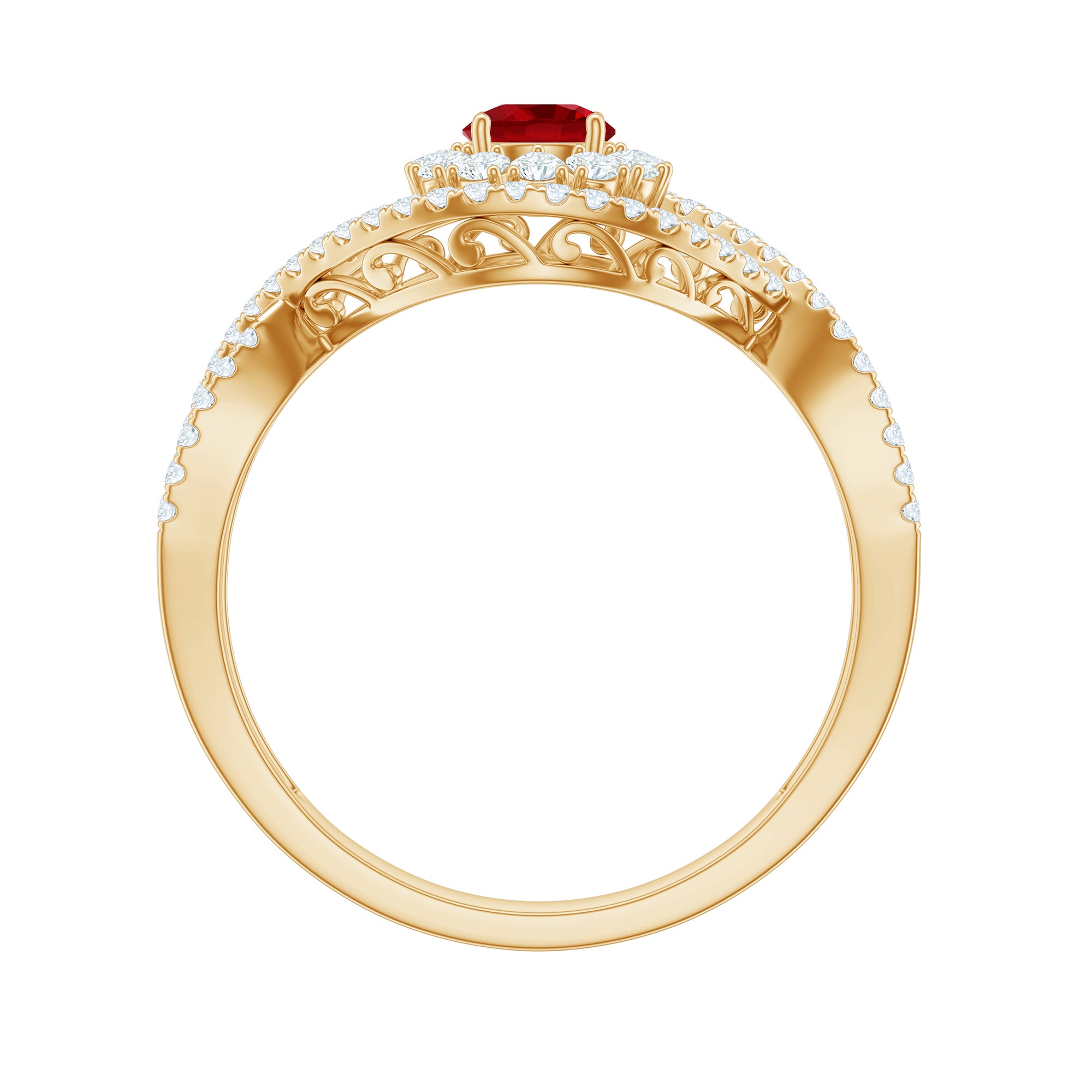 Two paths, one promise, that is the feeling this beautiful Ruby and Diamond Engagement Ring brings to life. Designed to feel both romantic and timeless, it is the kind of piece that tells a story every time you look at it. At the center is a glowing 4 MM round cut lab created ruby, held securely in prong setting. Surrounding the center stone is a halo of sparkling diamonds, adding just the right amount of brilliance to highlight the ruby without stealing its spotlight. What makes this Ruby and Diamond Ring even more special is the crossover shank design, two bands that gently twist together like two lives coming together as one. The band is finished with more round diamonds along the twist, giving the Crossover Ring extra sparkle from every angle. Made for someone who loves elegant styles with a modern twist, this Criss Cross Engagement Ring is full of charm and grace. Every detail, from the contrasting stones to the crossover band, is crafted with care and quality. It is beautiful, meaningful, and easy to wear every day, ready to become part of your love story, today and always.