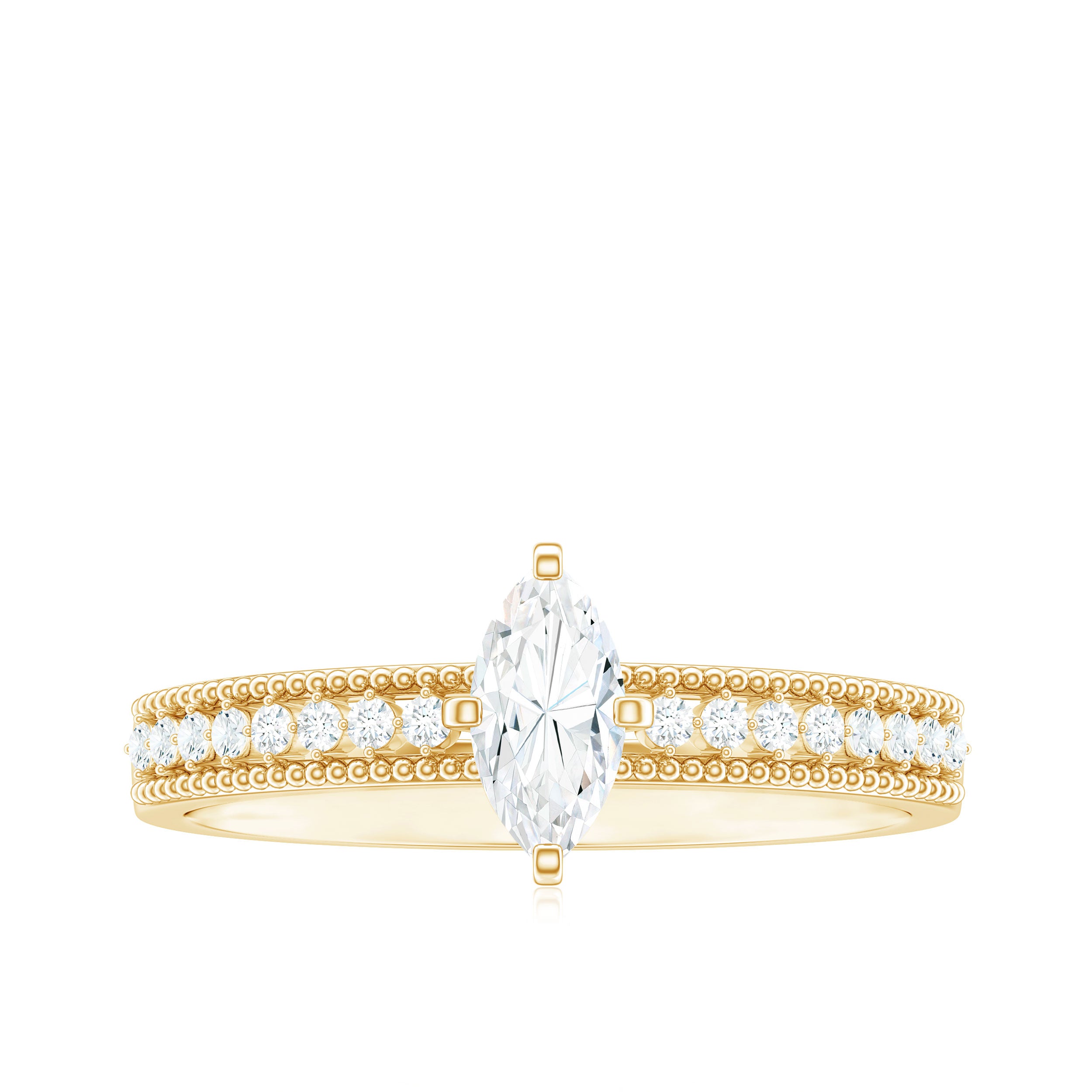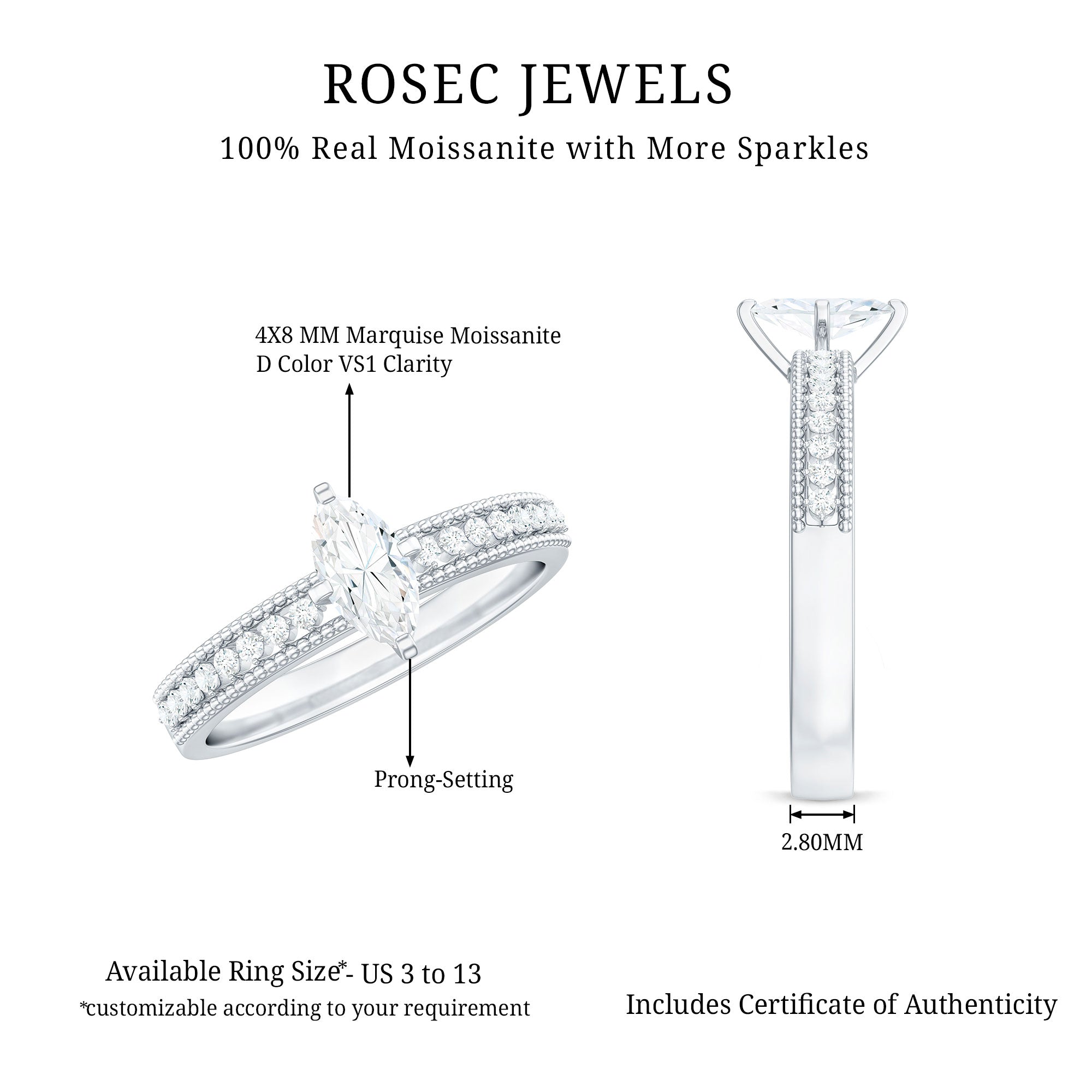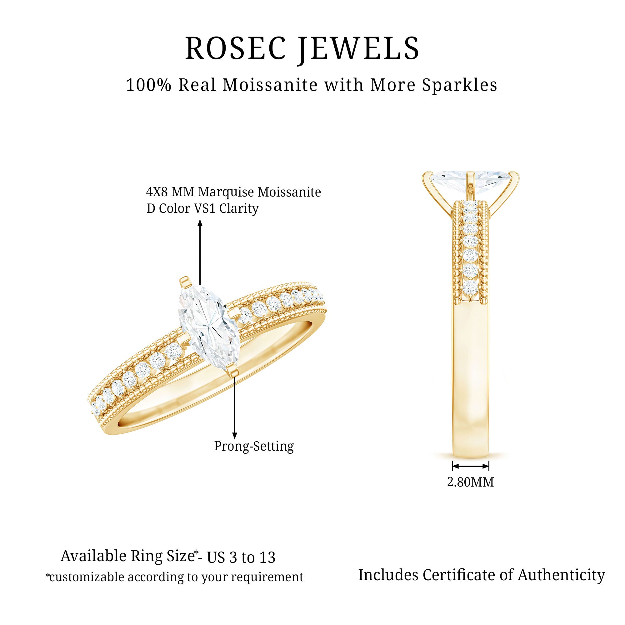 Unveil your love story with this captivating marquise moissanite engagement ring. Designed for the bride who finds beauty in heritage and elegance in the details, this exquisite piece blends vintage allure with modern craftsmanship. At the heart of this Vintage Style Engagement Ring sits a dazzling 4X8 MM marquise cut Moissanite, expertly faceted to capture light from every angle. The center stone radiates brilliance, symbolizing clarity, strength, and a love that stands the test of time. More round shape Moissanites set as side stones with beaded style on the shank, offering a soft, vintage frame that enhances the stone’s natural sparkle while evoking old-world charm. What truly sets this Marquise Engagement Ring apart is its distinctive band. Adorned with delicate beaded accents along the edges, the band feels both artistic and heirloom-worthy. This Moissanite Ring is a perfect blend of classic and contemporary design. Whether it marks a proposal or a personal milestone, it is a meaningful keepsake crafted to be treasured for generations. Rosec Jewels ensures that people will turn heads with our sparkling jewelry pieces, authentically certified for your peace of mind.