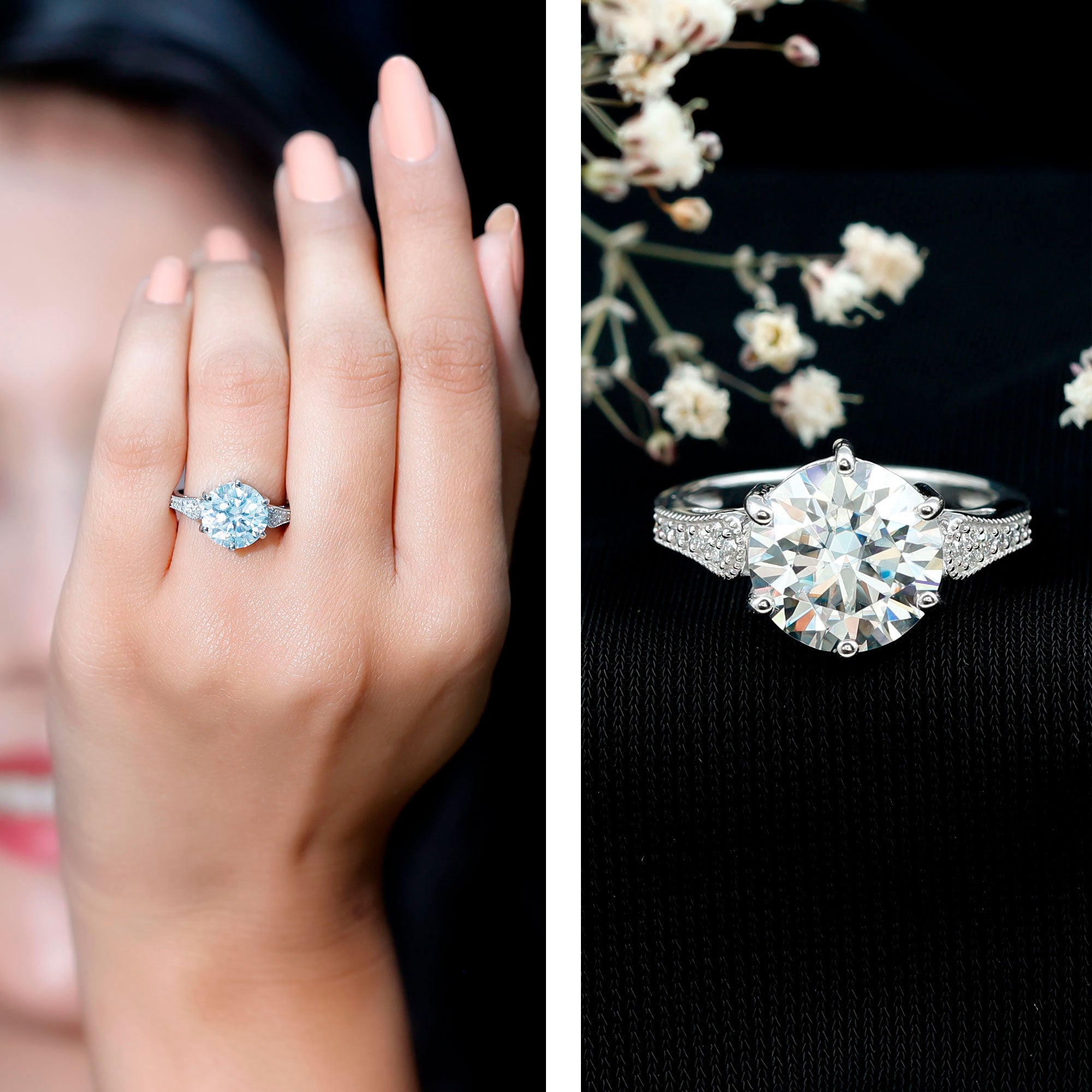 Get her this Moissanite Engagement Ring and witness a priceless reaction of her. The ring features a 10 MM Round Shape Moissanite securely placed in Prong Setting handcrafted with 14K White Gold Plated Silver. The shank of the ring is decorated with petite moissanite with beaded embellishments. This Statement Ring reflects the classic shine of D-VS1 Quality Moissanite that makes with perfect dazzler for the occasion. This Big Engagement Ring is an eternal statement of love that will make your lady feel loved. This Engagement Ring elevates the overall look and makes her the center of attraction.