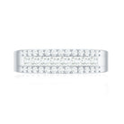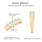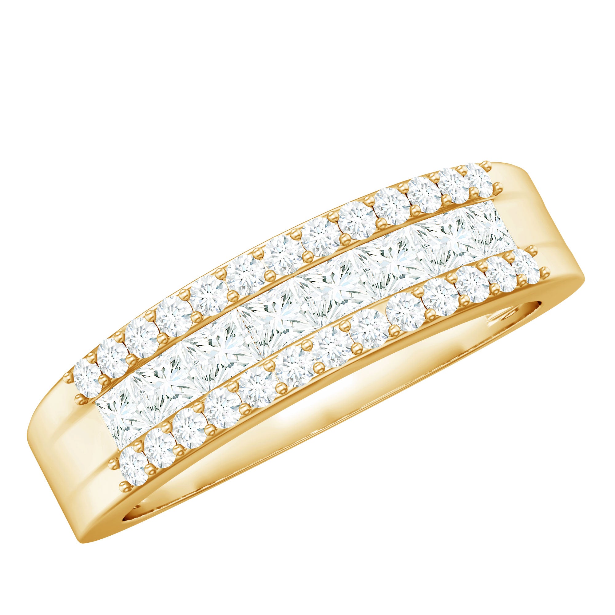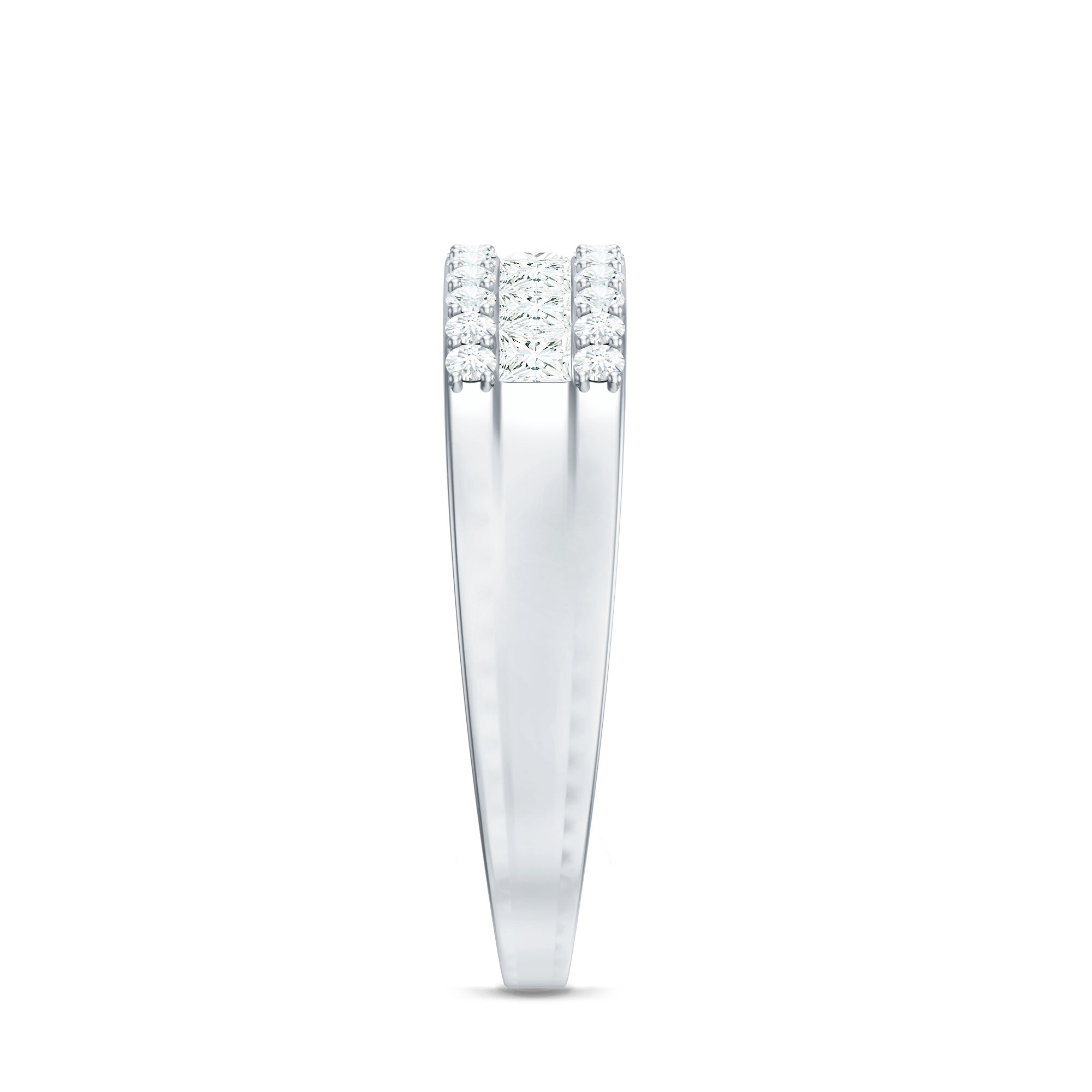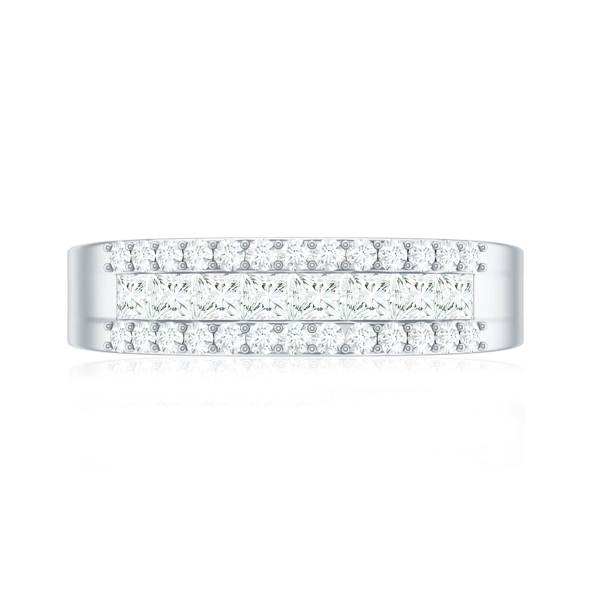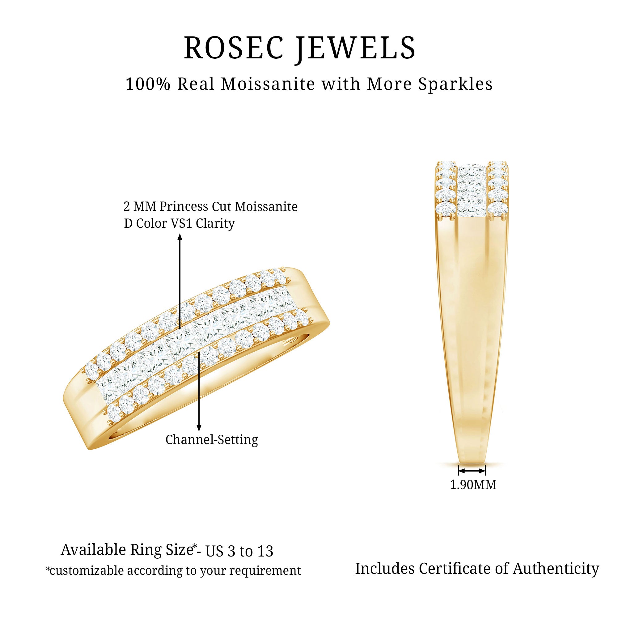This exquisite Moissanite Wedding Band is a sophisticated representation of love and elegance, ideal for men who want simple but stunning jewelry pieces. Designed to blend classic elegance with striking brilliance, this Moissanite Mens Wedding Band showcases a mesmerizing combination of shapes and shine. At the heart of the design is a sleek line of princess cut moissanite stones set in channel setting, bordered on either side by round cut moissanites. The Half Eternity Wedding Band presents a stunning sparkle. The beautiful trio of rows in this Manly Band makes it a bold yet comfortable accessory. Each moissanite in this band boasts D color and VS1 clarity, providing remarkable brilliance while serving as an ethical, high-quality substitute for traditional diamonds. Whether worn as a wedding band, an anniversary present, or a token of personal achievements, it is crafted to endure the test of time, both in aesthetics and significance. The half eternity design ensures all-day comfort without compromising on style, making it perfect for everyday wear or special events. Its striking appearance, combined with intricate detailing, makes this Three Row Wedding Band a remarkable addition to any jewelry collection.