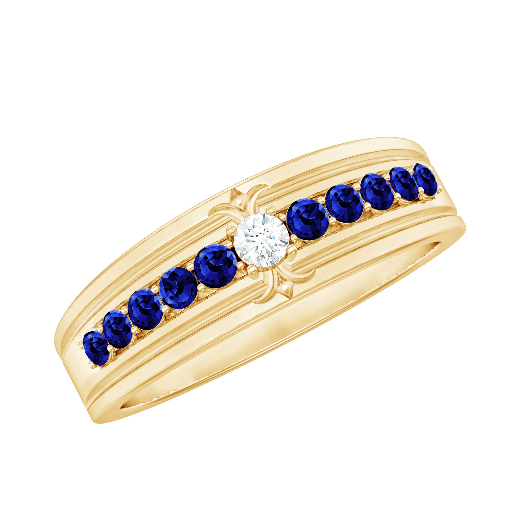 This Wide Band Ring is a tribute to detail, artistry, and luminous beauty. Designed with a unique, striking pattern, it showcases round cut moissanite stone set at the center surrounded with Lab created blue sapphire stones on both sides in a repeating loop design that encircles the finger in a half eternity style. Each AAAA quality lab created blue sapphire with D-VS1 quality moissanite is meticulously prong set to enhance brilliance, capturing light with every movement. The unbroken pattern signifies eternal love, making this Lab Created Blue Sapphire Band a perfect selection for weddings, anniversaries, or significant celebrations. This is not merely a standard eternity band; it is intended for individuals who value thoughtful design and seek something a bit more distinctive. Whether worn alone or in combination with other jewelry pieces, this Wedding Anniversary Band contributes charm and elegance to any ensemble. Its broad band guarantees a comfortable fit while making a striking style statement. The craftsmanship is apparent in every aspect, from the polished finish to the secure setting of each stone. This Anniversary Band Ring merges vintage charm with contemporary brilliance, ideal for those who appreciate jewelry that narrates a story and feels exceptional each time it is worn.