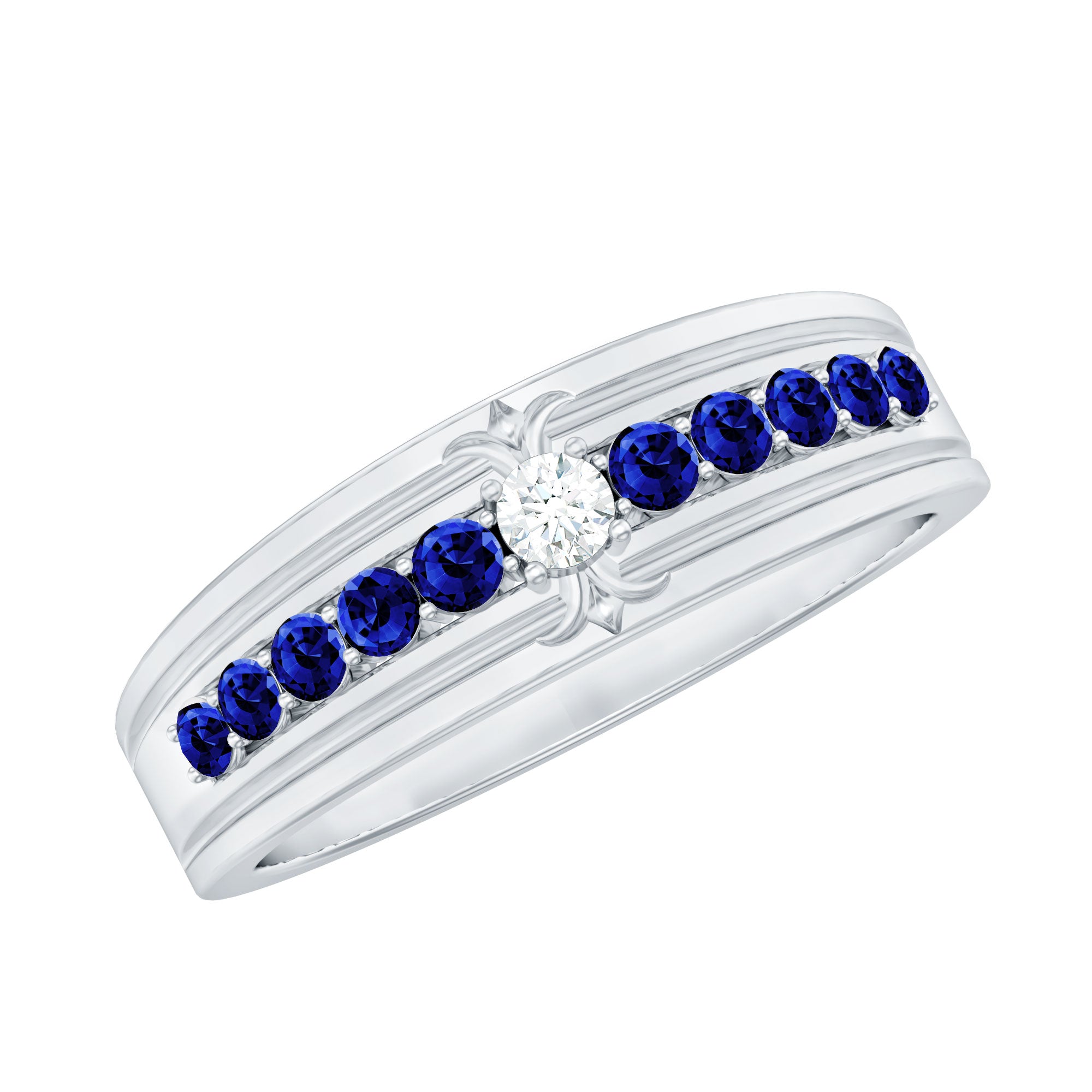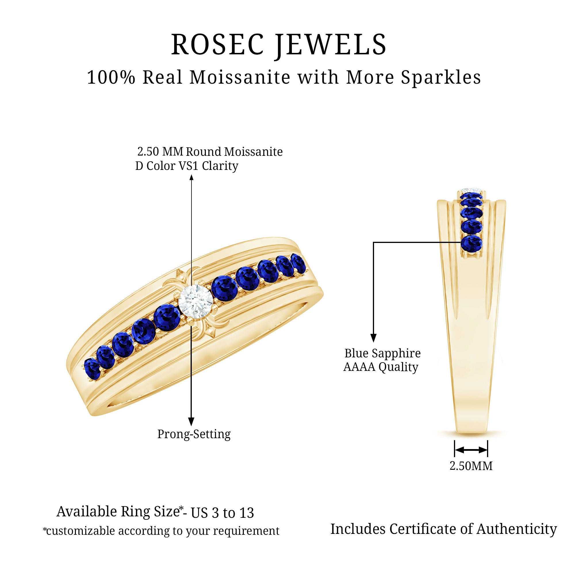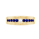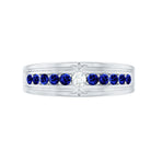 This Wide Band Ring is a tribute to detail, artistry, and luminous beauty. Designed with a unique, striking pattern, it showcases round cut moissanite stone set at the center surrounded with Lab created blue sapphire stones on both sides in a repeating loop design that encircles the finger in a half eternity style. Each AAAA quality lab created blue sapphire with D-VS1 quality moissanite is meticulously prong set to enhance brilliance, capturing light with every movement. The unbroken pattern signifies eternal love, making this Lab Created Blue Sapphire Band a perfect selection for weddings, anniversaries, or significant celebrations. This is not merely a standard eternity band; it is intended for individuals who value thoughtful design and seek something a bit more distinctive. Whether worn alone or in combination with other jewelry pieces, this Wedding Anniversary Band contributes charm and elegance to any ensemble. Its broad band guarantees a comfortable fit while making a striking style statement. The craftsmanship is apparent in every aspect, from the polished finish to the secure setting of each stone. This Anniversary Band Ring merges vintage charm with contemporary brilliance, ideal for those who appreciate jewelry that narrates a story and feels exceptional each time it is worn.