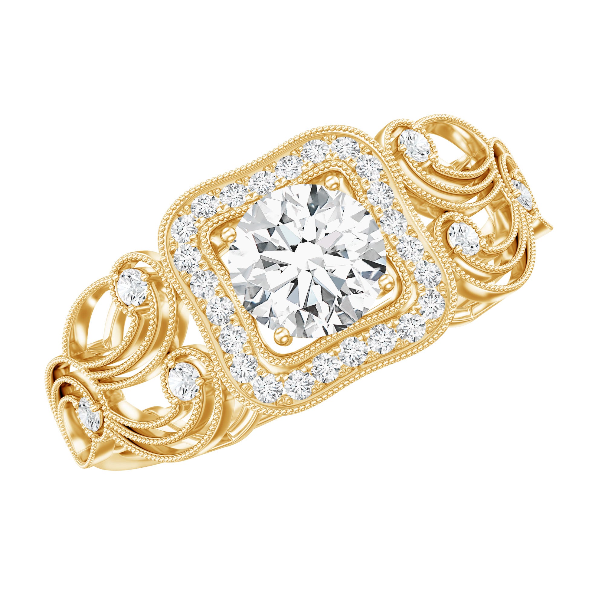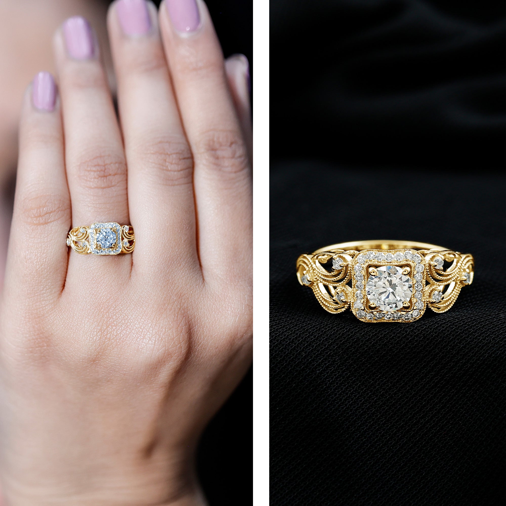 Step into timeless elegance with this intricately crafted Vintage Moissanite Engagement Ring, designed to capture the romance and charm of a bygone era. At the heart of this exquisite piece is a 5 MM round cut moissanite, expertly prong set to allow maximum light play and brilliance. Known for its fiery sparkle and exceptional durability, the D-VS1 Quality Moissanite offers a breathtaking alternative to natural diamond, perfect for the modern bride with vintage tastes. Surrounding the center stone is a delicate halo of smaller moissanites, beautifully arranged to amplify its glow and add a luxurious dimension. Intricate beadwork lines the halo, adding texture and a soft antique touch. The band of this Antique Looking Engagement Ring is a true showstopper, adorned with ornate filigree patterns that gracefully wrap around the finger. Set with additional moissanites and beaded detailing, the band adds depth and storytelling to the design, reminiscent of heirloom rings passed down through generations. Inspired by the sophistication of Art Deco design, this Halo Engagement Ring blends old-world craftsmanship with contemporary ethics. Presented in a signature box, it is ready to mark one of life’s most unforgettable moments.