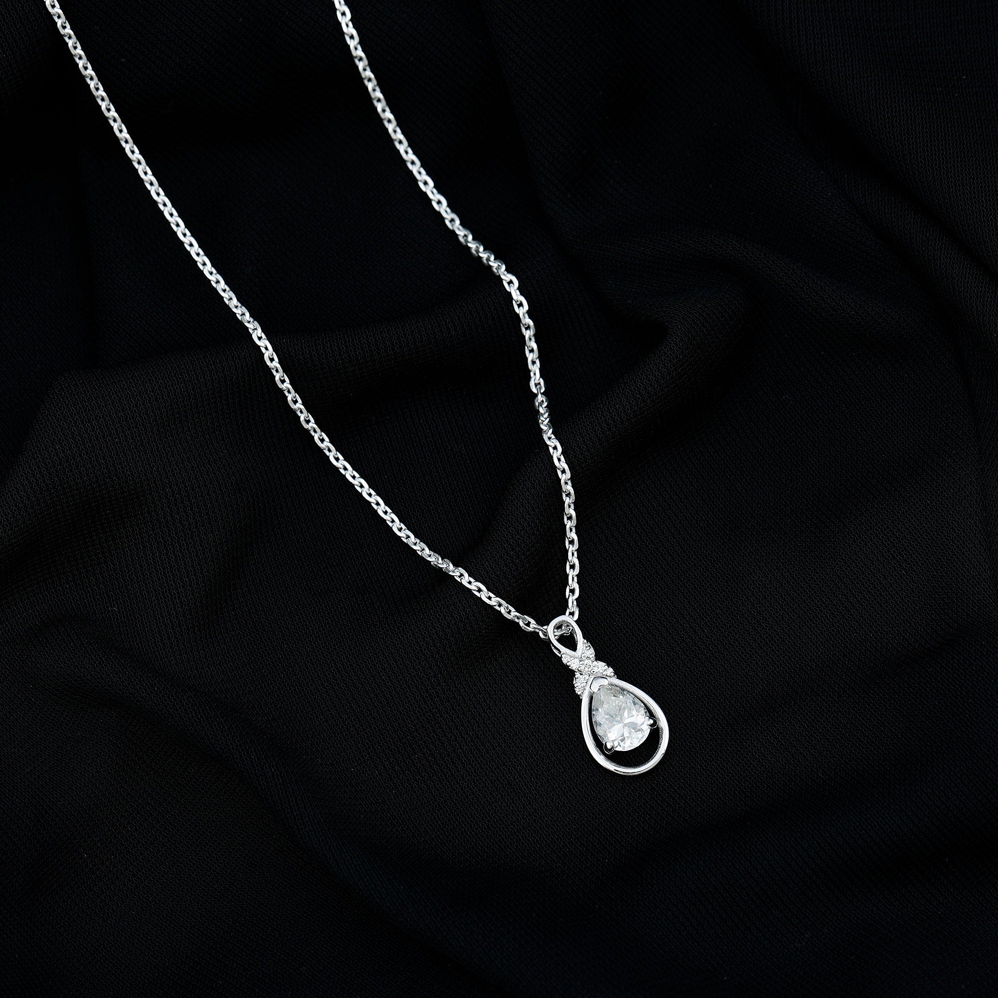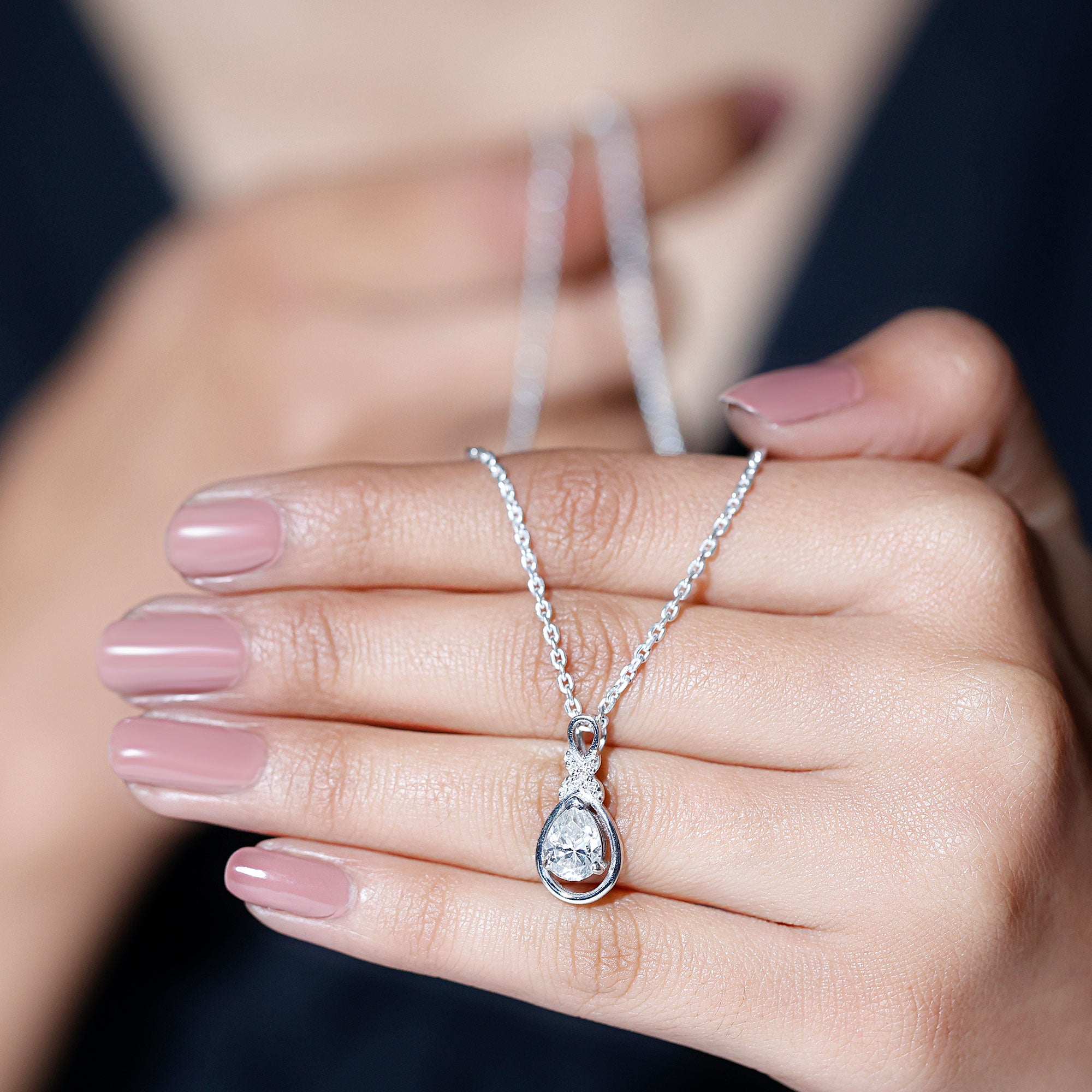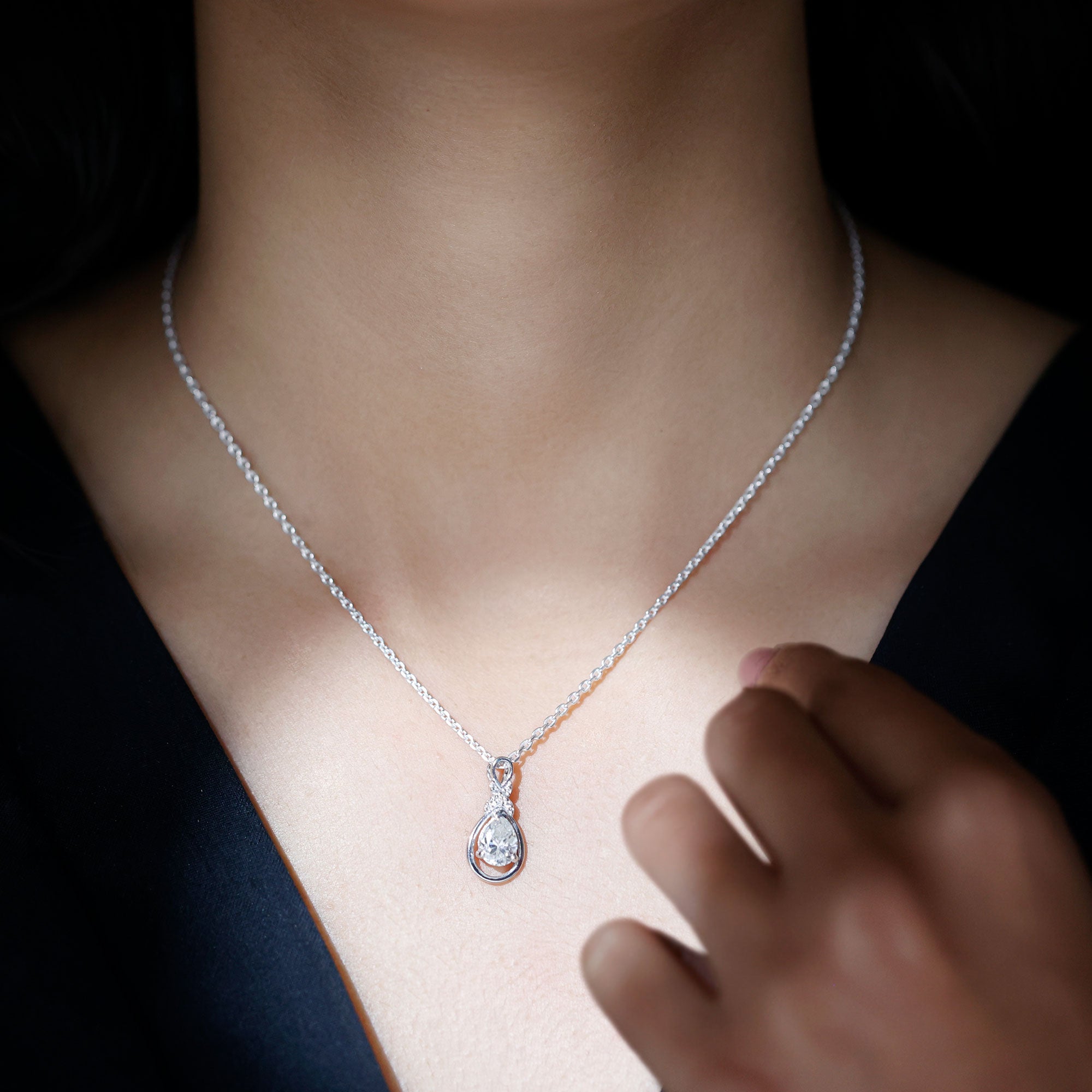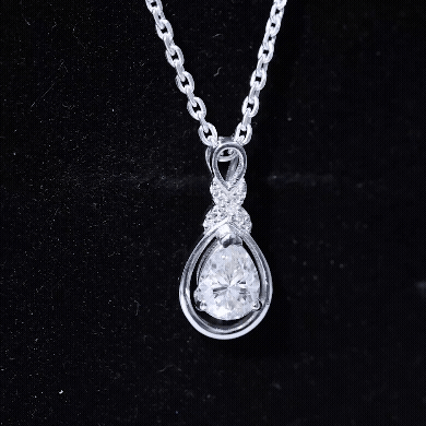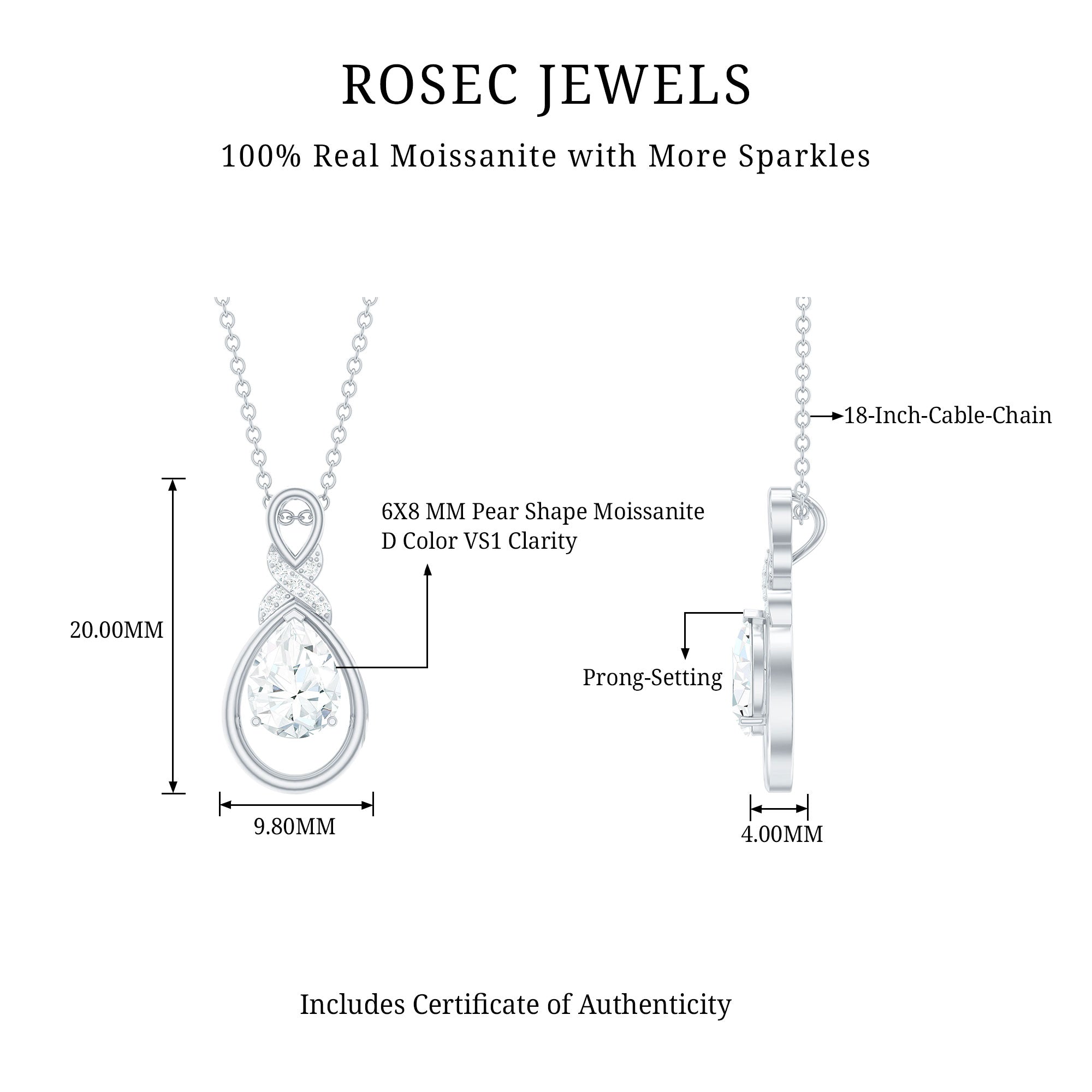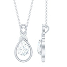 This shimmering Moissanite Drop Necklace is a sparkling treat and a stunning tribute to the woman you adore. Its teardrop-shaped open frame cradles a 6X8 MM pear-shaped moissanite stone of D-VS1 Quality set in prong setting. The unique pattern at the top is decorated with round cut stones, giving the Teardrop Wedding Necklace a unique and shimmering look, perfect for any bride-to-be. This Moissanite Pendant suspends along a chain, making it a ready-to-wear jewelry piece. It also makes an ideal anniversary or birthday gift, perfect for celebrating the love and connection you share, and comes with a Certificate of Authenticity, ensuring exceptional craftsmanship and quality.