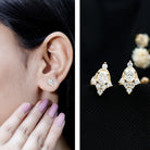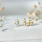 Designed to add a touch of timeless charm and brilliant sparkle to your everyday look, these Moissanite Stud Earrings feature a stunning combination of shapes and brilliance. Curated in 14k yellow gold plated silver, this pair brings together traditional craftsmanship with modern-day sophistication. At the center of each earring is a beautifully faceted 3X4 MM oval cut moissanite, secured in prong setting. The upper part of the centerpiece has a graceful arrangement of round cut moissanites, creating a crown-like design that feels both royal and refined. The Oval Moissanite Earrings are finished with screw back posts, a thoughtful detail that ensures comfort and extra security for all-day wear. Whether you are stepping into a wedding, an anniversary dinner, or just want to add a little glow to your everyday, these Sterling Silver Moissanite Earrings are made to sparkle with you every step of the way. Crafted with care and set with D-VS1 quality moissanites, known for their brilliance and fire, these earrings offer the luxury of diamonds with an ethical and budget-friendly twist.