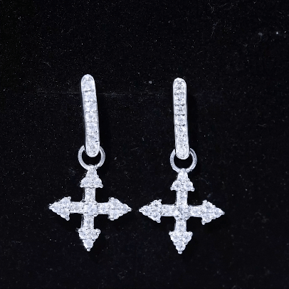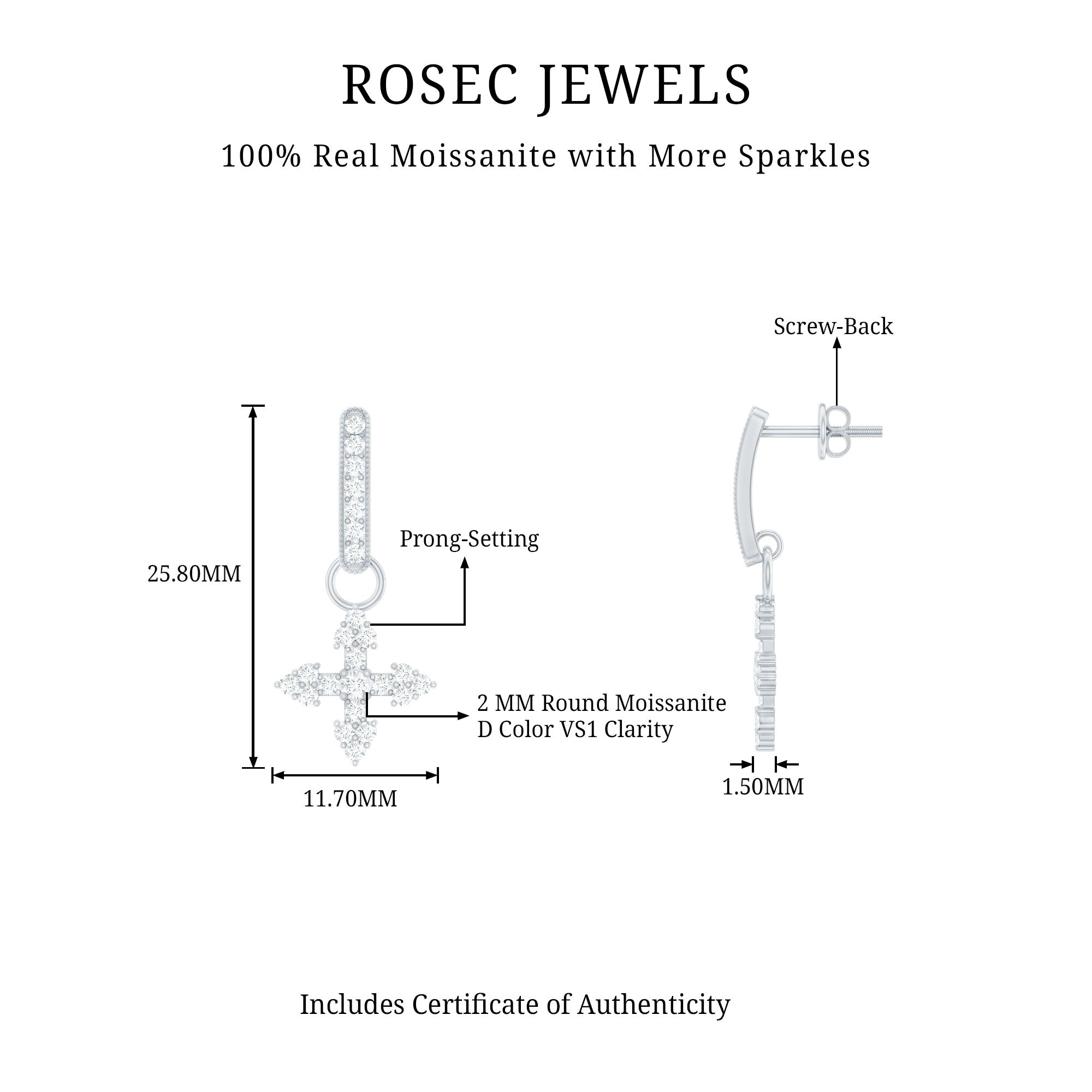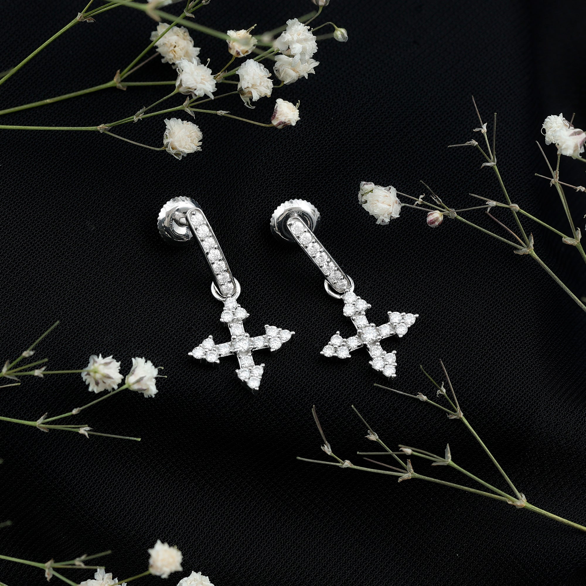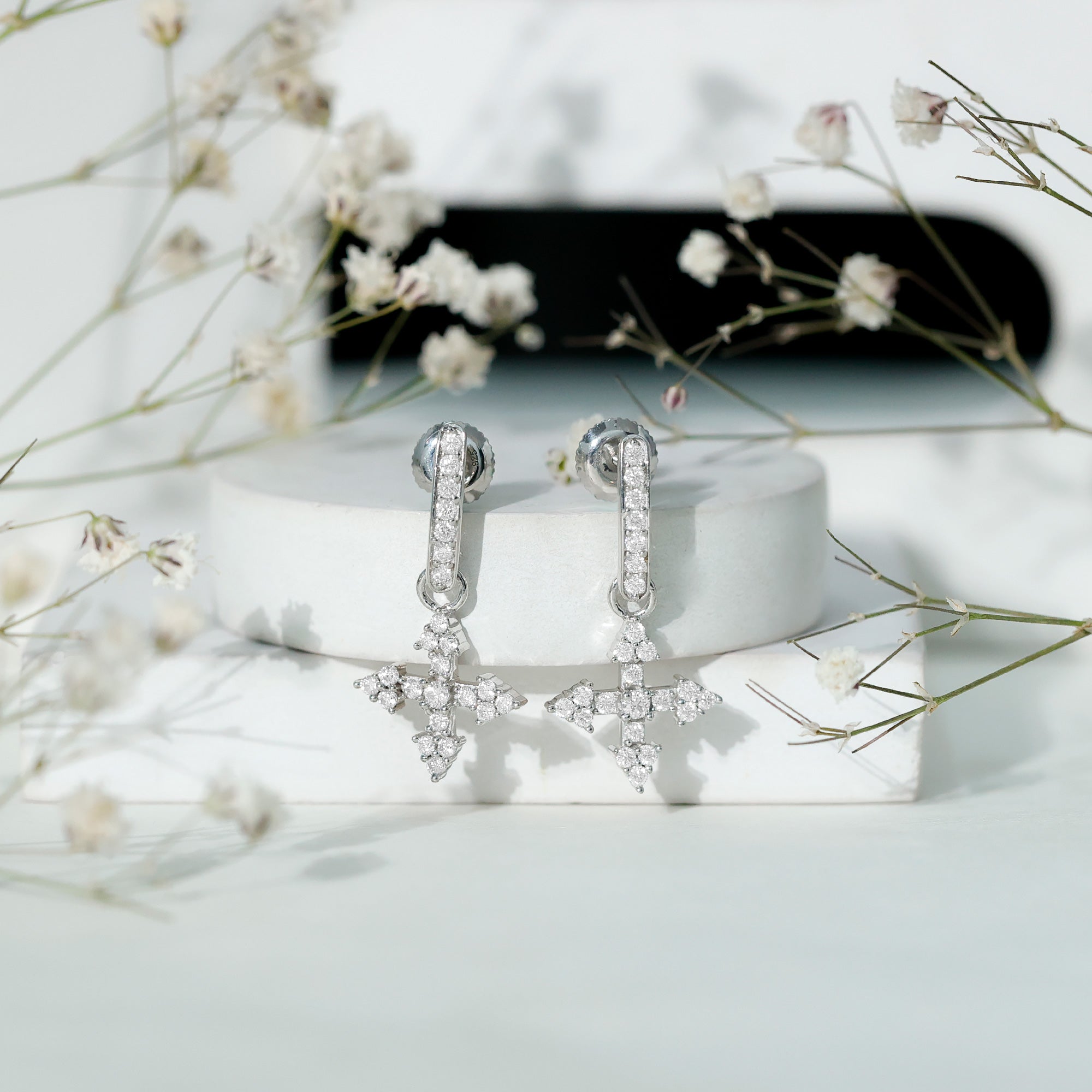Make your belief and faith part of your jewelry with these Moissanite Cross Earrings, especially crafted to adorn your look. These earrings feature a Cross frame embedded with smaller Pave Set Moissanite of D-VS1 Quality. These Drop Earrings dangle with a studded curved metallic bar that adds an extra layer of elegance and grace. These Faith Earrings will be perfect to be styled on Christmas or easter. Also, these minimalist earrings can be presented as a gift to your special one to celebrate their faith and belief.